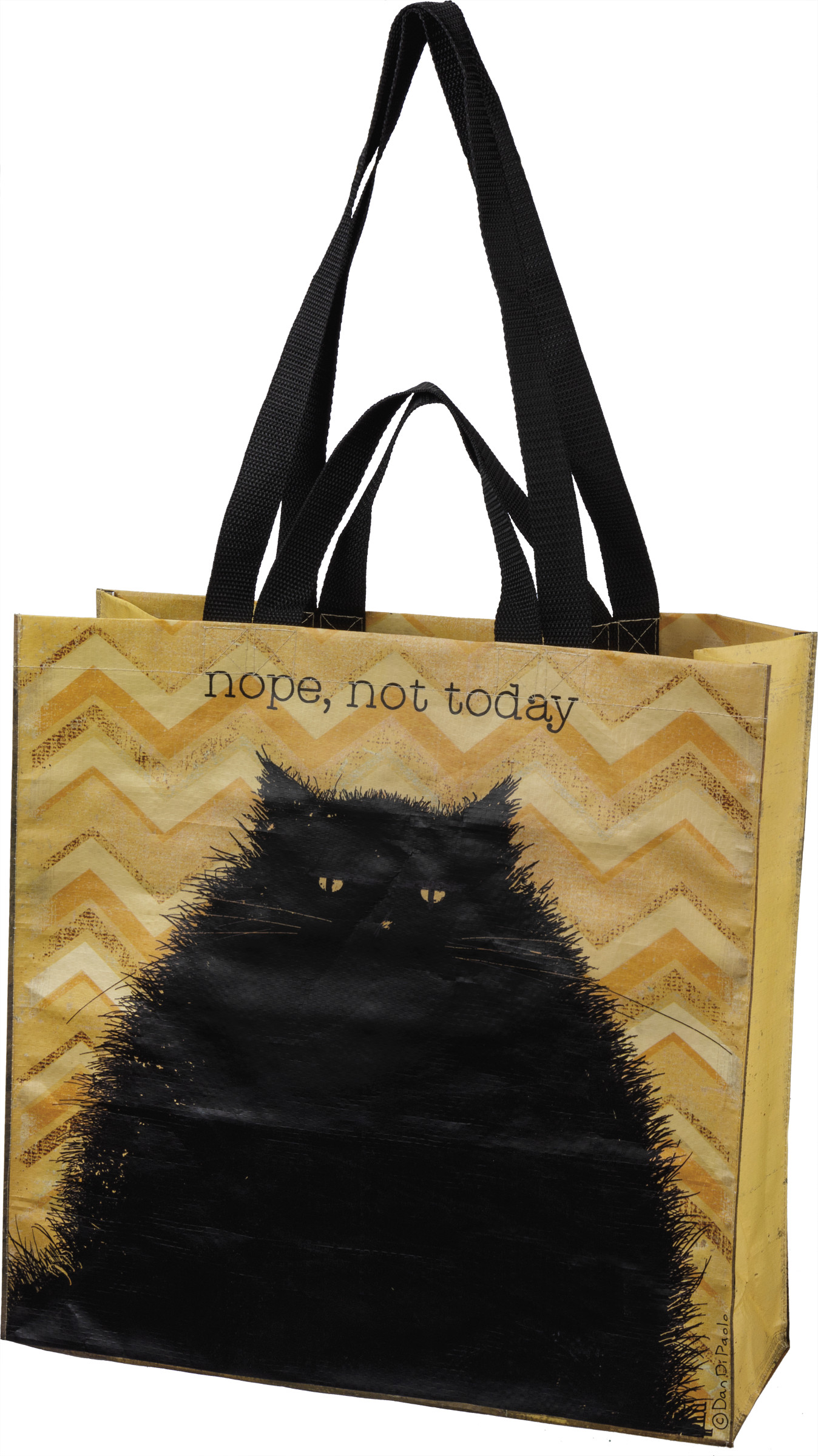 A rustic-inspired market tote bag featuring double-sided "Nope, Not Today / I Do What I Want" sentiments with smug fluffy cat designs. Contains dual shoulder and hand straps with interior pocket; made from post-consumer materials. Complements well with coordinating pieces in collection for a sassy pet display.