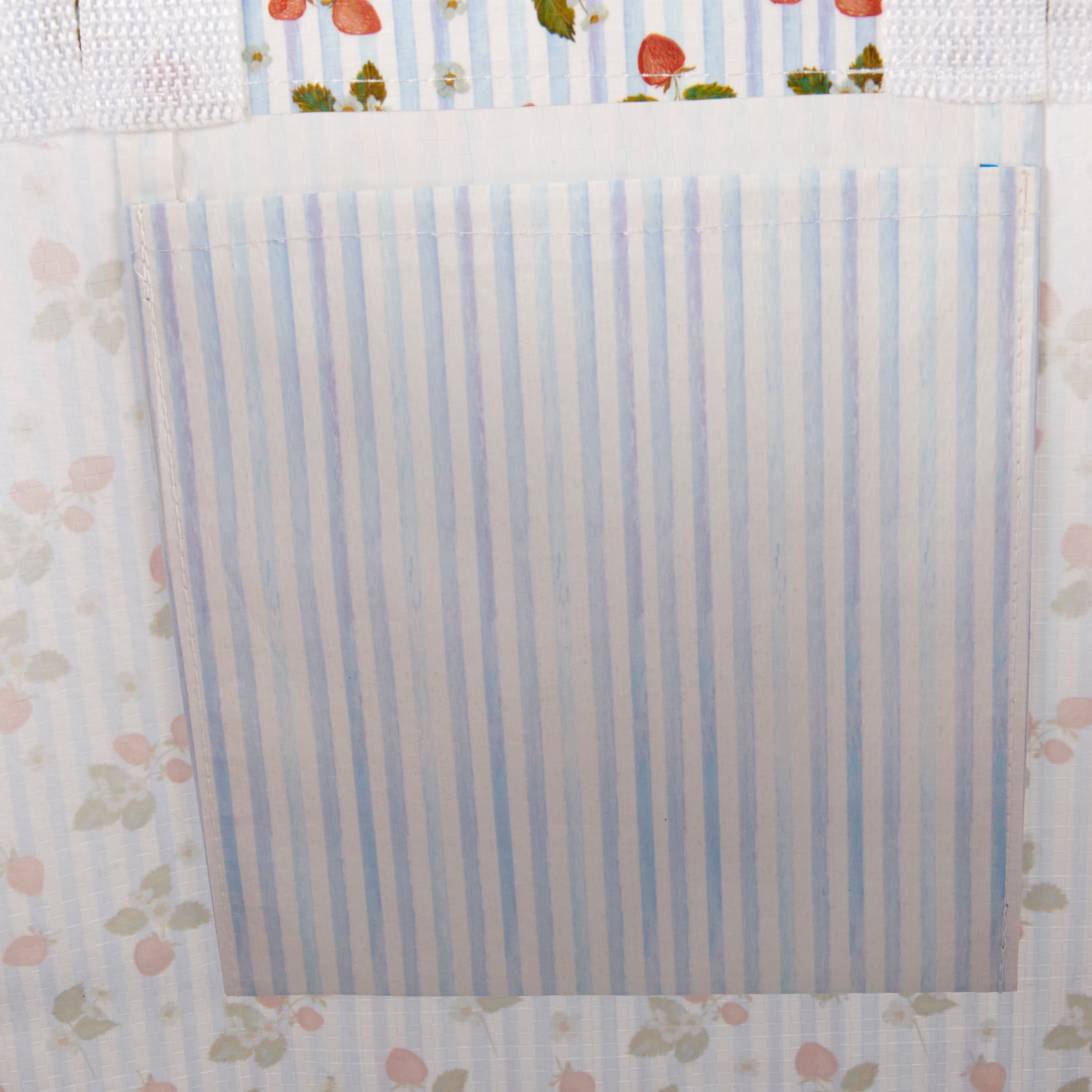 A double-sided market tote from our Garden Collection displaying an all-over design of wild strawberries on a light blue stripe background. Side gussets display coordinating red color. Designs are replicated from original art hand painted in a unique watercolor style. Market tote includes both hand and shoulder straps in white nylon and a convenient inside pocket with light blue stripes. Our Strawberry market tote bag is made from eco-friendly post-consumer material and folds flat for easy storage. A charming strawberry-themed accessory perfect for shopping or traveling.
