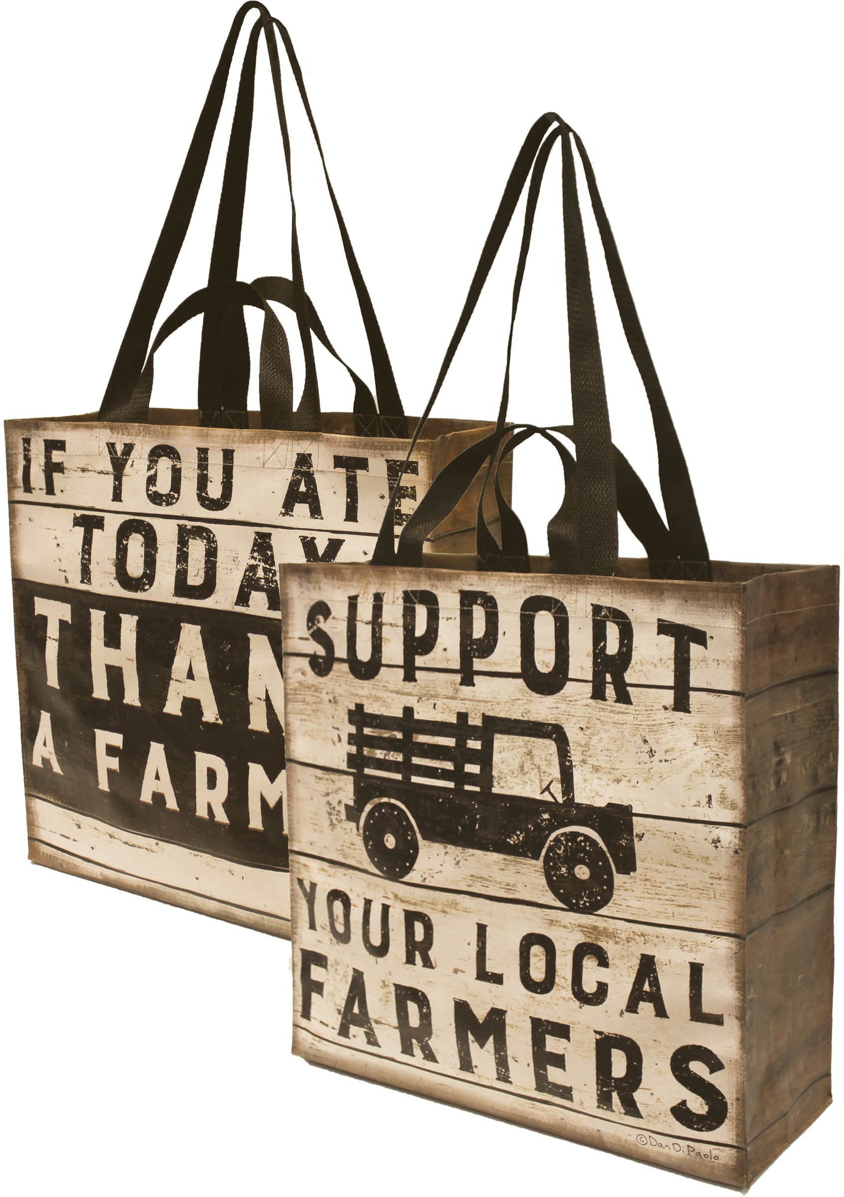 A rustic market tote bag made from 95% post-consumer material lending double-sided, distressed "Support Your Local Farmers / If You Ate Today Thank A Farmer" sentiments with truck design. Contains interior pocket and dual hand and shoulder nylon straps.