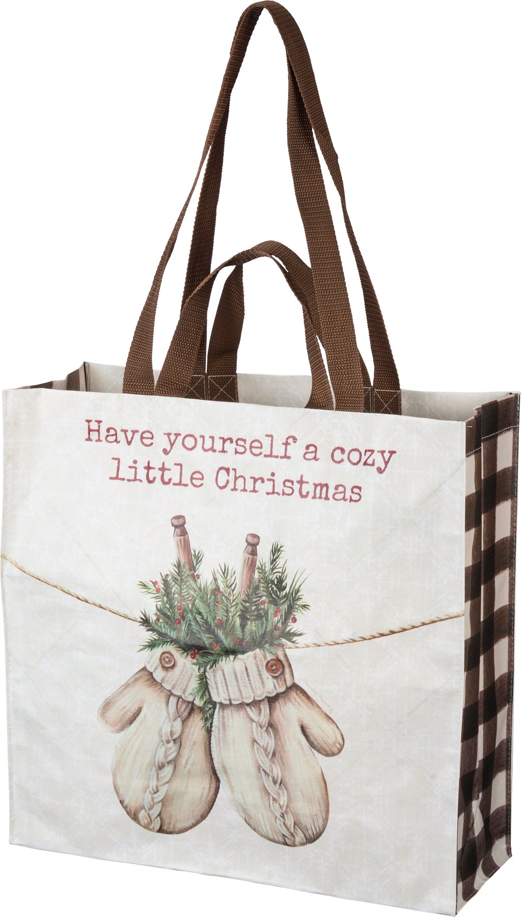 A double-sided market tote bag from our Christmas Collection featuring a "Warmest Holiday Wishes" sentiment with scarf bow and wreath designs, reverse "Have Yourself A Cozy Little Christmas" sentiment with mittens and bristled branch designs, and gingham print panels. Complements well with coordinating styles for a cozy and cohesive collection. Our Warmest Holiday Wishes market tote bag contains interior pocket and dual shoulder and drop handles; made from post-consumer materials.