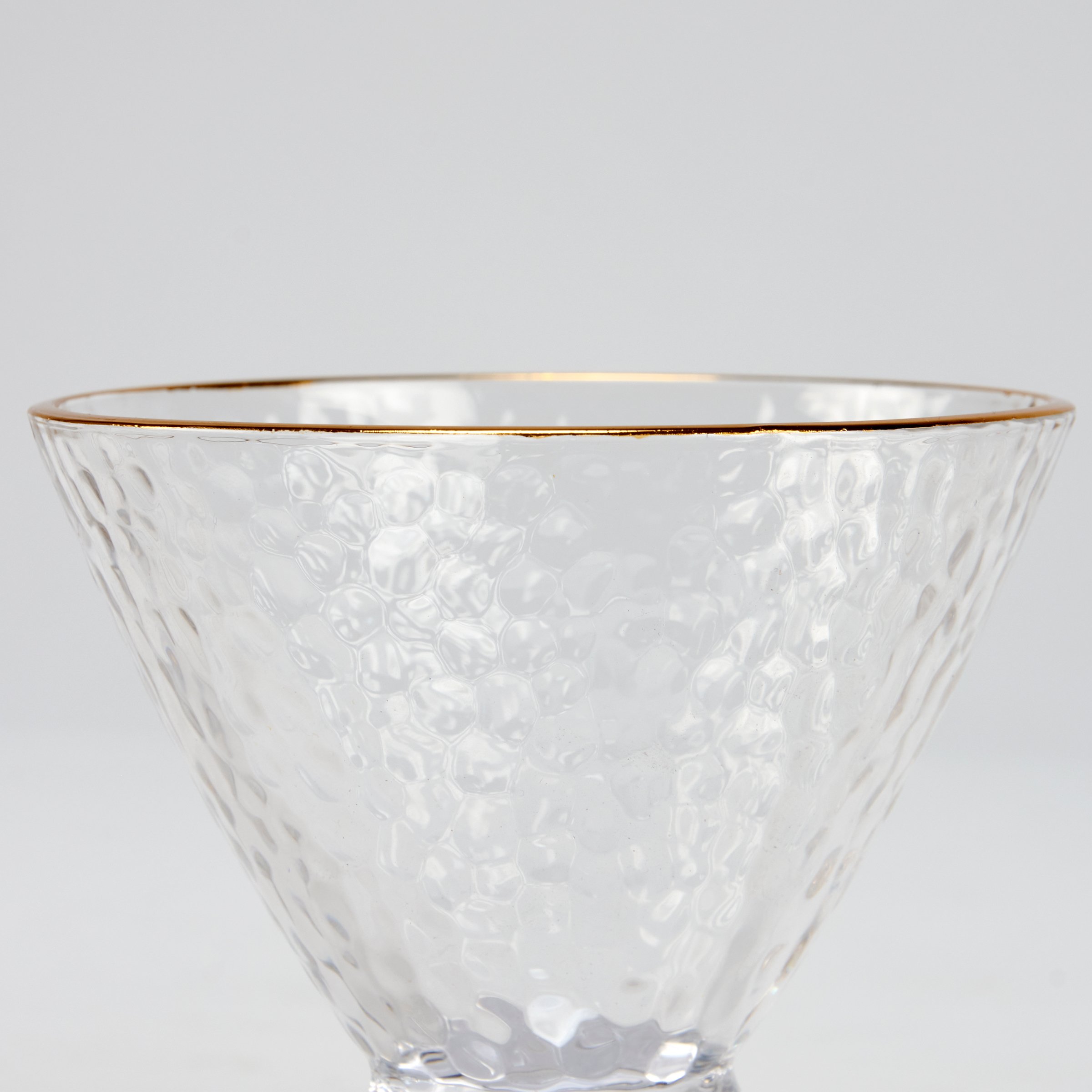 An 8 oz martini glass displaying an art deco inspired design with textured glass and metallic gold accent on the rim. Our small Gold Rim martini glass coordinates well with table décor from our Art Deco Collection. Hand wash only. A piece of vintage drinkware perfect for everyday gatherings.