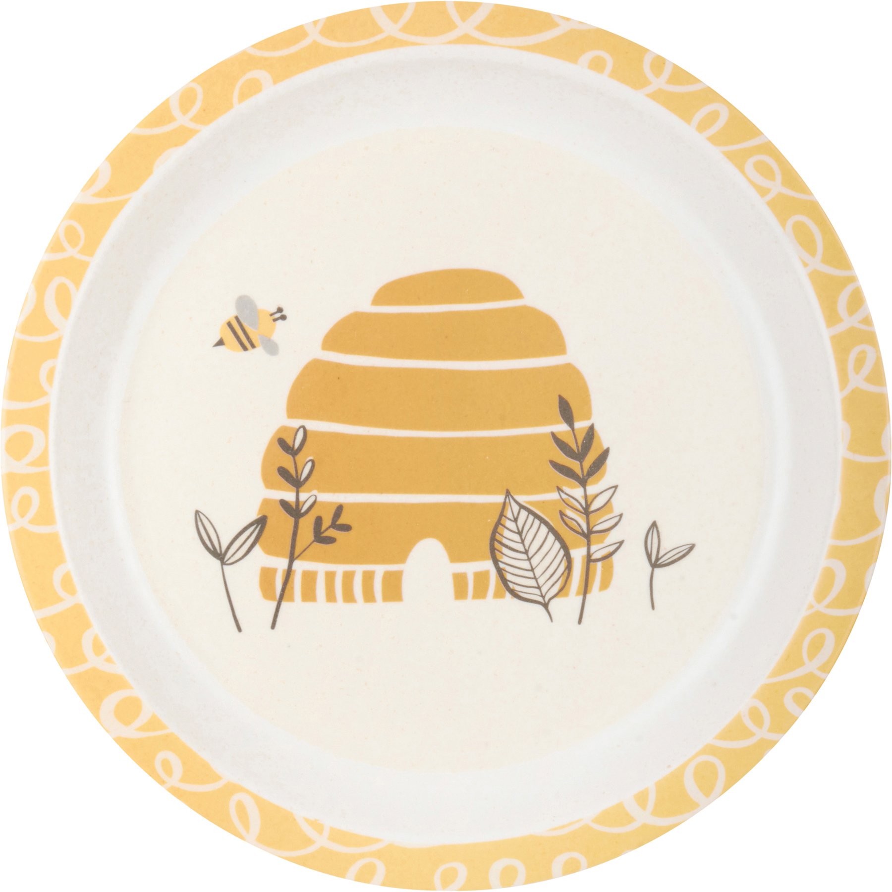A cohesive meal set featuring a dishwasher safe bowl, plate, cup, fork, and spoon with block print bee designs. Meal set is BPA-free, thoughtfully made with bamboo fibers, and packaged in a high-quality kraft paper box making it ready for easy gifting. Another adorable addition to our exclusive Happy + Bright Collection. Our Bee Skep meal set is not microwave safe.