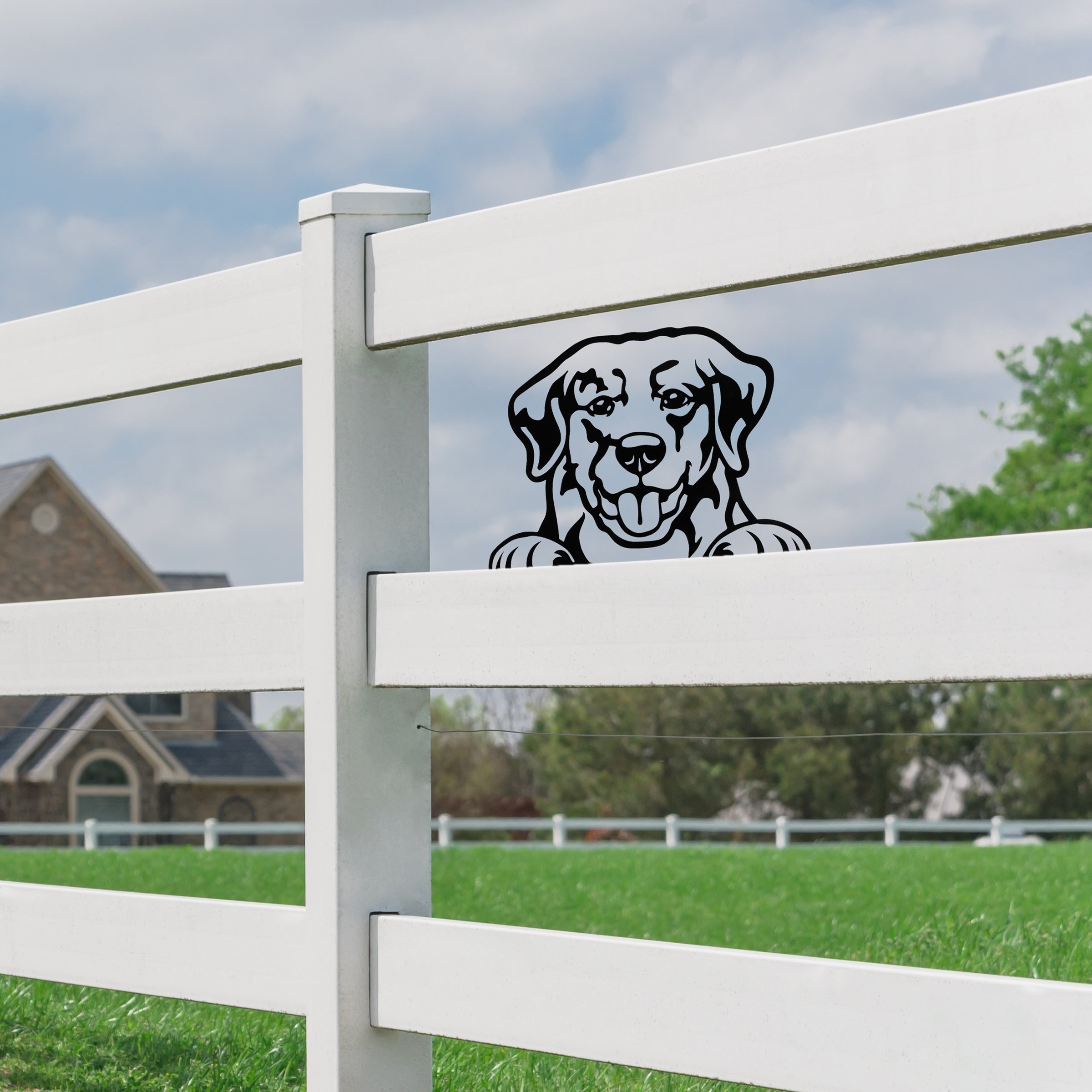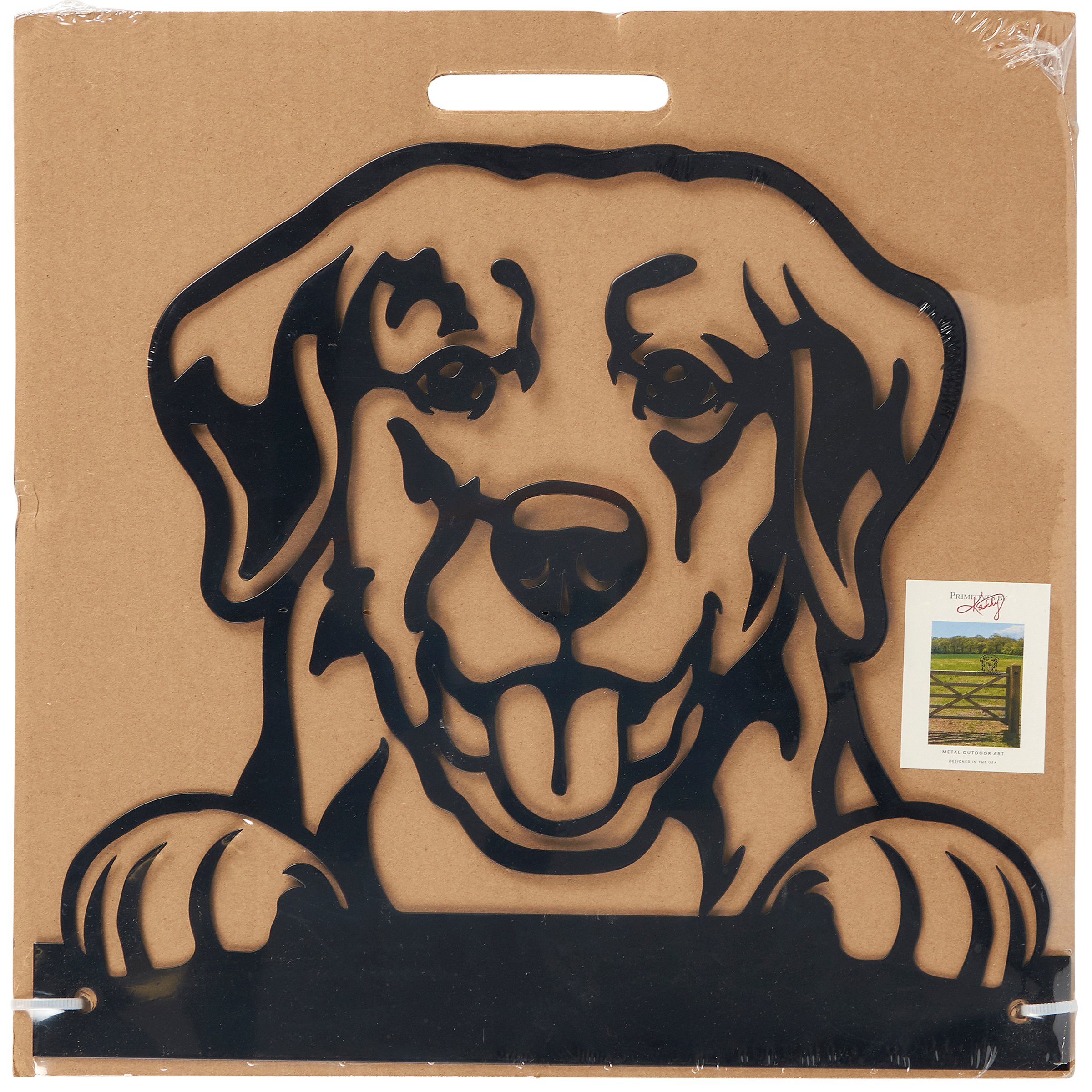 A durable metal décor piece from our Homestead Collection displaying a charming cutout design of a dog. Metal dog art is designed to be displayed outside attached to a fence or railing for a fun "peeking" appearance. Outdoor metal decor includes pre-drilled holes and mounting hardware to easily hang for display. Our outdoor metal dog decor is a fun farm-themed home accent that easily adds personality to a fence or porch.