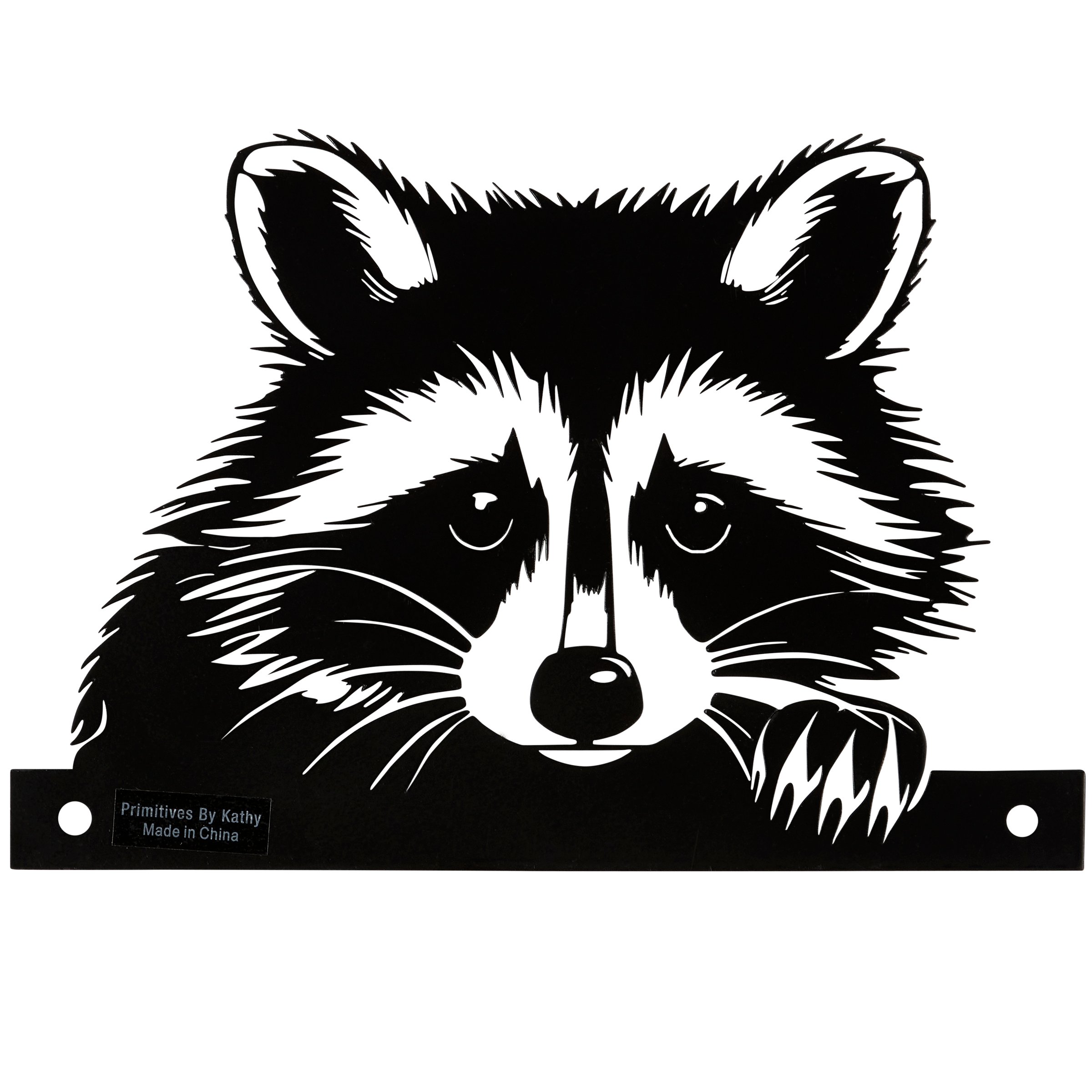 A durable metal décor piece from our Lake & Cabin Collection displaying a charming cutout design of a raccoon. Metal raccoon art is designed to be displayed outside attached to a fence or railing for a fun "peeking" appearance. Outdoor metal decor includes pre-drilled holes and mounting hardware to easily hang for display. Our outdoor metal raccoon decor is a fun nature-themed home accent that easily adds personality to a fence or cabin.
