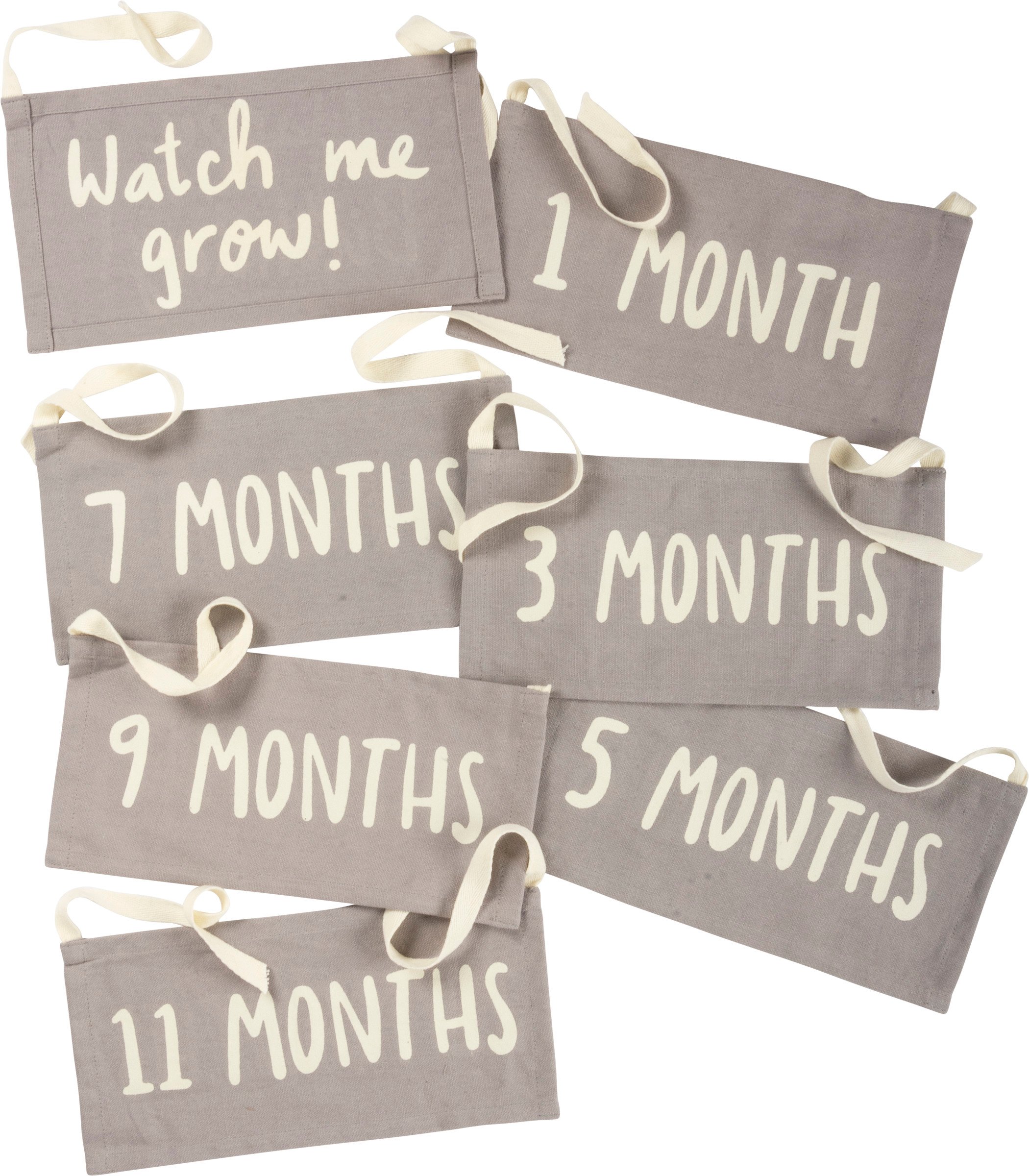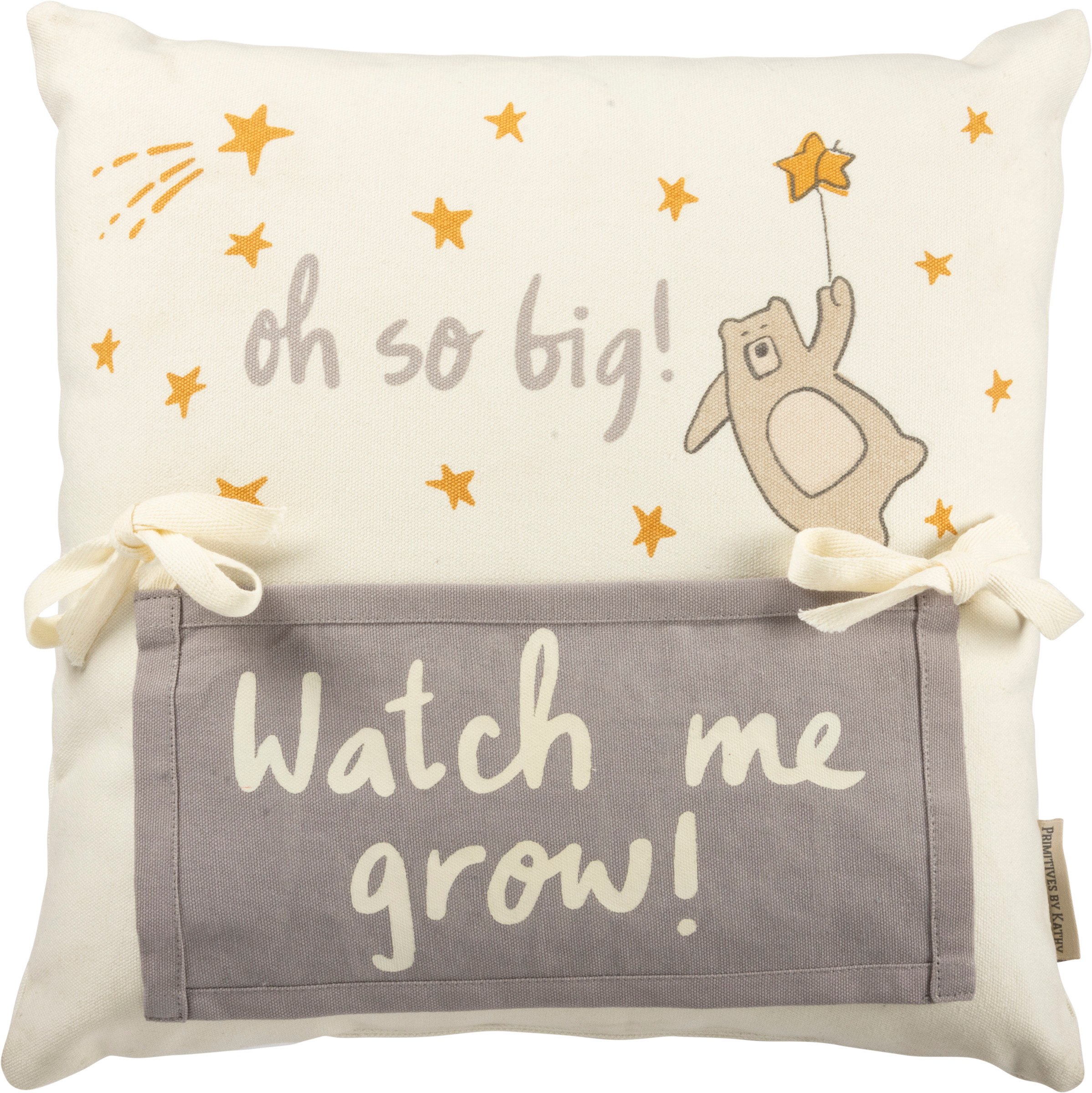 A cotton milestone pillow featuring an "Oh So Big!" sentiment, bear and star designs, and two tie closures for displaying milestone additions. Comes with 7 double-sided interchangeable panels to display a total of 14 designs, including 12 monthly panels. Panels come neatly stored in zipped back pocket. Polyester filling. Shipped vacuum-sealed for protection and storage. A part of our exclusive Happy + Bright Collection. Textiles are phthalate and AZO dye free.