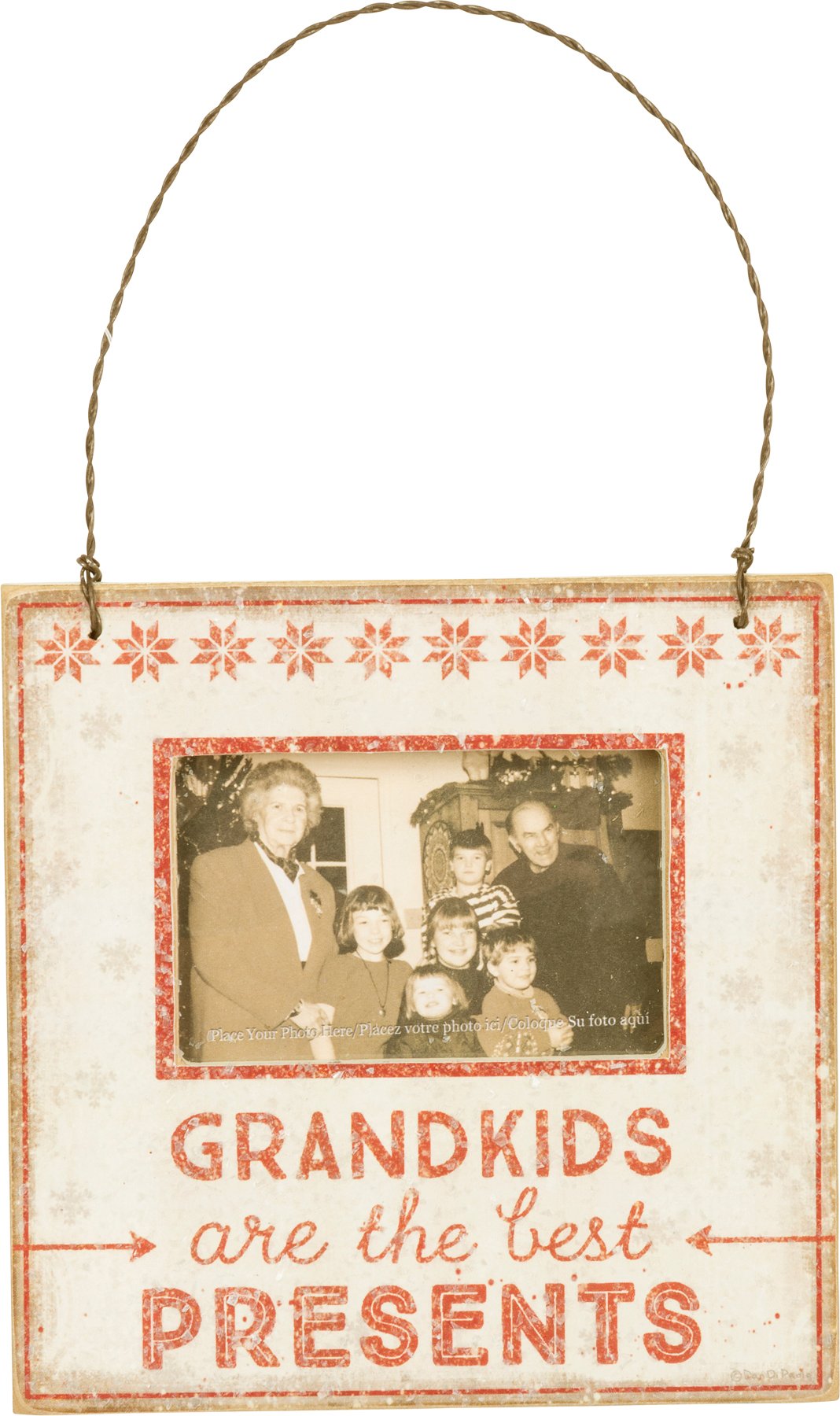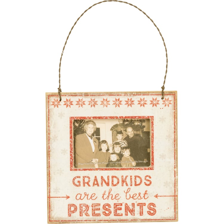 A rustic, Nordic-inspired wooden hanging mini picture frame lending "Grandkids Are The Best Presents" sentiment with arrow and snowflake designs. Contains a top twisted wire for easy hanging, magnet, peg, and easel. Fits a 3" x 2" photo and complements well with coordinating designs for a festive collection.