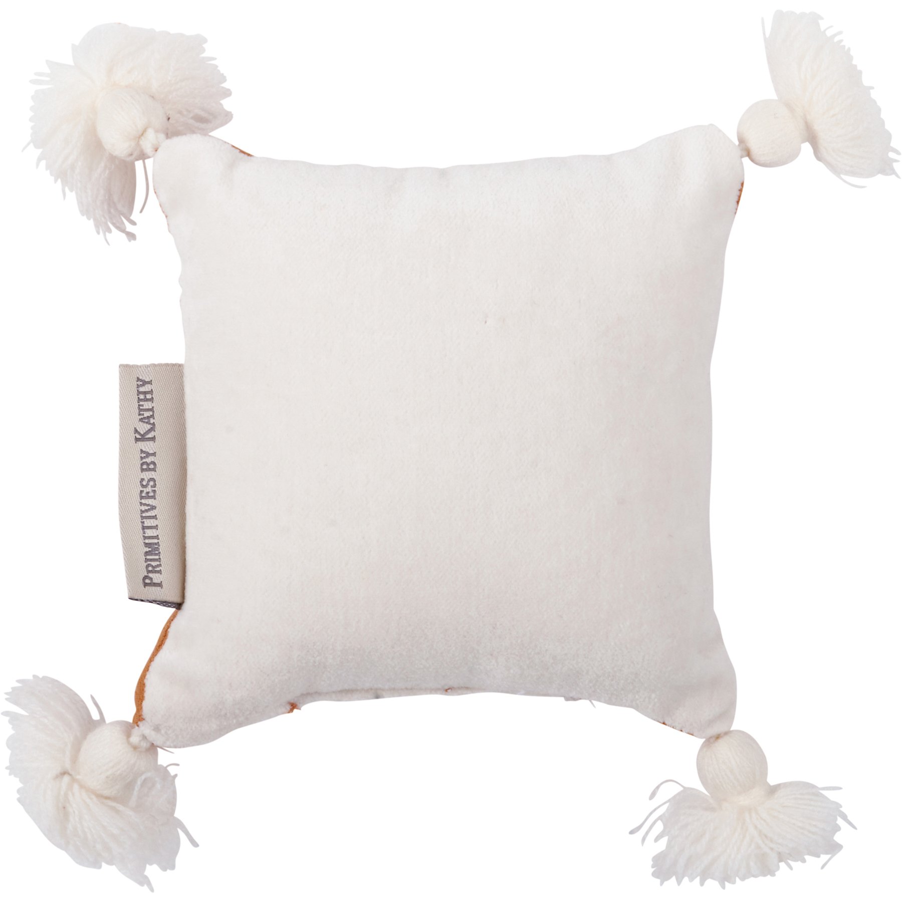 A mini pillow from our Fall & Harvest Collection displaying a bohemian inspired design with "Hello Fall" sentiment on autumn brown background. Our Hello Fall pillow features 1" poms on each corner and velvet back for added interest with polyester filling.