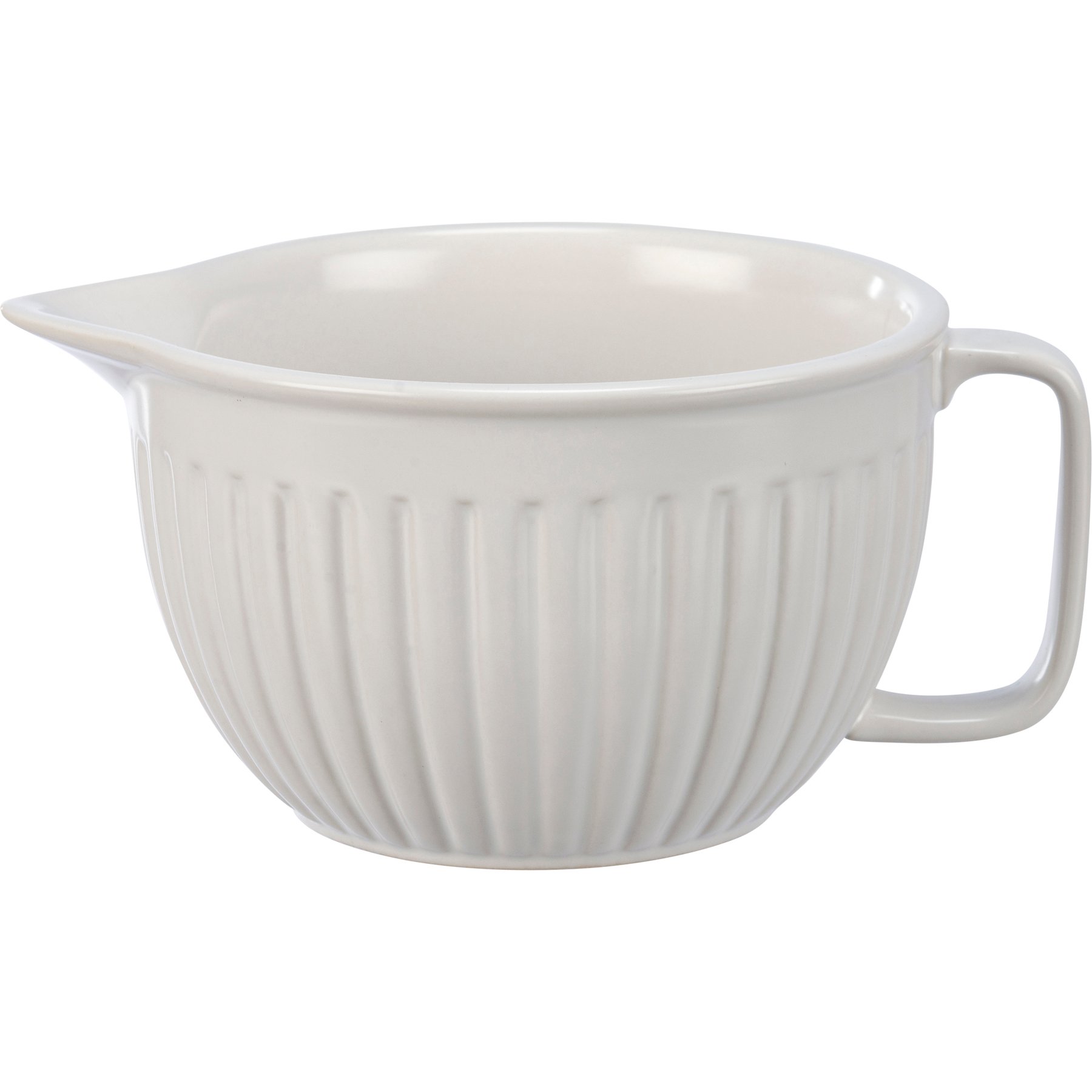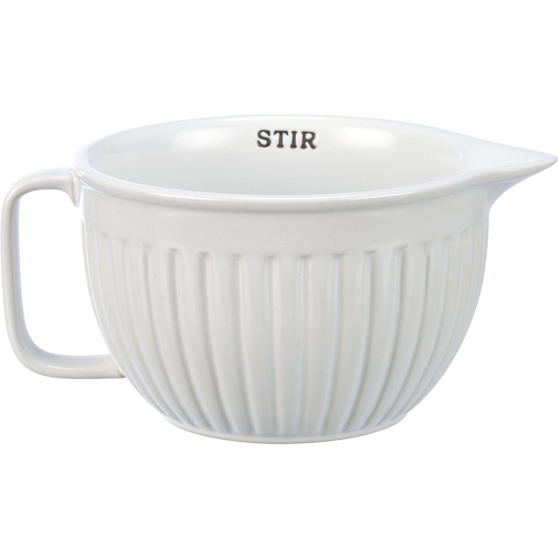 A stoneware batter bowl lending a debossed "Stir" sentiment. White bowl features ribbed texture and includes handle and spout for easy pouring. Sentiment displayed across inside rim of bowl in slate gray. Microwave, oven, dishwasher and food safe. This item makes a perfect addition to a farmhouse aesthetic and coordinates well with other pieces in collection!