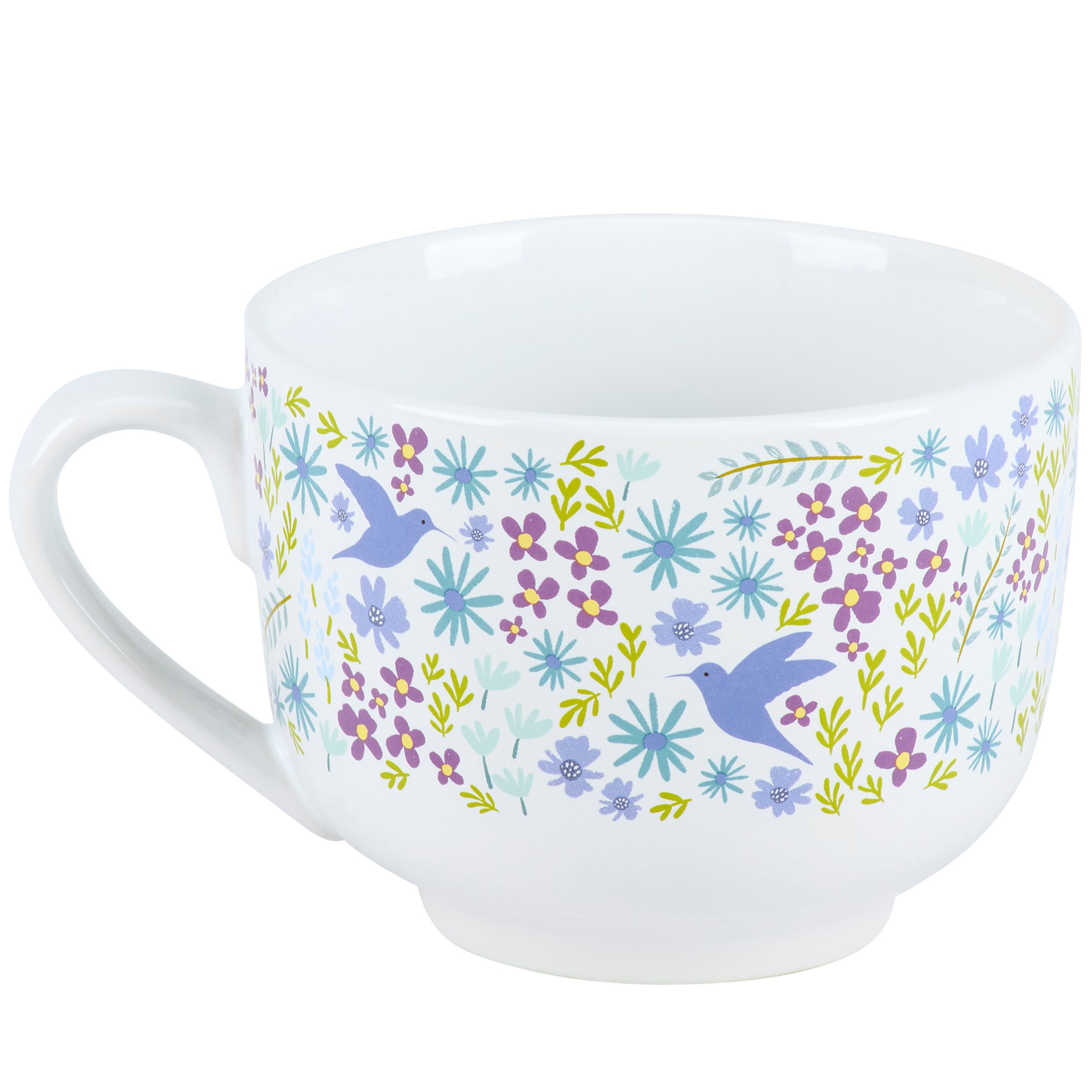 A stoneware 20 oz mug from our Inspiration & Blooms Collection displaying a full wrap-around design of vibrant hand illustrated florals and birds. Mug also features an inside design with inspirational sentiment along the rim that reads "A Cup Of Comfort" and bird with flowers at the bottom. Our A Cup Of Comfort mug is microwave, oven, dishwasher, and food safe for easy use. An inspirational gift perfect for everyday drinkware. 100% of the proceeds from the sale of this Benefit Item will be donated to Knowing You Matter, a non-profit raising suicide awareness and promoting emotional health and wellness in their community and beyond. Visit the Benefit Item Page on our website for more information.