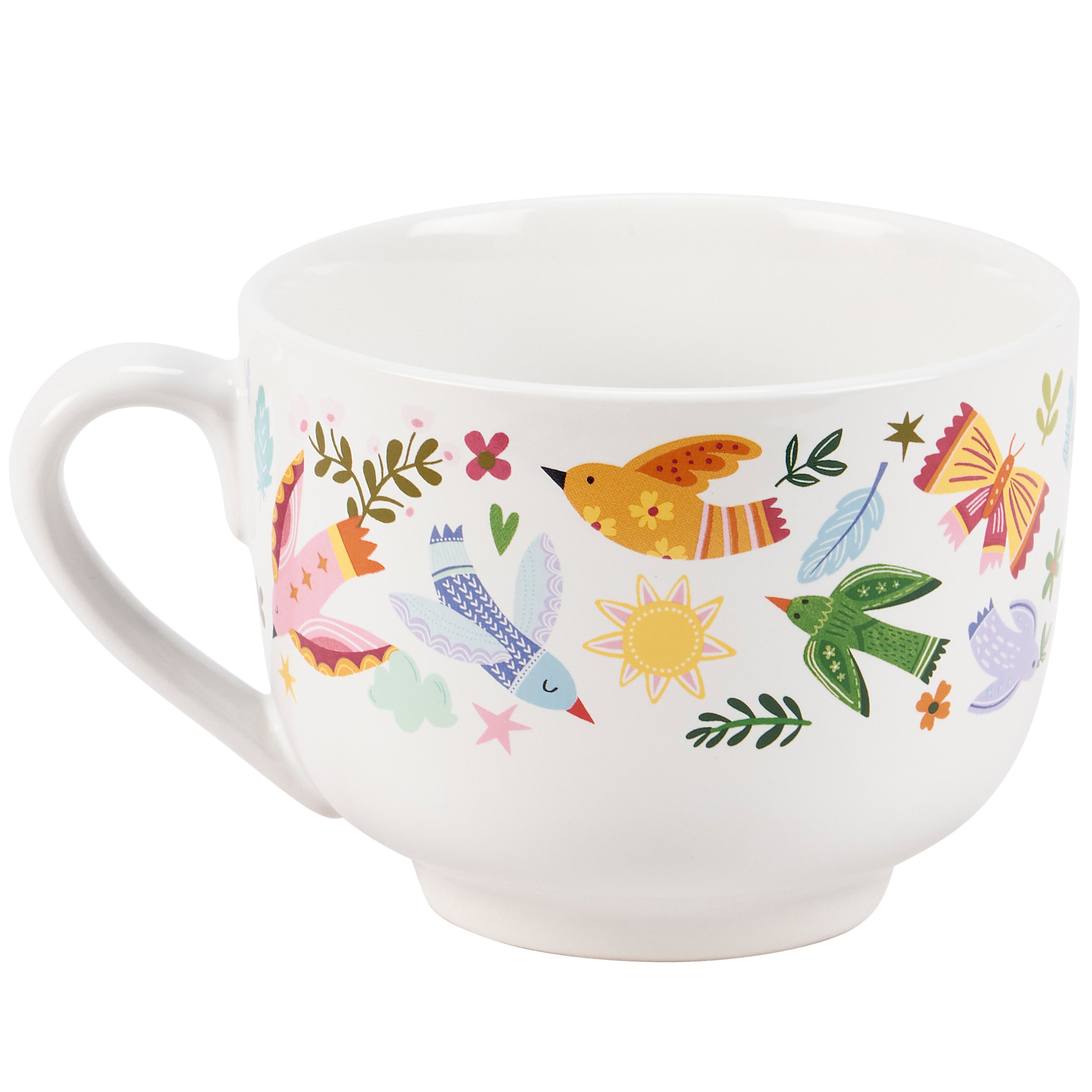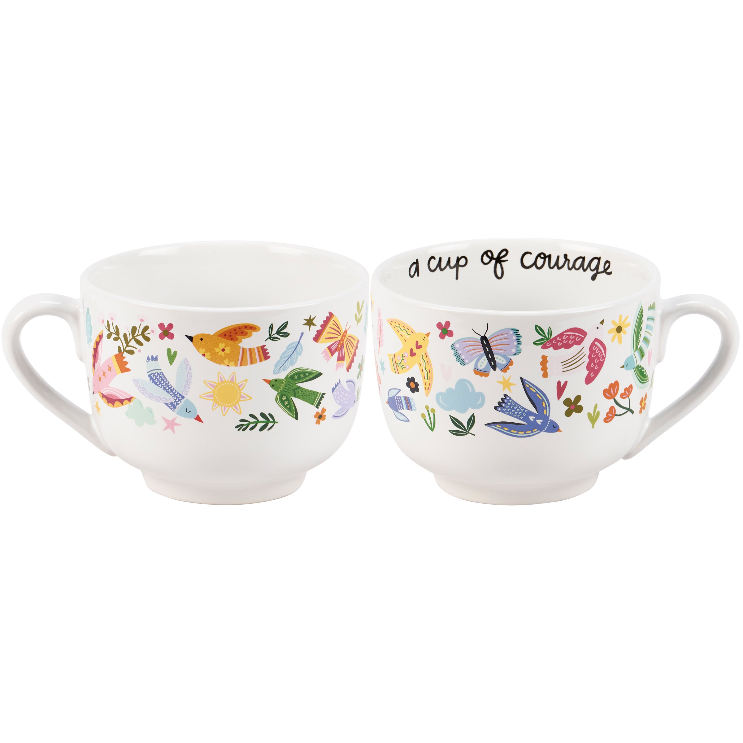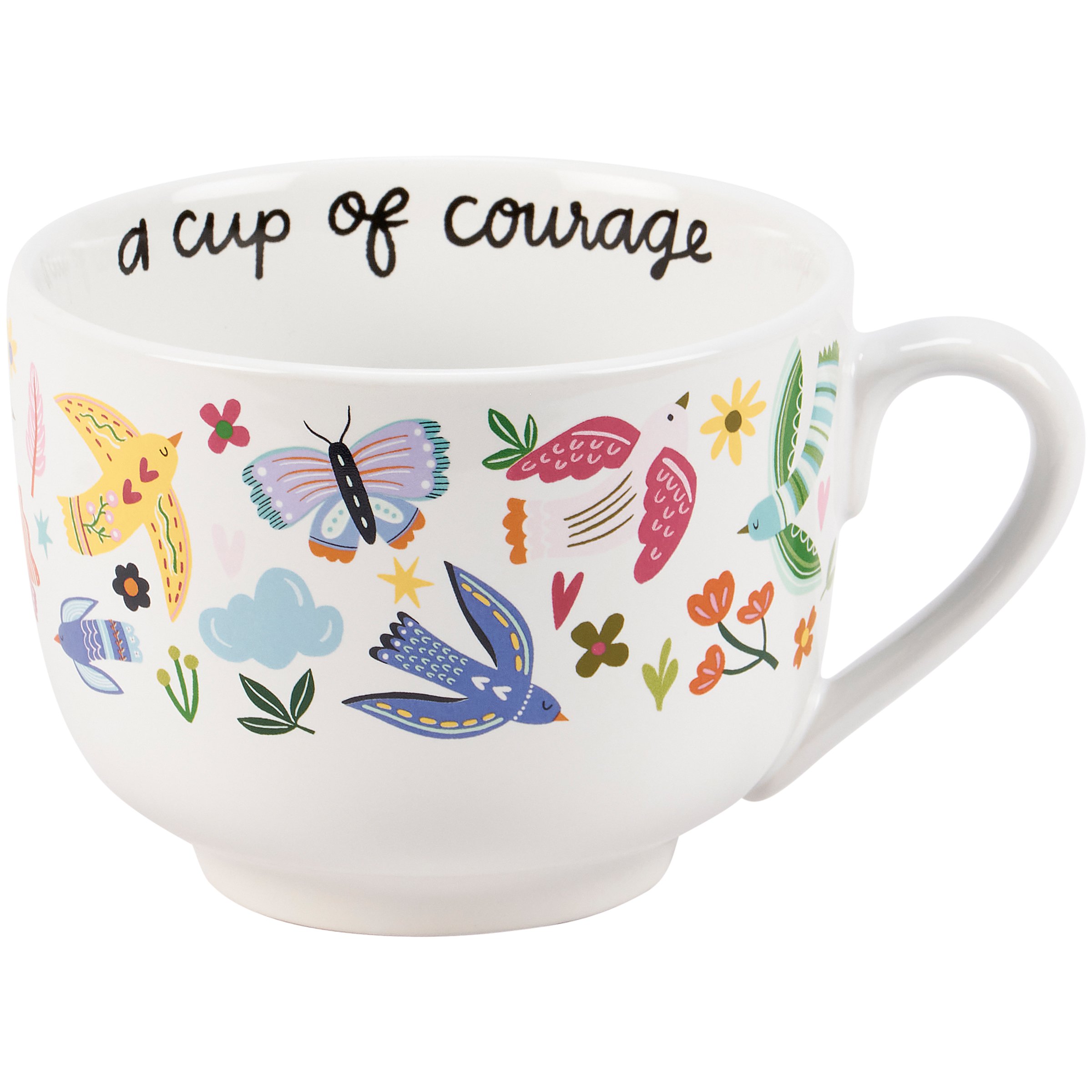A stoneware 20 oz mug from our Inspiration & Blooms Collection displaying a full wrap-around design of colorful hand illustrated birds, butterflies, and florals. Mug also features an inside design with inspirational sentiment along the rim that reads "A Cup Of Courage" and bird at the bottom. Our A Cup Of Courage mug is microwave, oven, dishwasher, and food safe for easy use. An inspirational gift perfect for everyday drinkware.