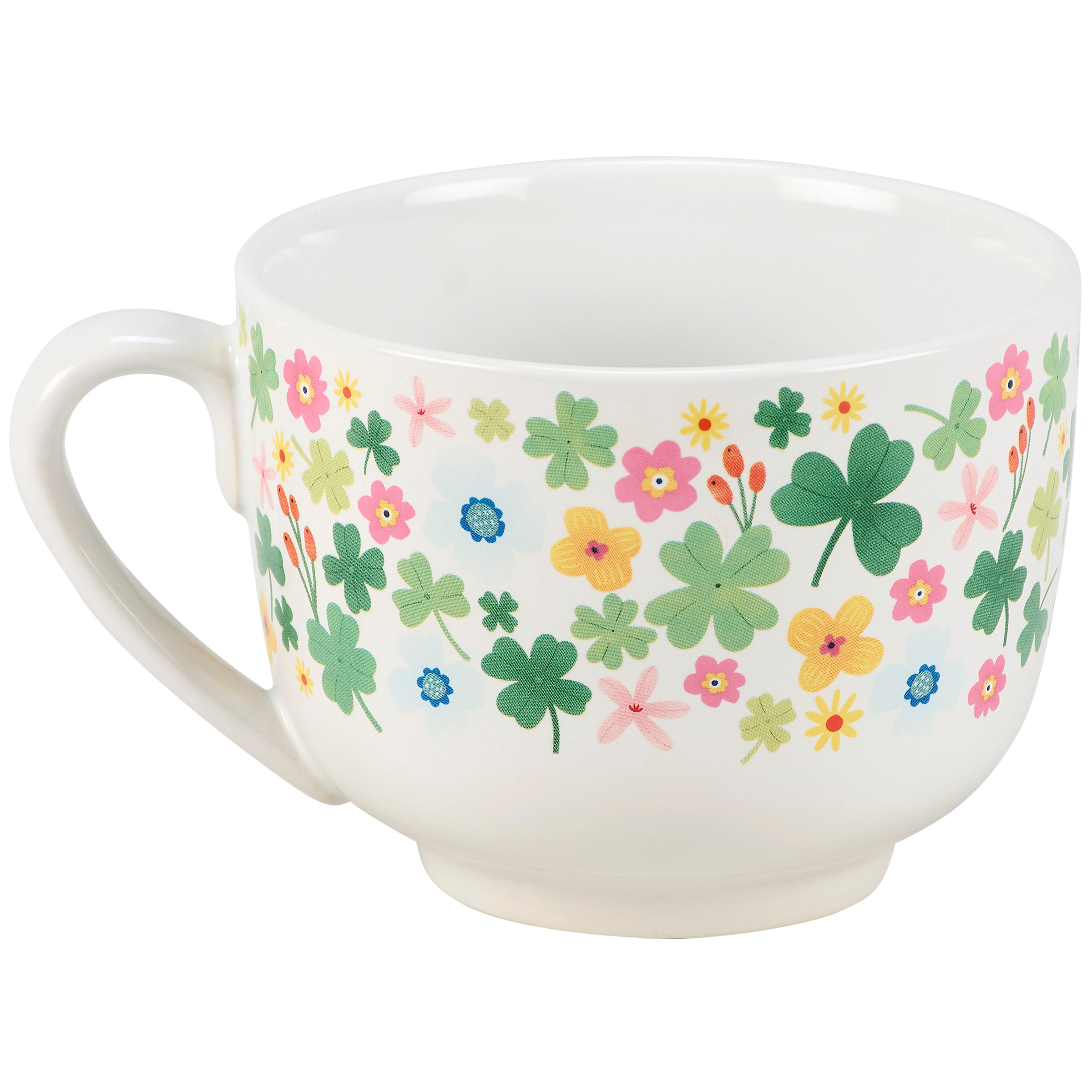 A stoneware 20 oz mug from our Inspiration & Blooms Collection displaying a full wrap-around design of vibrant hand illustrated florals and clovers. Mug also features an inside design with inspirational sentiment along the rim that reads "A Cup Of Luck" and clover at the bottom. Our A Cup Of Luck mug is microwave, oven, dishwasher, and food safe for easy use. An inspirational gift perfect for everyday drinkware.