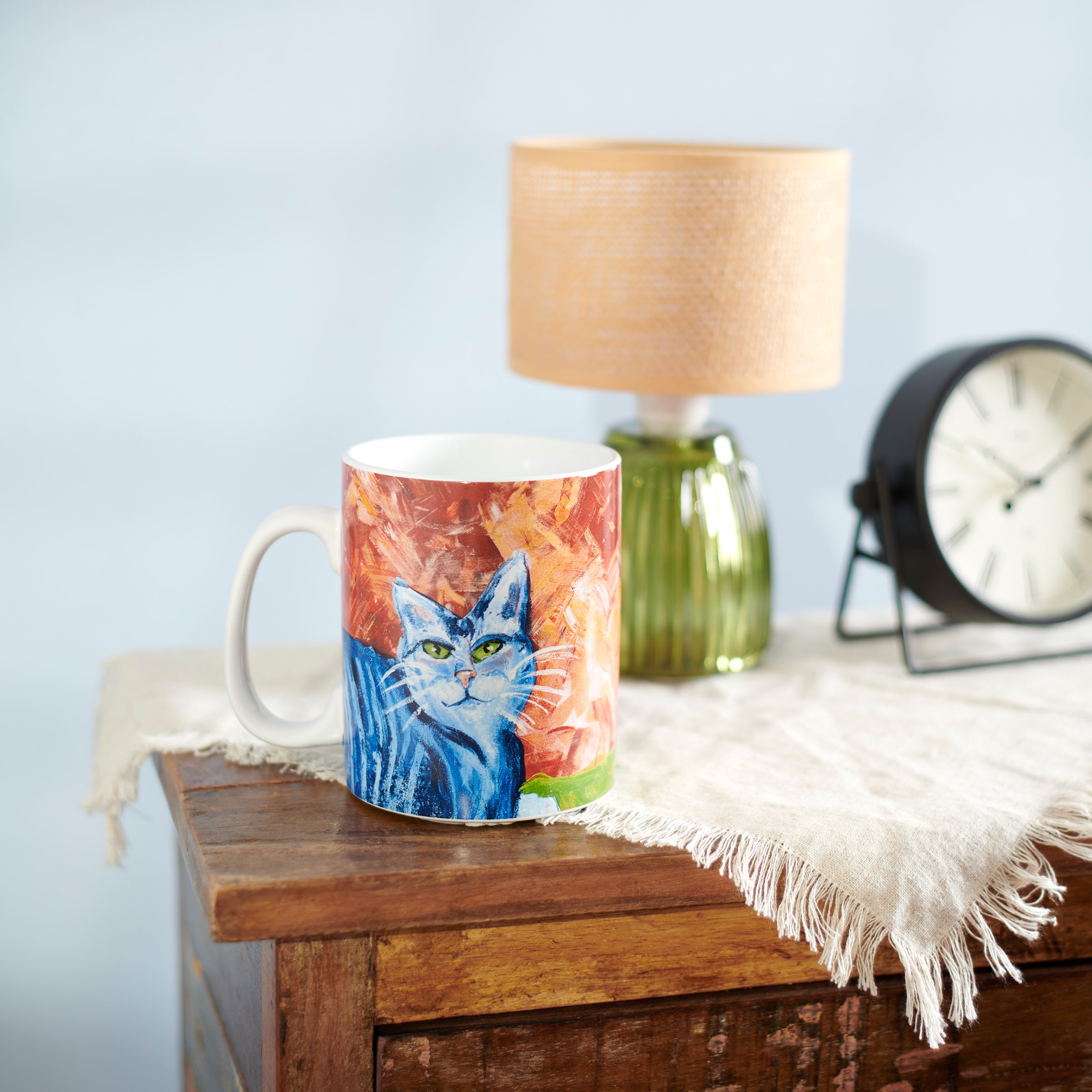 A stoneware 20 oz mug displaying a colorful pet inspired double-sided design of a house cat. Design is replicated from original art created at the Friendship Heart Gallery in downtown Lancaster, PA that supports artists with intellectual disabilities and autism. Our Colorful Cat mug is conveniently microwave, oven, dishwasher, and food safe for easy use. A pet-themed gift perfect for everyday drinkware.