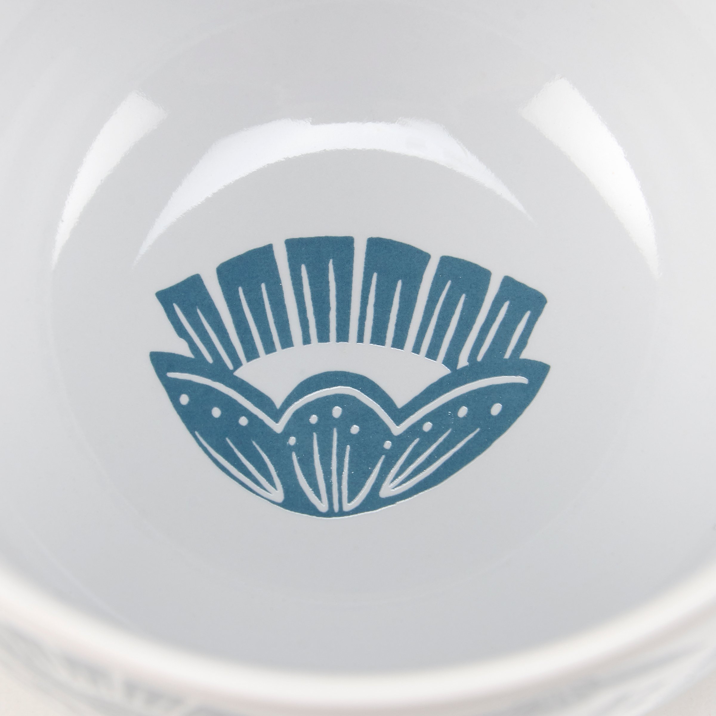A stoneware 20 oz mug from our Folk Art Collection displaying a full wrap-around design of hand illustrated blue florals inspired by Scandinavian folk art. Mug also features an inside design with inspirational sentiment along the rim that reads "Courage For Today - Confidence For Tomorrow" and a blue flower at the bottom. Our Courage For Today mug is conveniently microwave, oven, dishwasher, and food safe for easy use. An inspirational mug perfect for everyday drinkware.