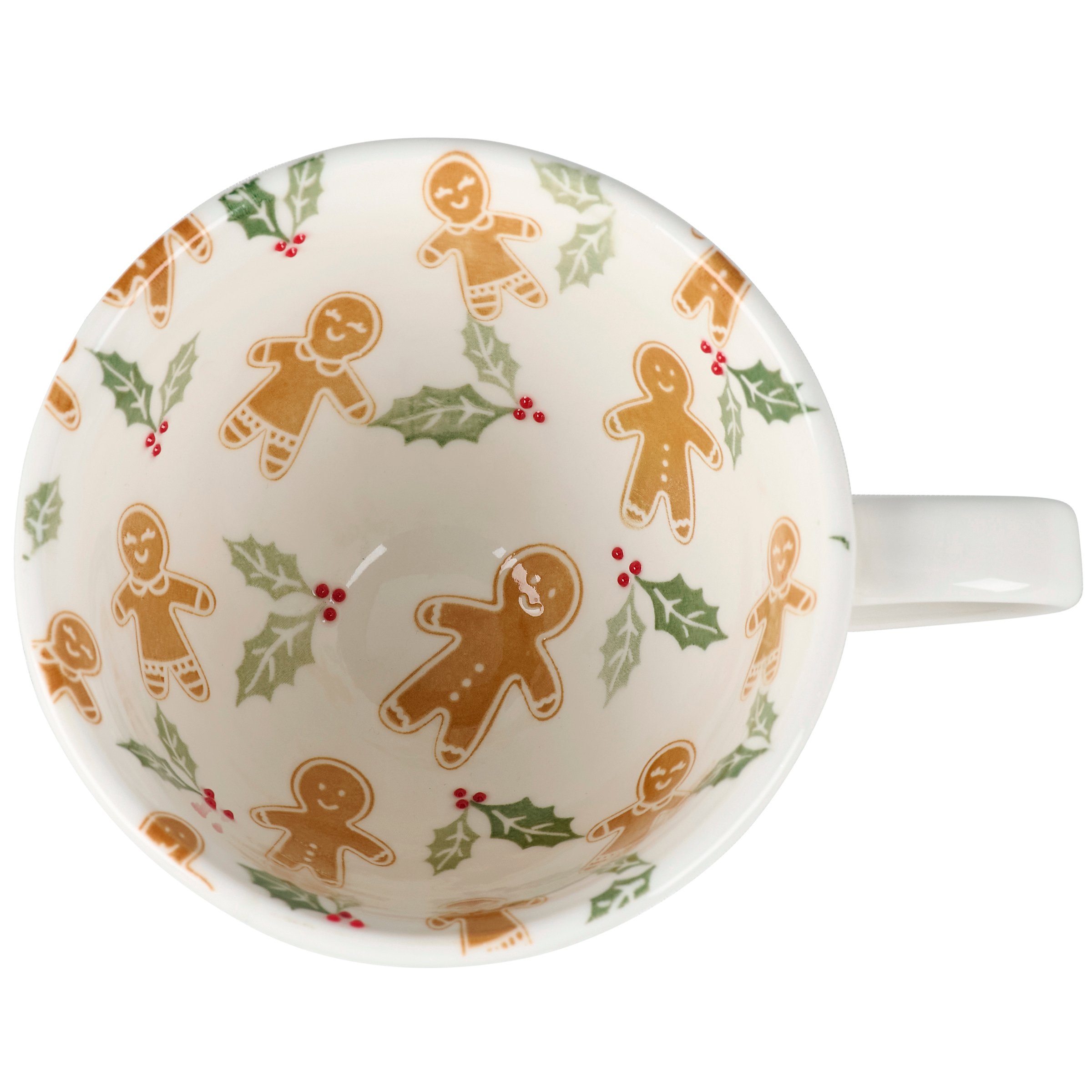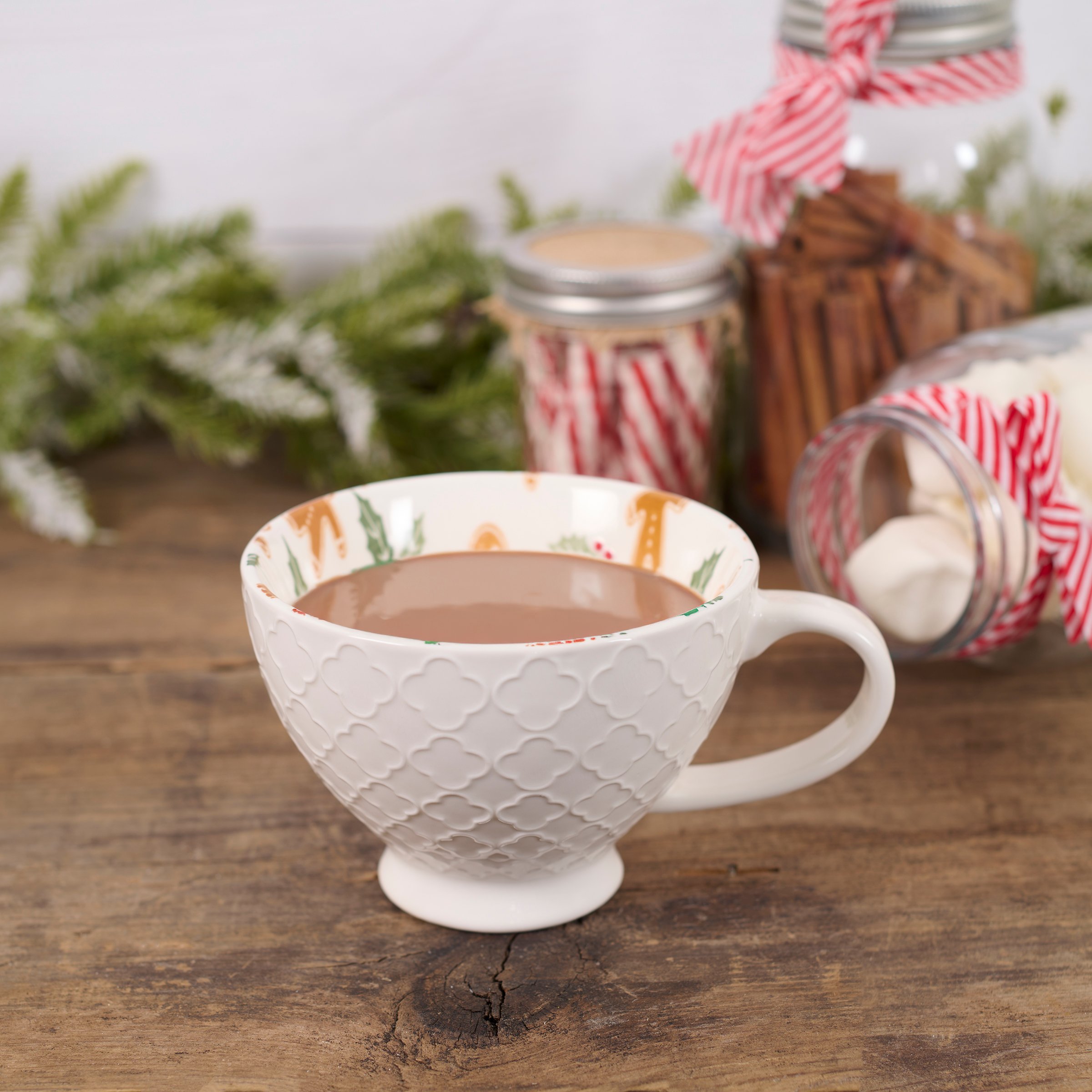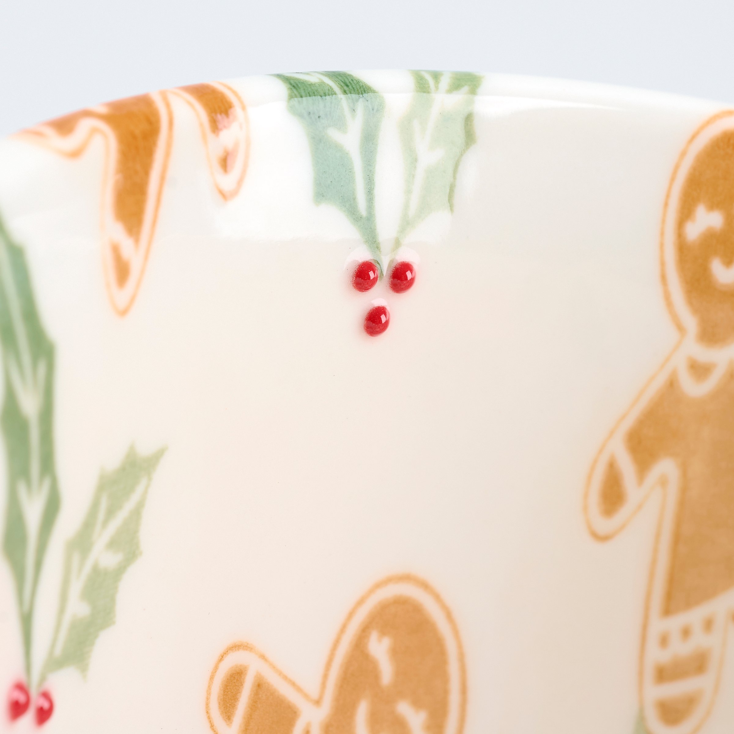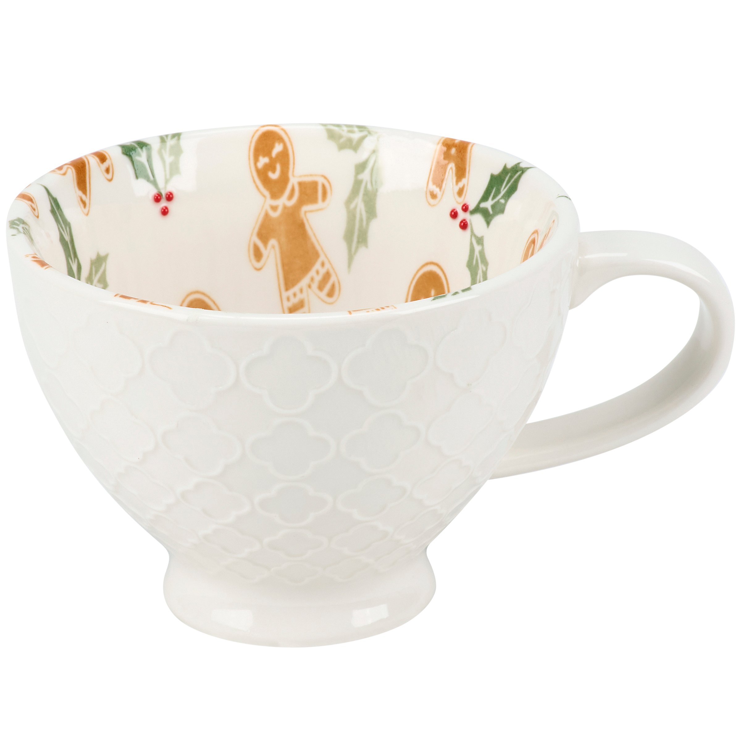 A durable ceramic 12 oz mug from our Christmas Collection featuring a textured pattern on the outside with a gingerbread man and holly pattern on the inside of the mug. Our Gingerbread mug is conveniently microwave, oven, dishwasher, and food safe for easy use. A piece of seasonal drinkware perfect for gingerbread themed tablescapes.
