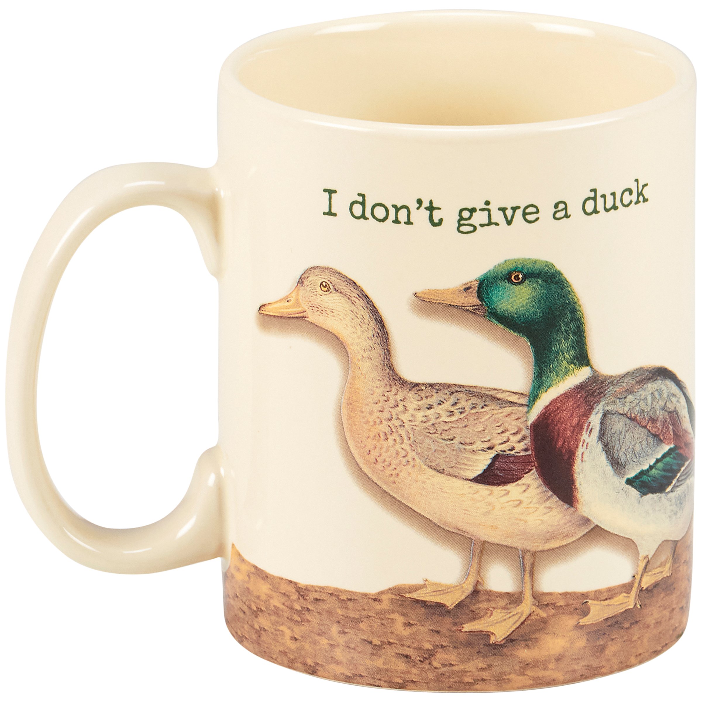 A stoneware 20 oz mug from our Farmhouse Collection displaying a double-sided design of ducks in a vintage style. Design also features a fun farm animal-themed pun that reads "I Don't Give A Duck." Our Give A Duck mug is microwave, oven, dishwasher, and food safe for convenient use. A fun farm-themed gift perfect for everyday drinkware.