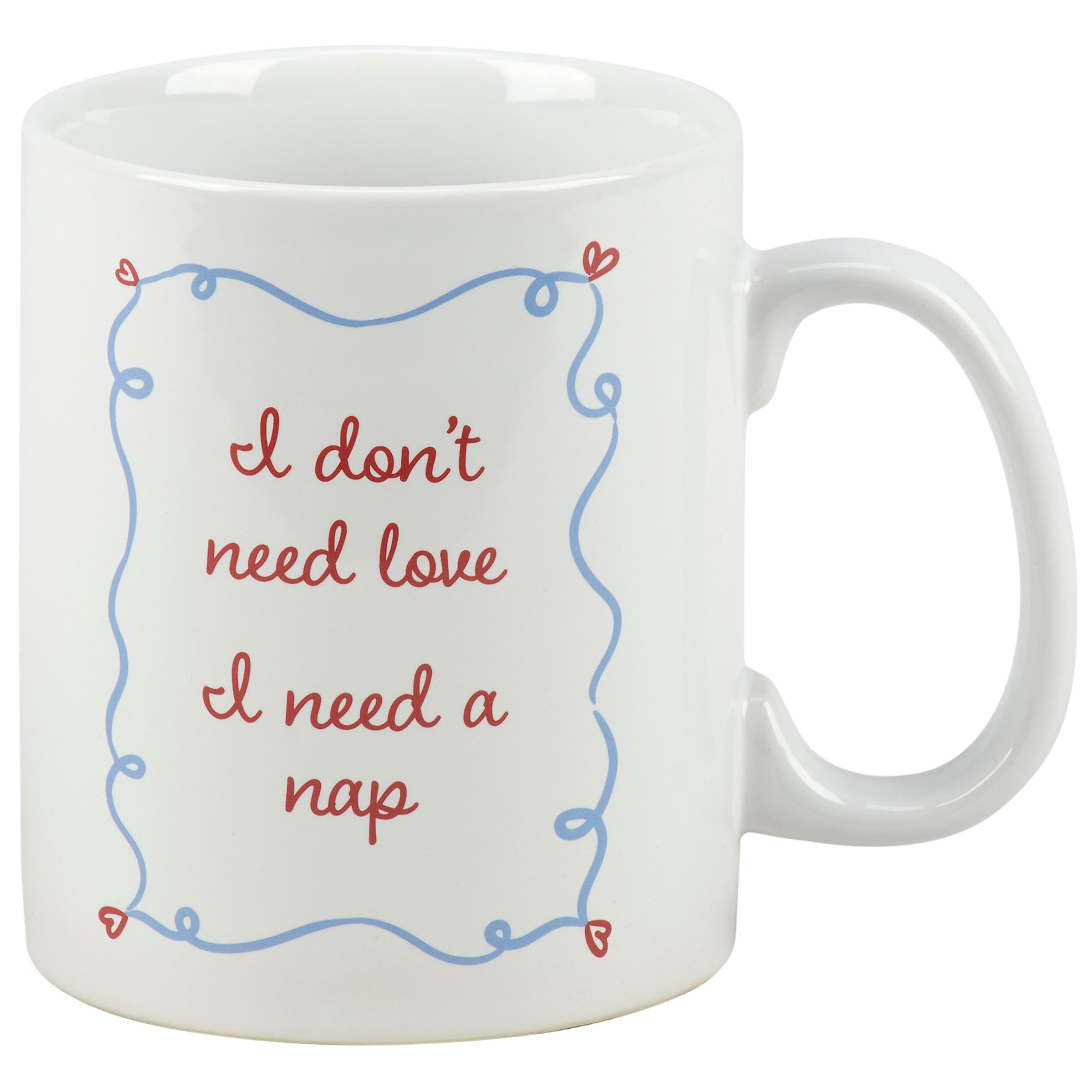 A stoneware 20 oz mug from our Anti Valentine Collection featuring a double-sided design displaying cupid art in a hand illustrated style on one side and a sarcastic love-themed sentiment on the other side that reads "I Don't Need Love - I Need A Nap." Our I Need A Nap mug is conveniently microwave, oven, dishwasher, and food safe for easy use. A sassy love-themed gift that offers a fun alternative for Valentine's Day style.