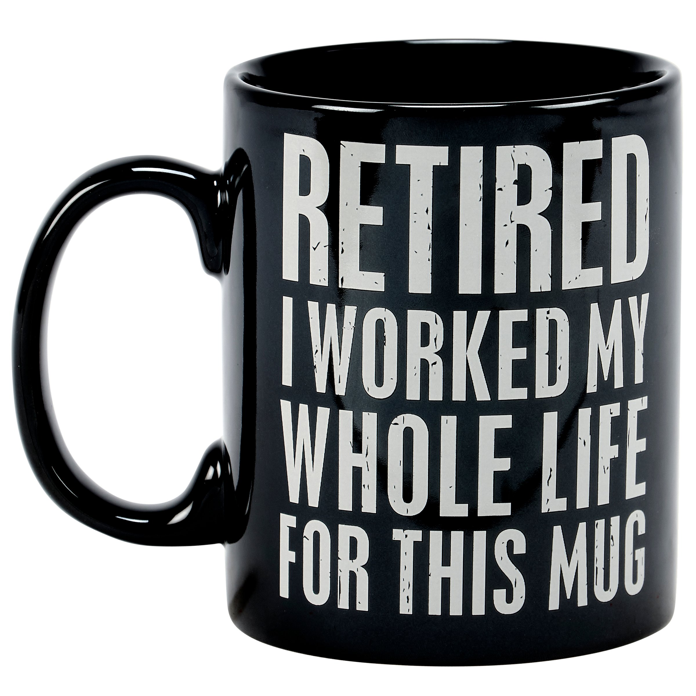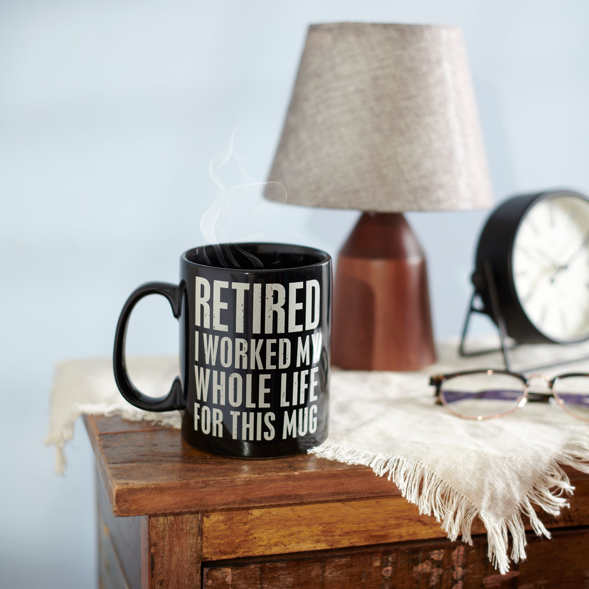 A stoneware 20 oz mug from our Box Sign Style Collection displaying a double-sided design of a fun retirement inspired sentiment in a classic box sign style that reads "Retired - I Worked My Whole Life For This Mug." Our I Worked For This mug is conveniently microwave, oven, dishwasher, and food safe for easy use. A fun retirement gift perfect for everyday drinkware.