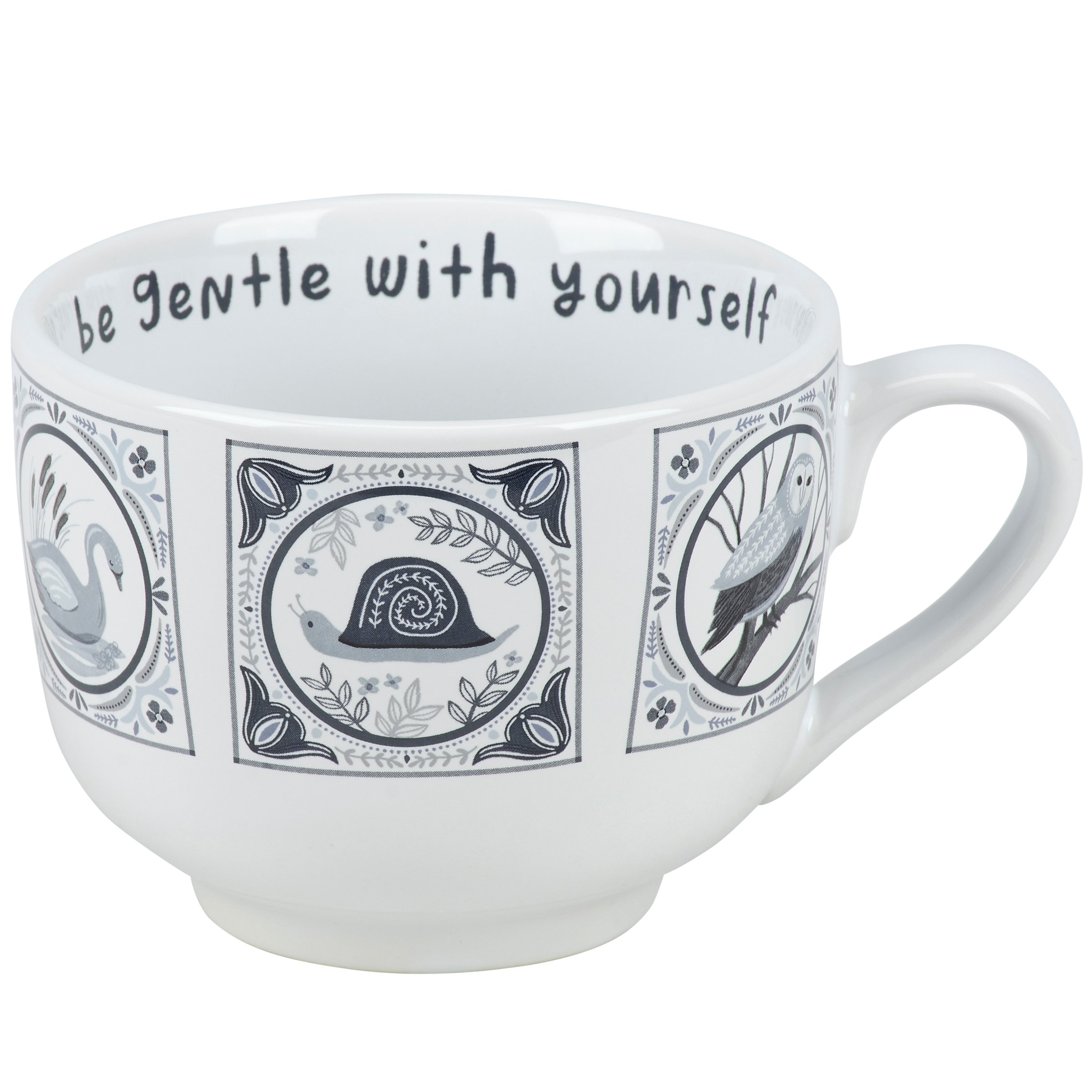 A stoneware 20 oz mug from our Home Collection featuring a full wrap-around design displaying a pattern of tile inspired illustrations in a calming indigo color palette with various nature scenes in the centers. This indigo mug also features an inside design with inspirational sentiment along the rim that reads "Be Gentle With Yourself" and butterfly at the bottom. Our Indigo Tile mug is microwave, oven, dishwasher, and food safe for easy use. An inspirational gift perfect for adding daily motivation to everyday drinkware.
