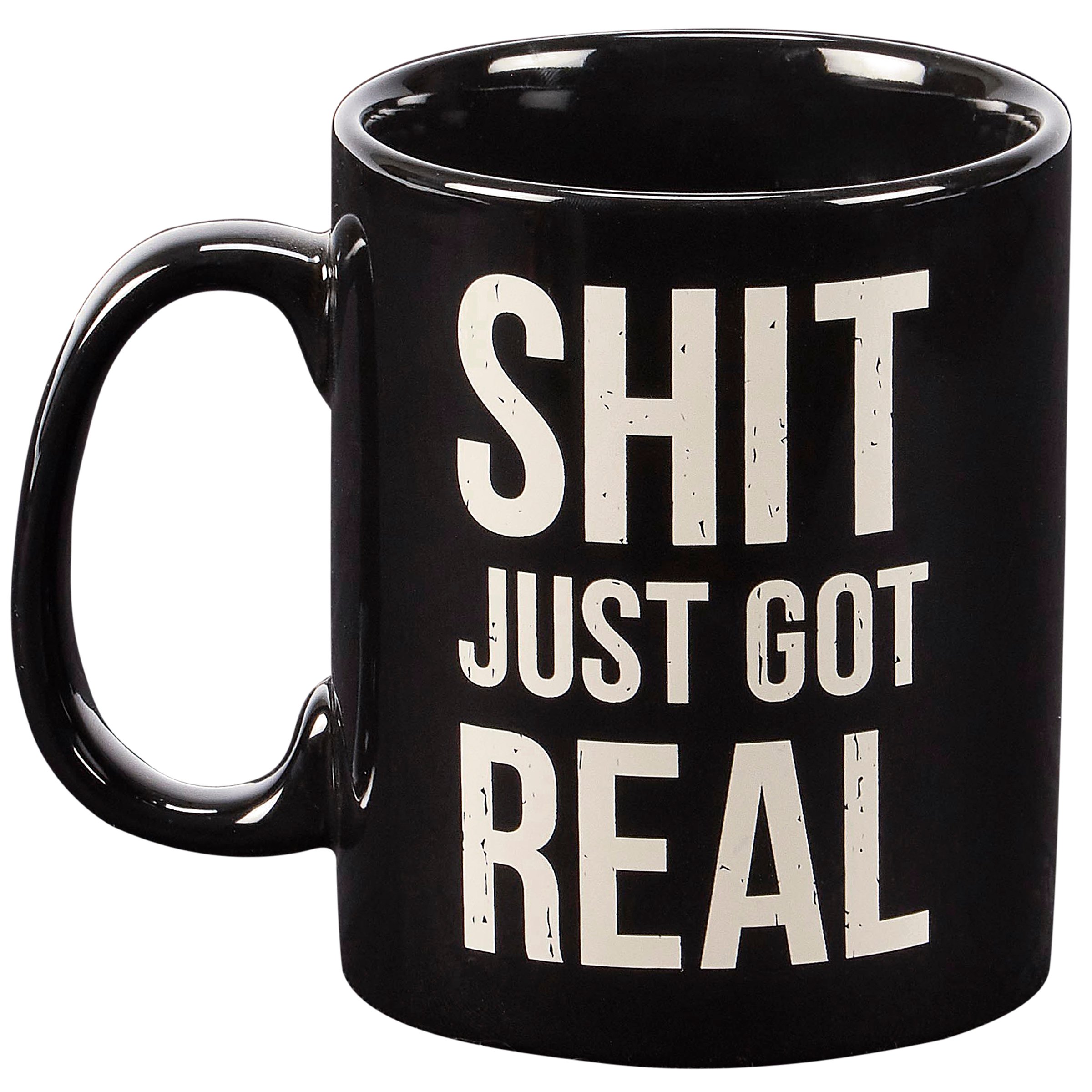 A stoneware 20 oz mug from our Box Sign Style Collection displaying a double-sided design of a sassy sentiment in a classic box sign style that reads "Shit Just Got Real." Our Just Got Real mug is conveniently microwave, oven, dishwasher, and food safe for easy use. A funny gift perfect for everyday drinkware.