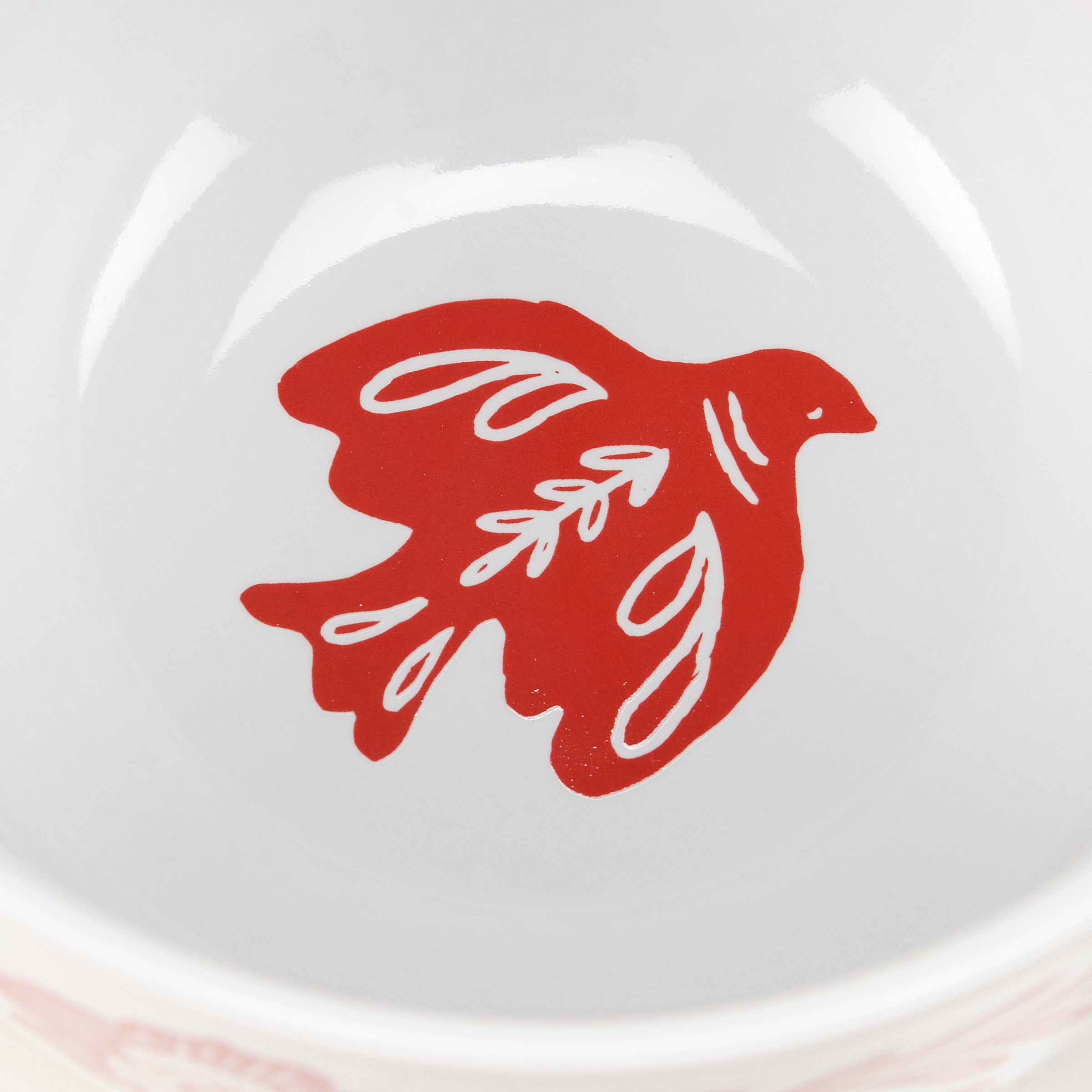 A stoneware 20 oz mug from our Folk Art Collection displaying a full wrap-around design of hand illustrated red florals inspired by Scandinavian folk art. Mug also features an inside design with inspirational sentiment along the rim that reads "Love For Today - Serenity For Tomorrow" and a red peace dove at the bottom. Our Love For Today mug is conveniently microwave, oven, dishwasher, and food safe for easy use. An inspirational mug perfect for everyday drinkware.