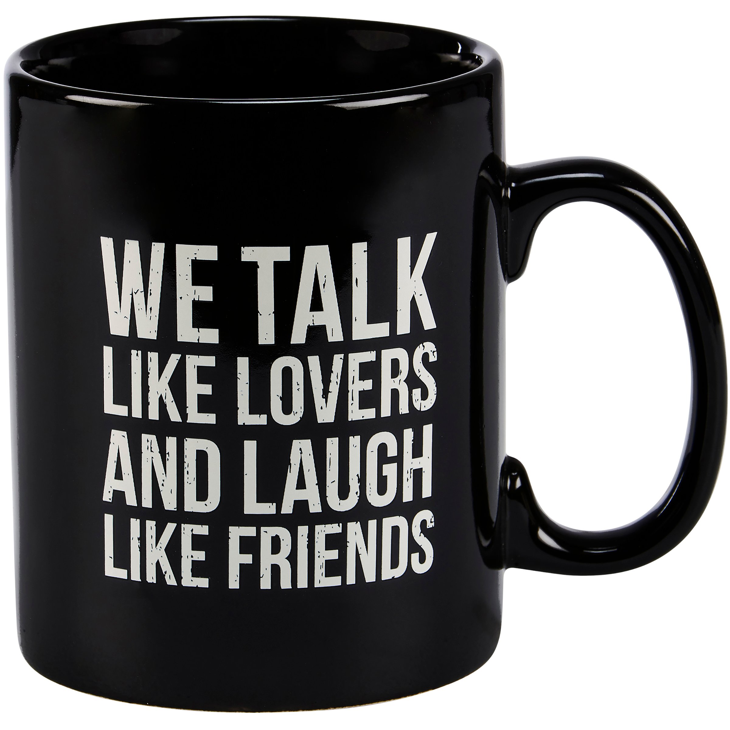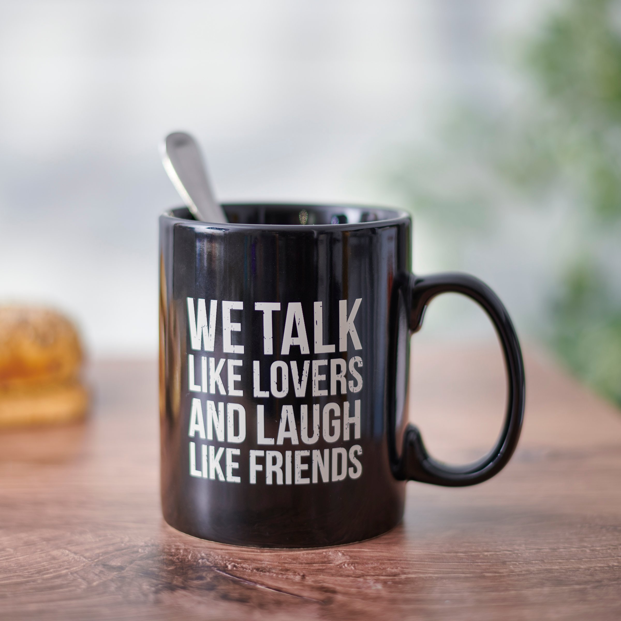 A stoneware 18 oz mug from our Box Sign Style Collection displaying a double-sided design on black color. Design features heartwarming sentiment in a box sign style that reads "We Talk Like Lovers And Laugh Like Friends." Our Lovers And Friends mug is microwave, oven, dishwasher, and food safe. A lovely gift perfect for everyday drinkware.
