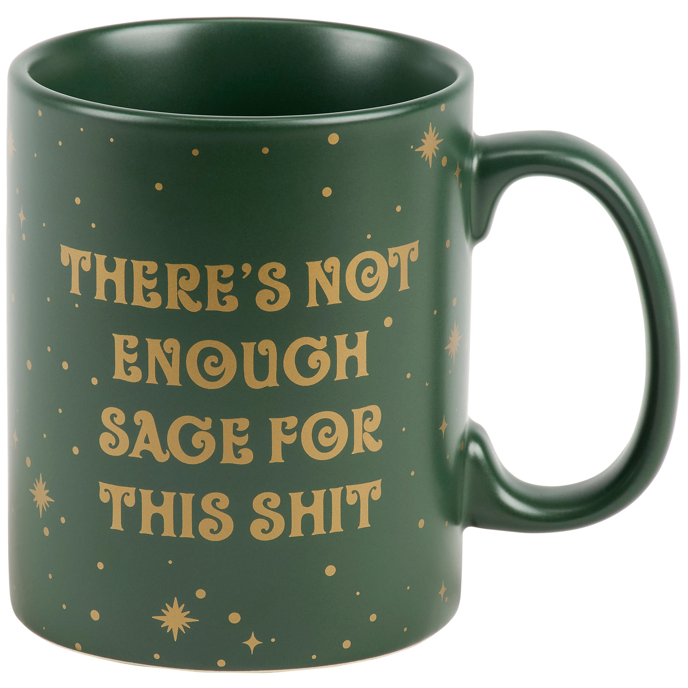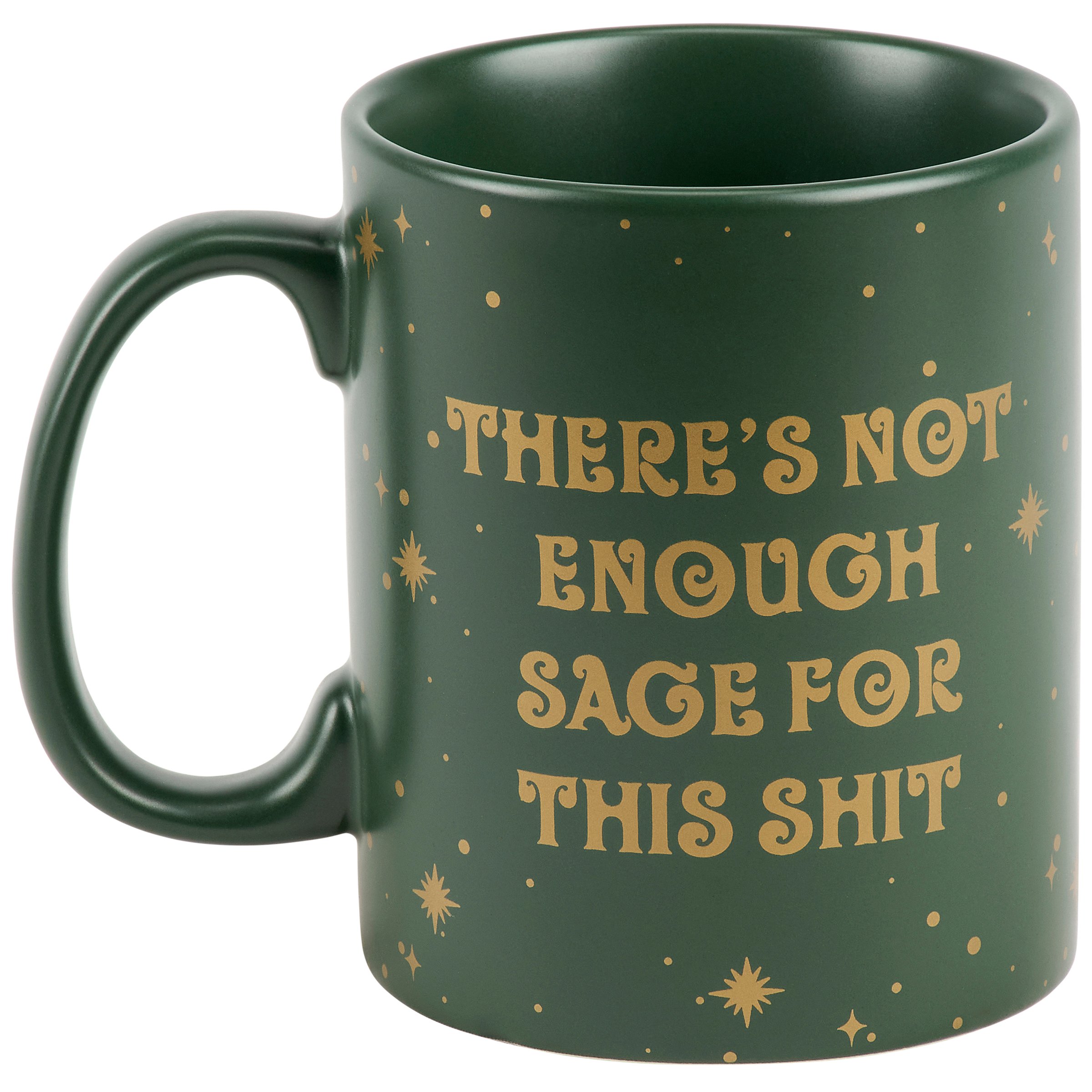 A stoneware 20 oz mug from our Mystical Collection displaying a double-sided design of gold stars around a sassy spiritual sentiment that reads "There's Not Enough Sage For This Shit." Our Not Enough Sage For This mug is conveniently microwave, oven, dishwasher, and food safe for easy use. A sassy celestial themed gift perfect for everyday drinkware.