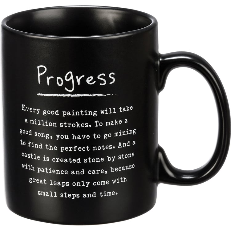 A matte black double-sided stoneware mug from our Poetry Collection features "Progress" sentiment followed by a themed poem. Our Progress mug holds 18 ounces. Microwave, oven, dishwasher, and food safe.
