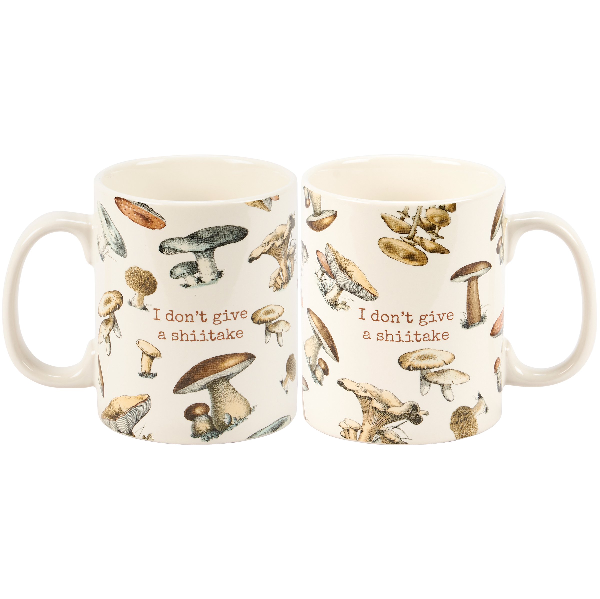 A stoneware 20 oz mug from our Garden Collection displaying a full wrap-around design of various wild mushrooms in a vintage style. Design also features a fun garden-themed pun that reads "I Don't Give A Shiitake." Our Shiitake mug is conveniently microwave, oven, dishwasher, and food safe for easy use. A fun garden-themed gift perfect for everyday drinkware.
