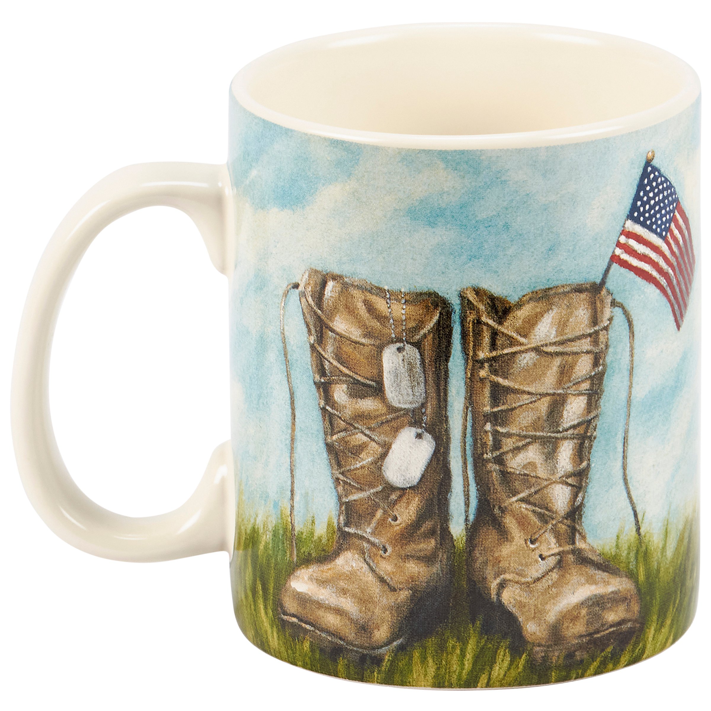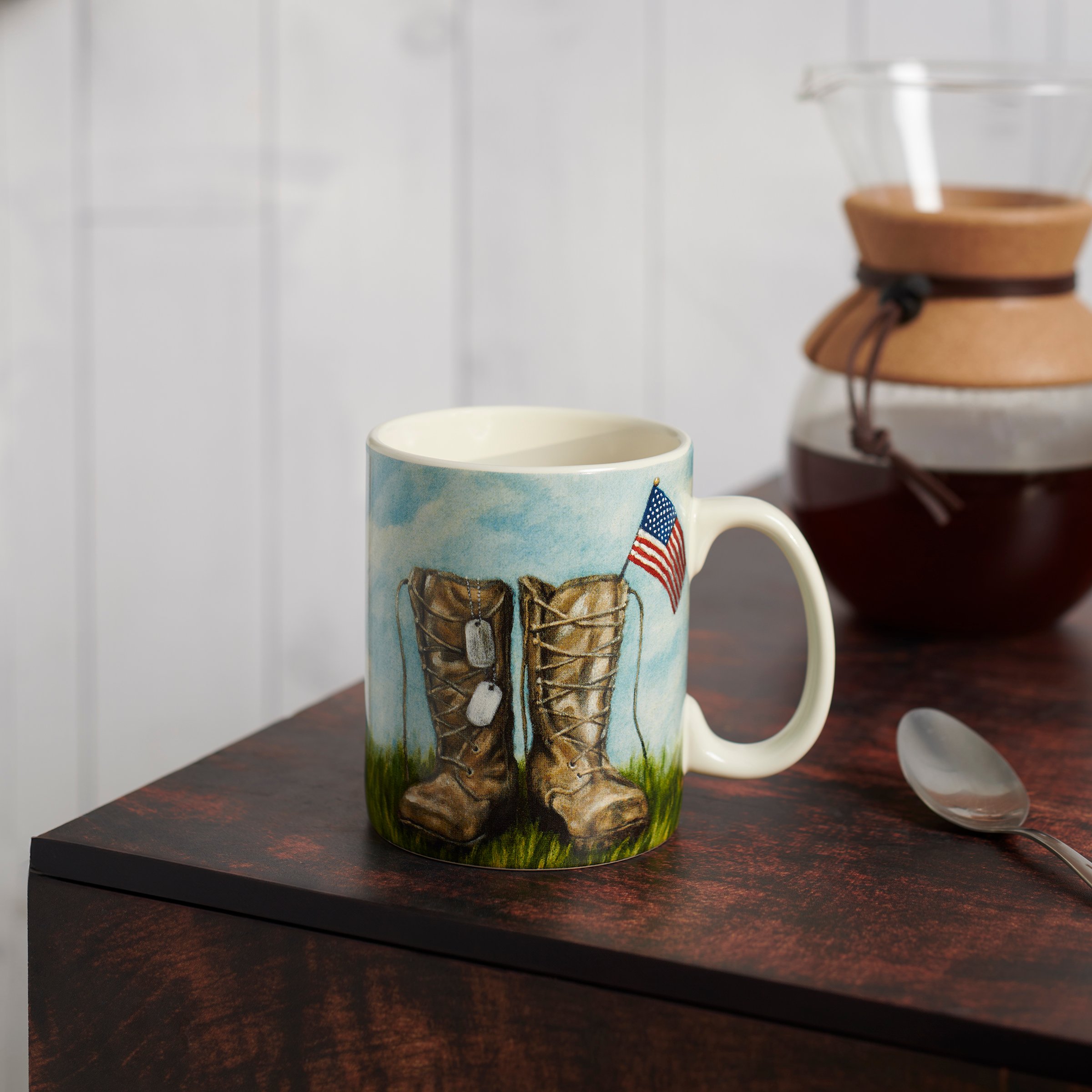 A stoneware 20 oz mug from our Patriotic Collection displaying a double-sided design of a pair of soldiers boots with dog tags and an American flag on them. Patriotic soldier design is replicated from original artwork painted onto burlap canvas, giving the art a unique depth and texture. Our Soldier's Boots mug is conveniently microwave, oven, dishwasher, and food safe for easy use. A patriotic mug perfect for everyday drinkware.