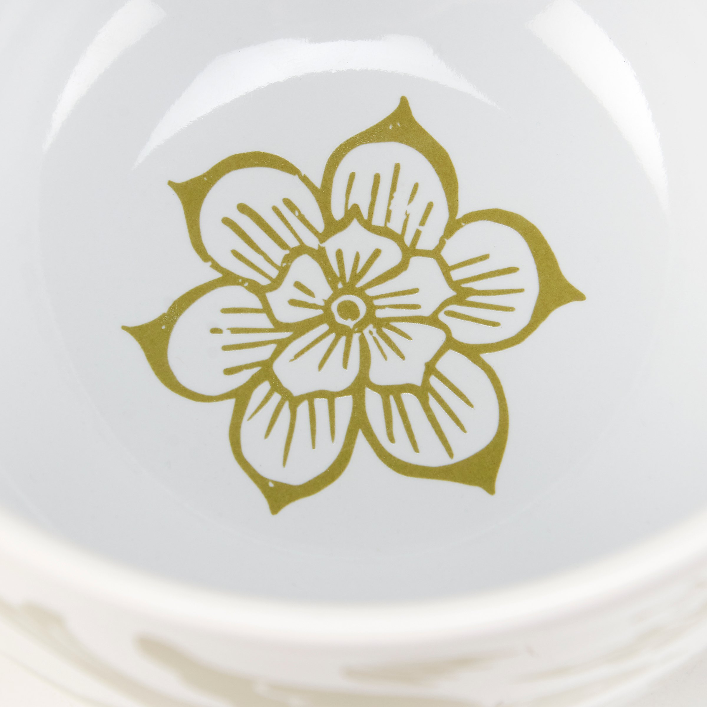 A stoneware 20 oz mug from our Folk Art Collection displaying a full wrap-around design of hand illustrated green florals and peace doves inspired by Scandinavian folk art. Mug also features an inside design with inspirational sentiment along the rim that reads "Strength For Today - Hope For Tomorrow" and a green flower at the bottom. Our Strength For Today mug is conveniently microwave, oven, dishwasher, and food safe for easy use. An inspirational mug perfect for everyday drinkware.