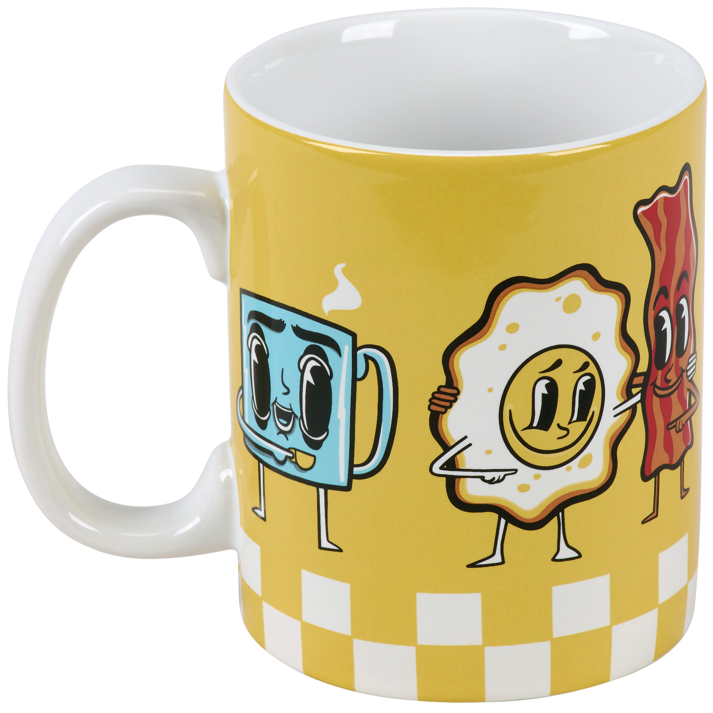A stoneware 20 oz mug from our LOL-Made You Smile Collection featuring a full wrap-around design of fun breakfast food characters with a food inspired sentiment that reads "The Breakfast Crew." Food character designs and sentiment is replicated from original hand illustrated art in a fun retro style. Our Breakfast Crew mug is conveniently microwave, oven, dishwasher, and food safe for easy use. A fun food-themed gift perfect for everyday drinkware.