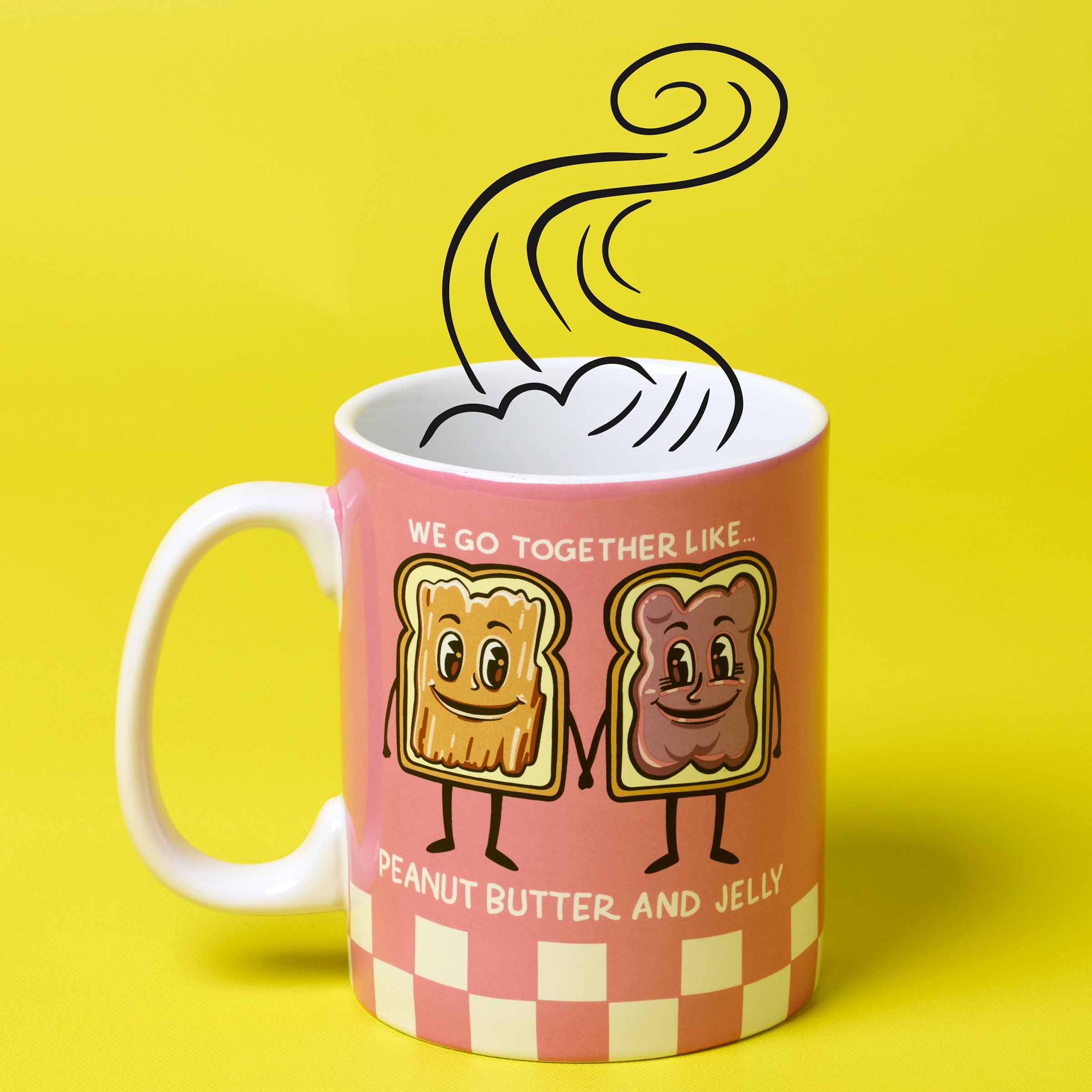 A stoneware 20 oz mug from our Valentine's Day Collection featuring a double-sided design displaying a hand illustrated peanut butter and jelly couple in a fun retro style with a food-themed sentiment that reads "We Go Together Like... Peanut Butter And Jelly." Our Together Like Peanut Butter And Jelly mug is conveniently microwave, oven, dishwasher, and food safe for easy use. A food-themed gift perfect for both friends and partners on Valentine's Day or as fun love-themed drinkware in everyday moments.