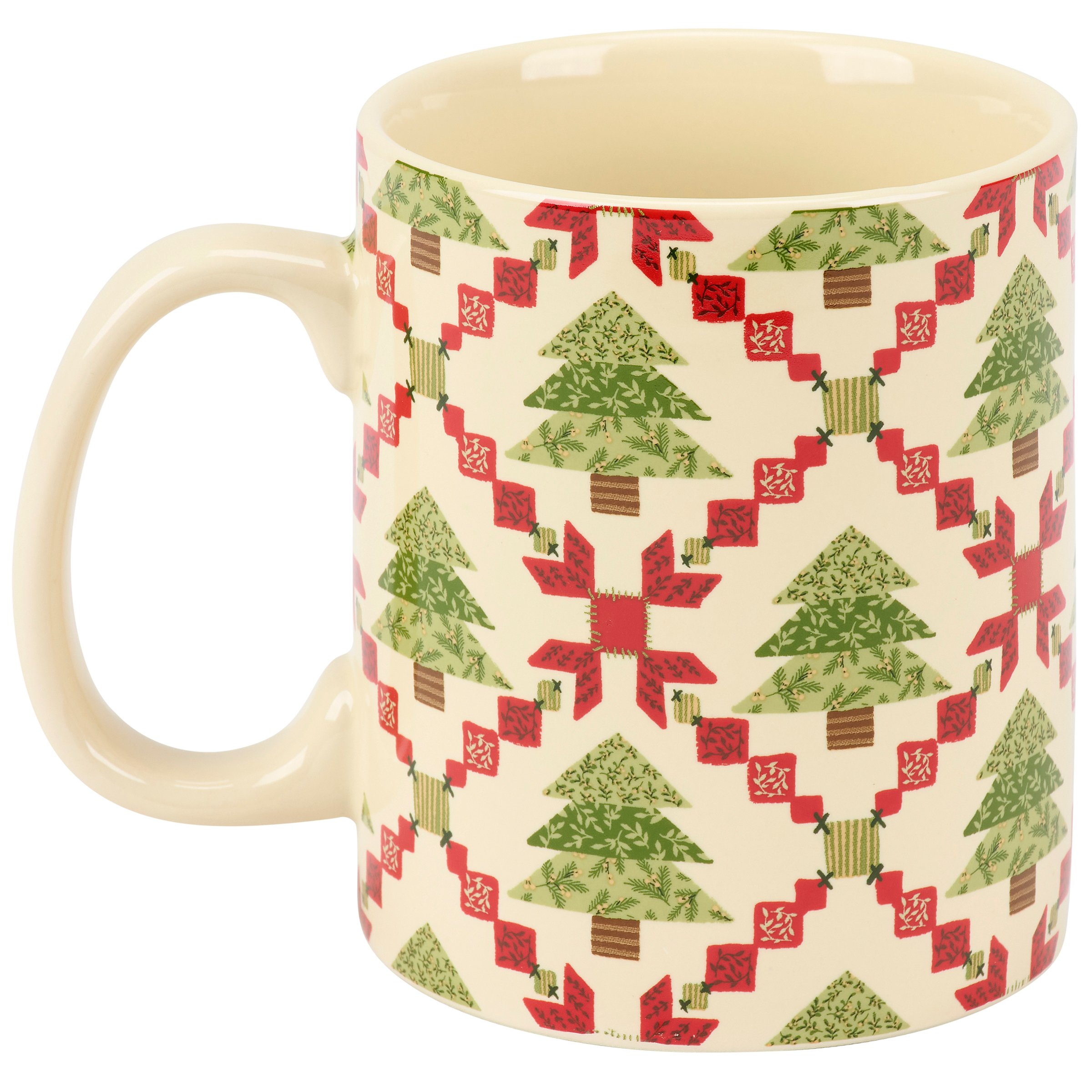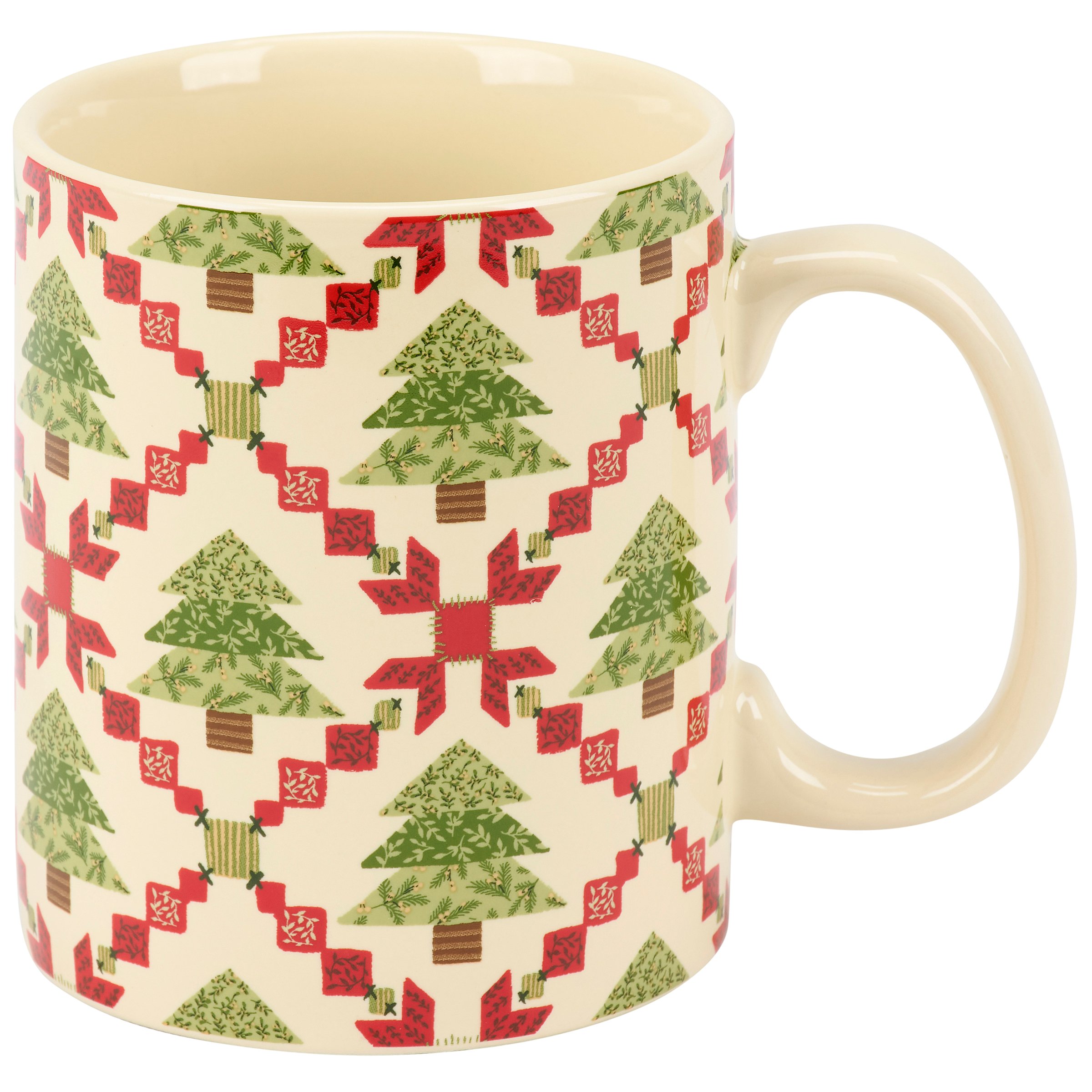 A stoneware 18 oz mug from our Christmas Collection featuring a full wrap-around design displaying a Christmas tree quilt inspired craft pattern. Christmas tree quilt design is replicated from original art hand painted in a unique watercolor style. Our Tree Quilt mug is conveniently microwave, oven, dishwasher, and food safe for easy use. A craft themed Christmas gift perfect for seasonal drinkware.