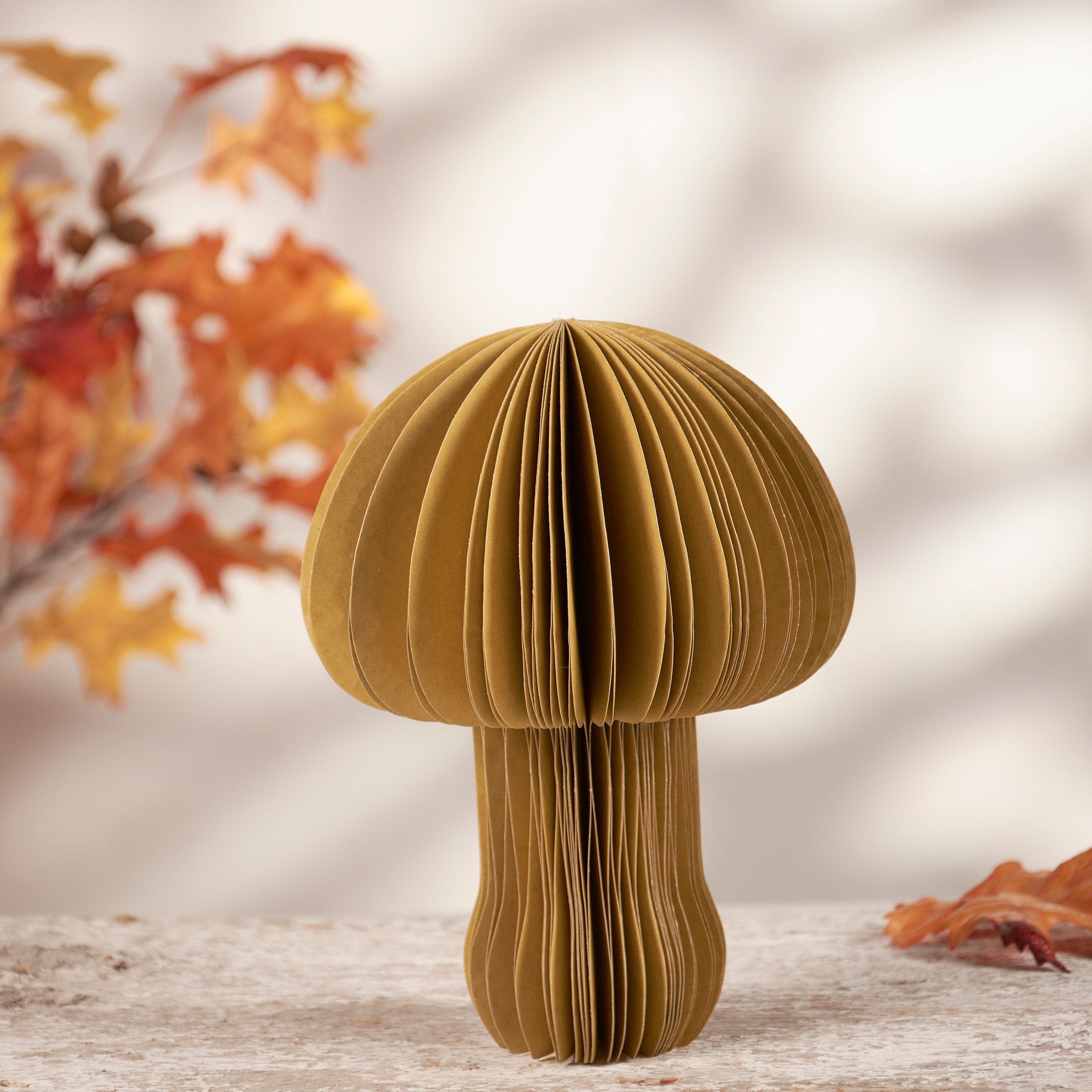 A paper honeycomb décor piece from our Cottagecore Collection displaying a tan mushroom in a folded paper design. Our Paper Honeycomb Mushroom is designed to free-stand on flat surface for easy display. To display mushroom, unfold and attach ends via magnetic closure. Seasonal paper mushroom folds up flat when not in use for compact storage. A charming mushroom-themed home accent perfect for any room or for event decorations.