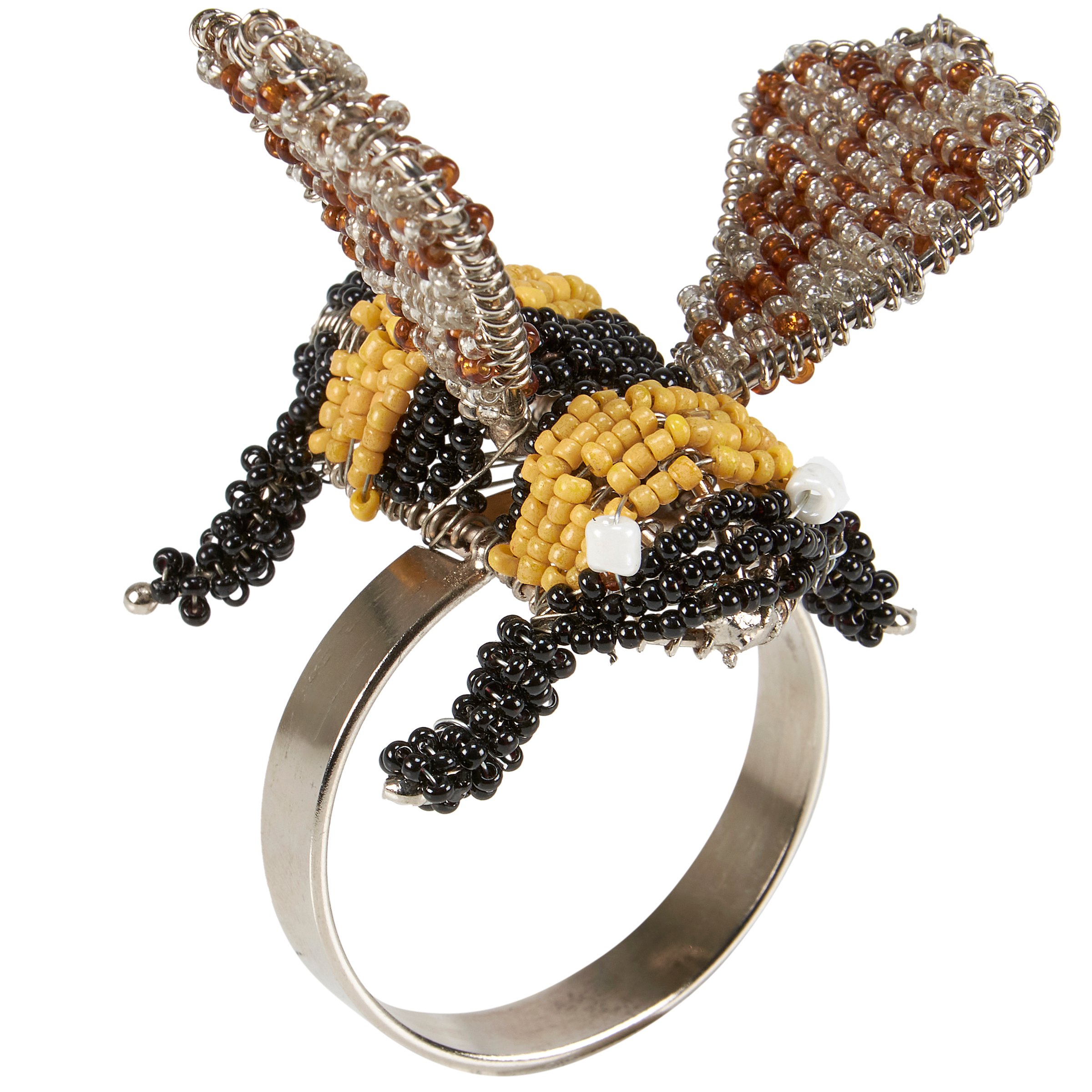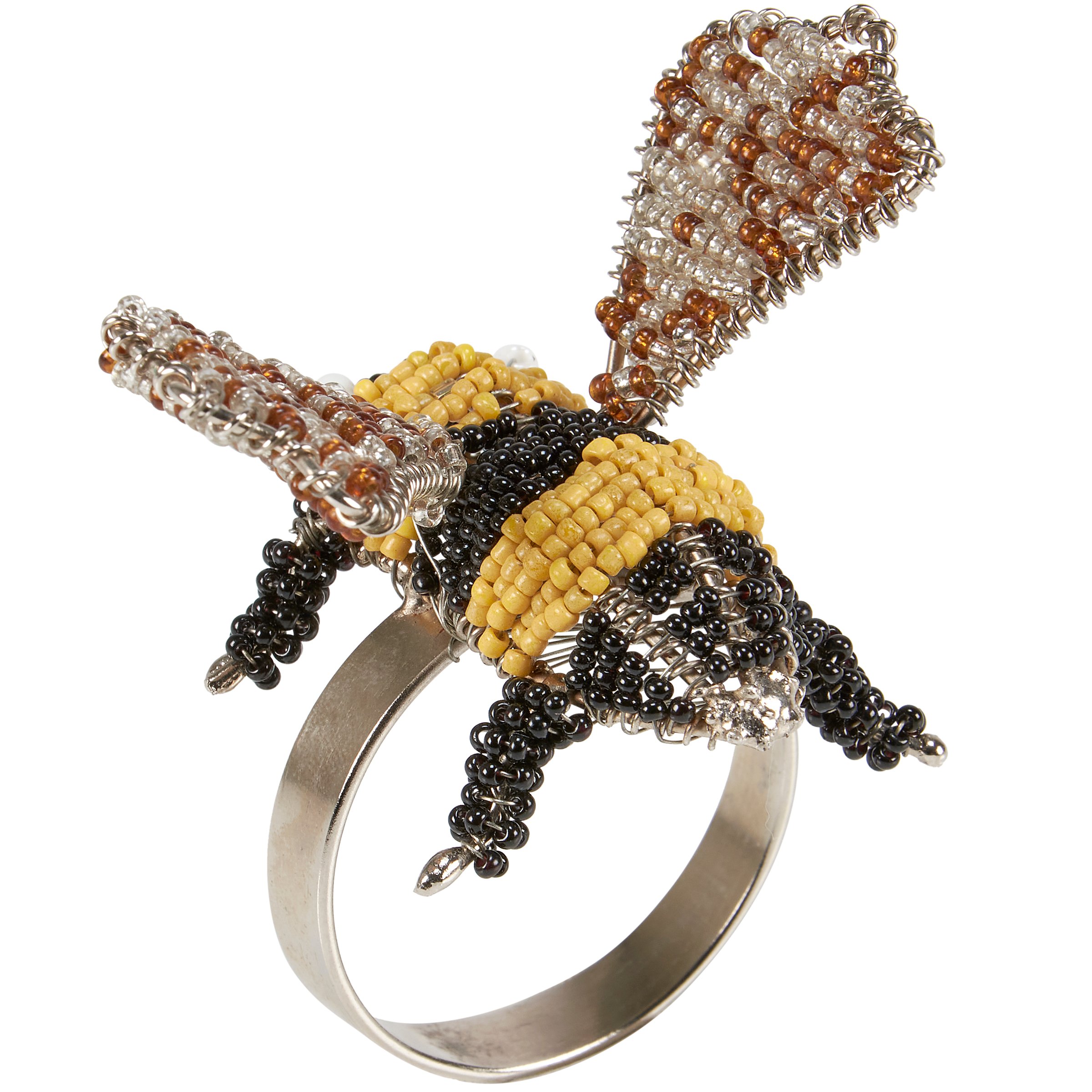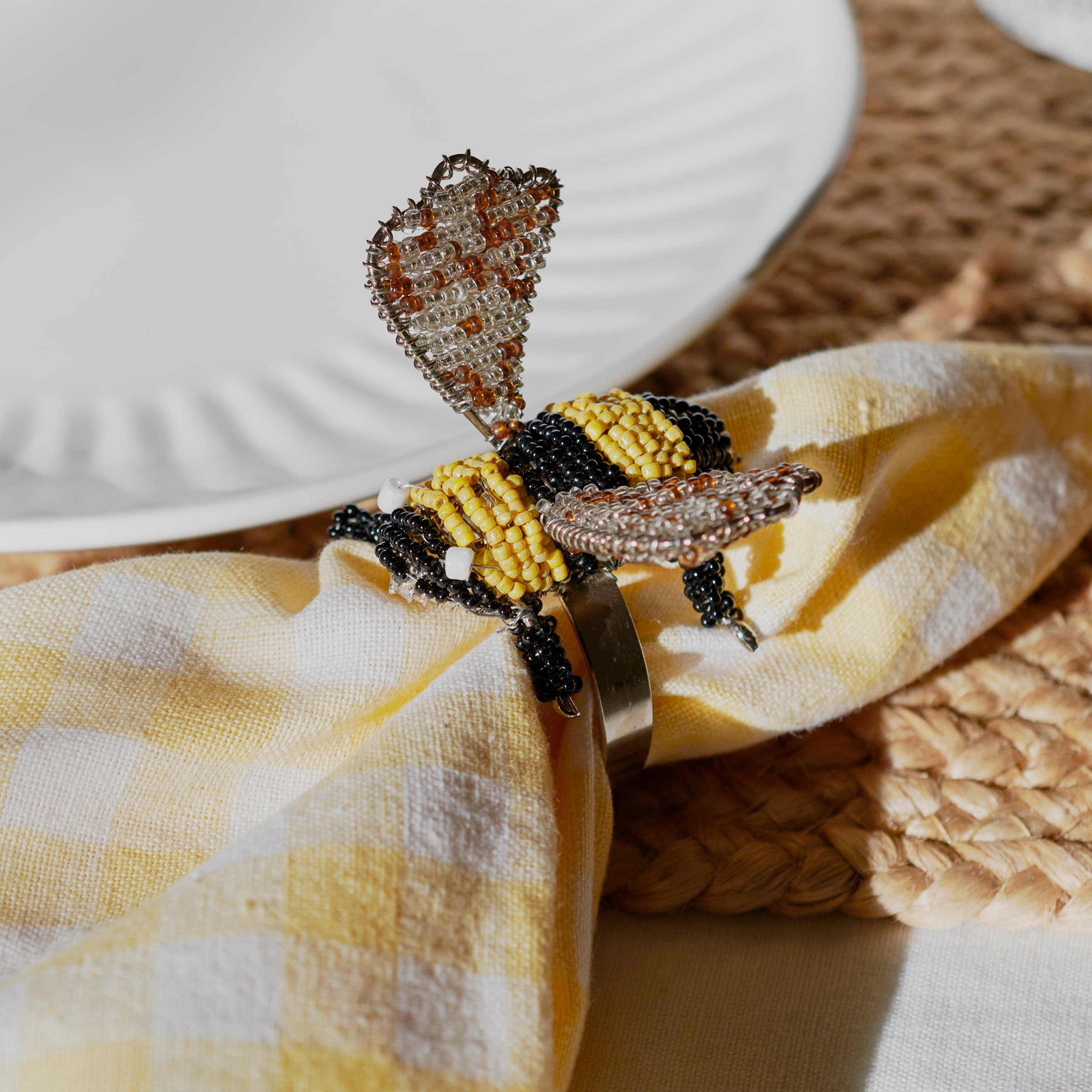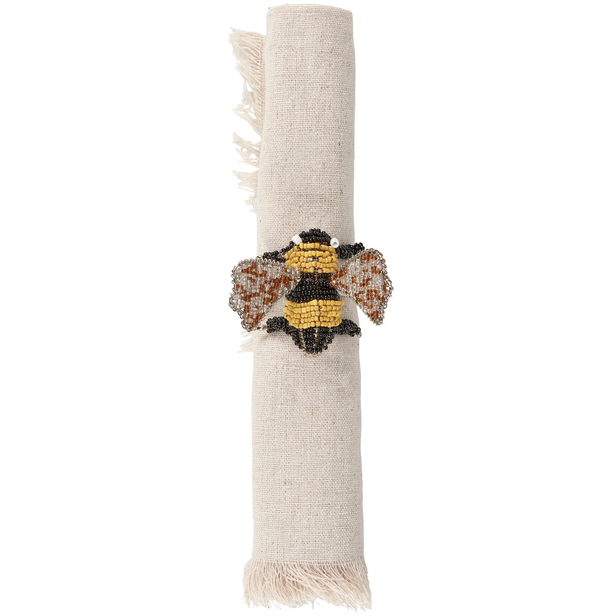A decorative napkin ring from our Garden Collection featuring a craft style design of a bee made with colored beads. Our Bee napkin ring includes a metal ring to easily slip over rolled napkin and, when not in use, can be added to table setting as table décor. Napkin pictured not included. A charming tabletop accessory perfect for bee-themed tablescapes.