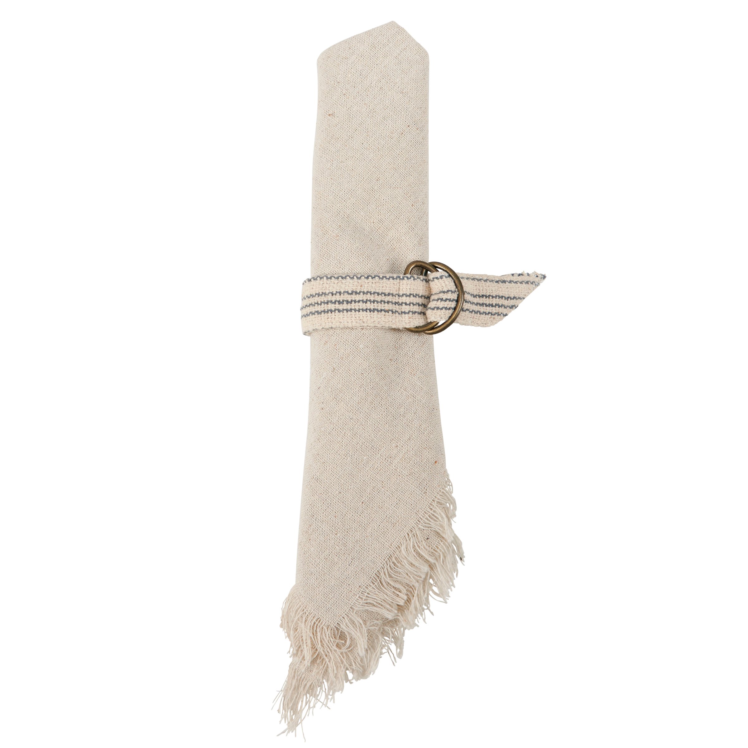 A cotton napkin ring from our Farmhouse Collection featuring a woven blue stripe design with brass hardware. Our Blue Stripe napkin ring includes adjustable design to easily wrap around rolled napkin. Napkin pictured not included. A rustic tabletop accessory perfect for everyday gatherings.
