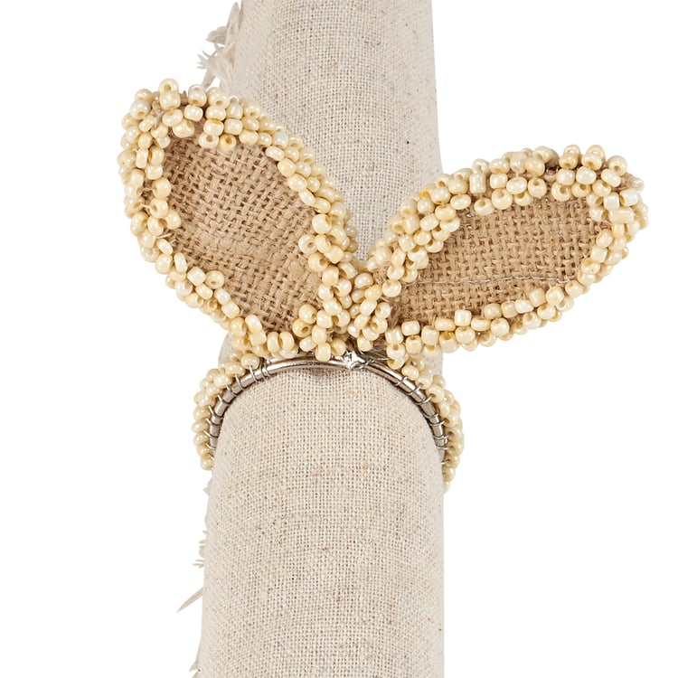 A decorative napkin ring from our Easter & Spring Collection featuring a craft style design of bunny ears made with colored beads. Our Bunny Ears napkin ring includes a metal ring to easily slip over rolled napkin and, when not in use, can be added to table setting as a seasonal accent. Napkin pictured not included. A charming tabletop accessory perfect for seasonal gatherings.