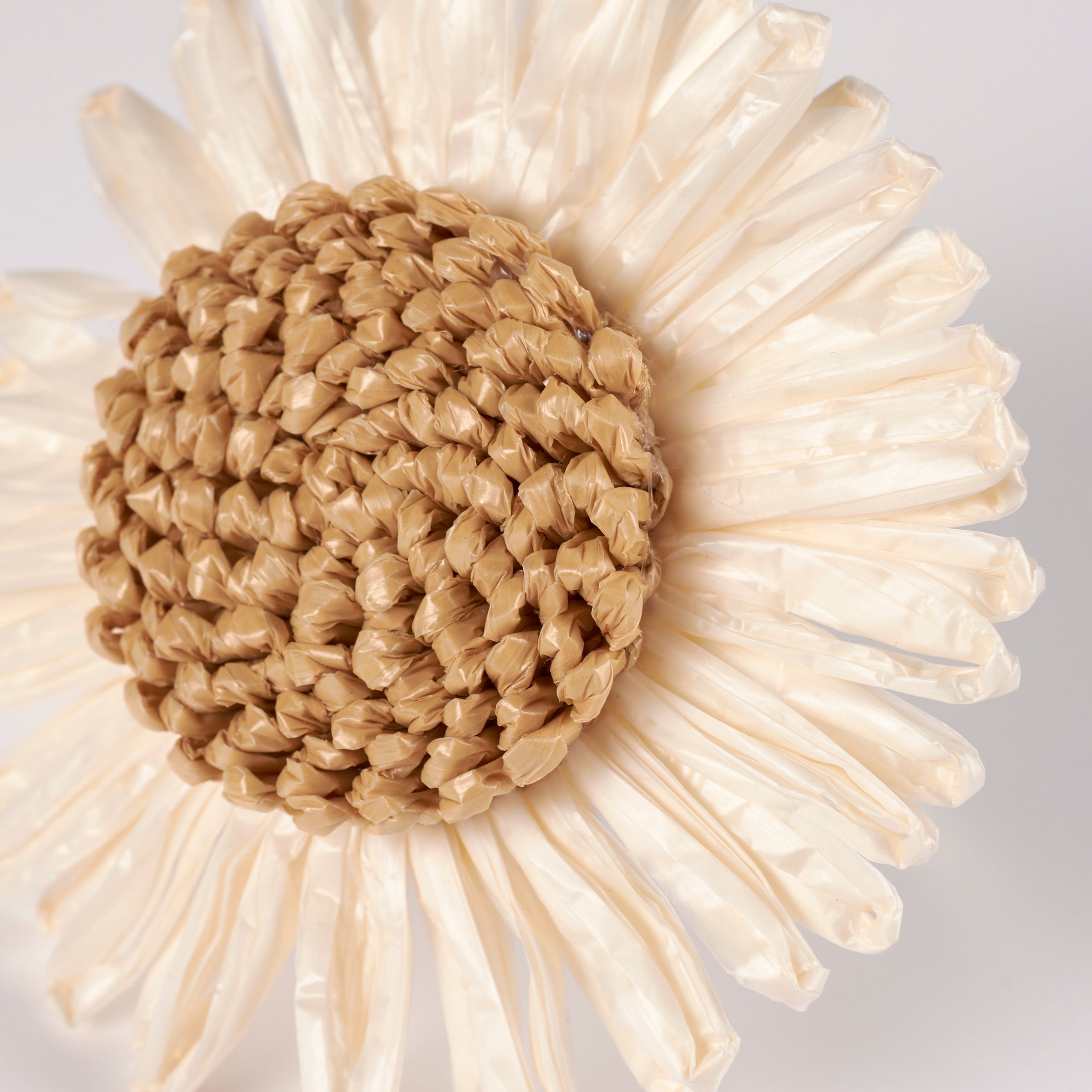 A decorative napkin ring from our Garden Collection featuring a craft style design of a daisy head made with woven raffia. Our Daisy napkin ring includes a metal ring to easily slip over rolled napkin and, when not in use, can be added to table setting as table décor. Napkin pictured not included. A charming tabletop accessory perfect for spring-themed tablescapes.