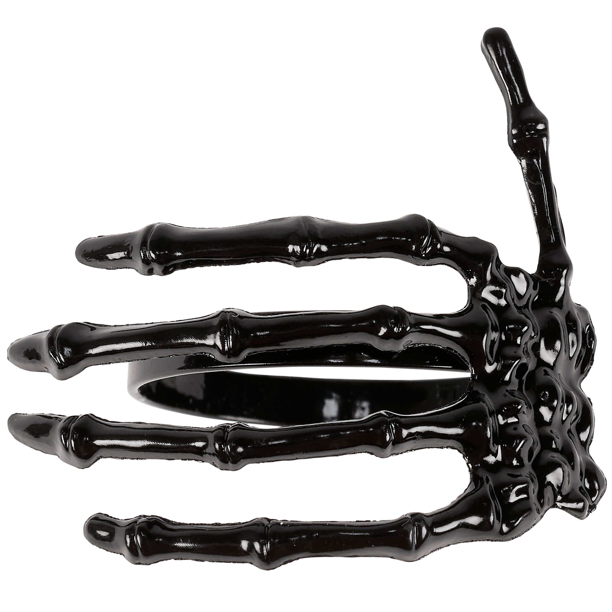 A metal napkin ring from our Halloween Collection featuring a sculpted skeleton hand in glossy black color. Our Skeleton Hand napkin ring is attached to black metal ring that easily slips over rolled napkin and, when not in use, can be added to table setting as table décor. Napkin pictured not included. A fun tabletop accessory perfect for seasonal tablescapes.