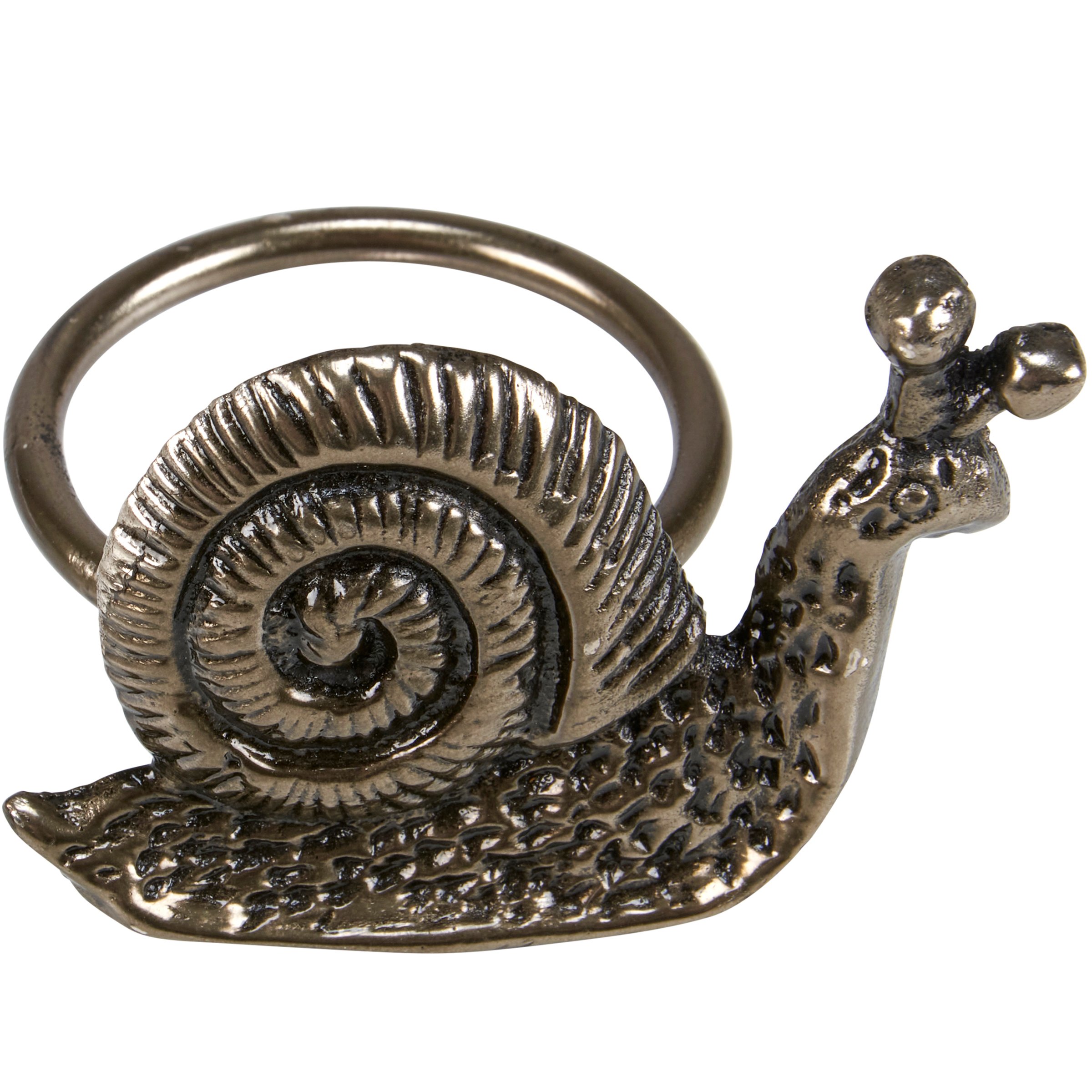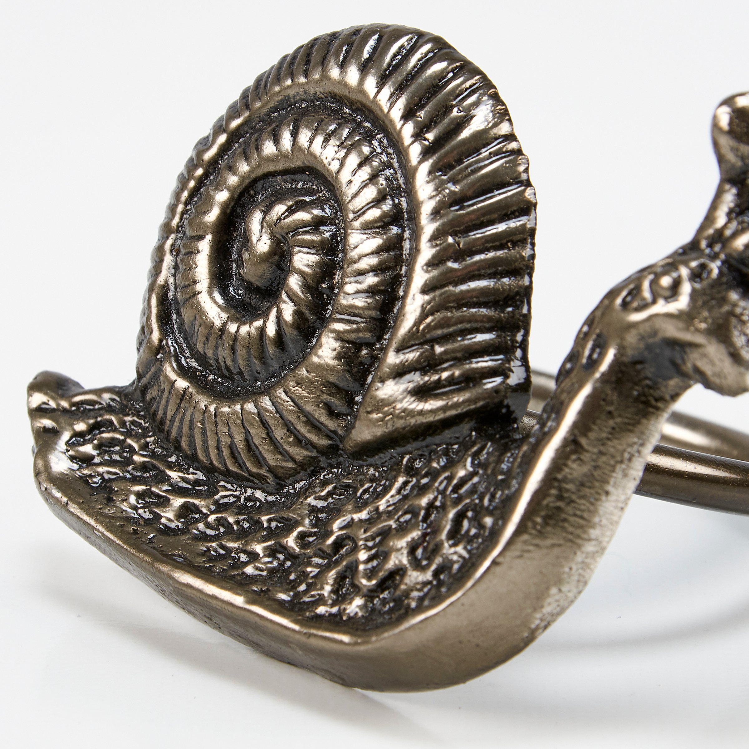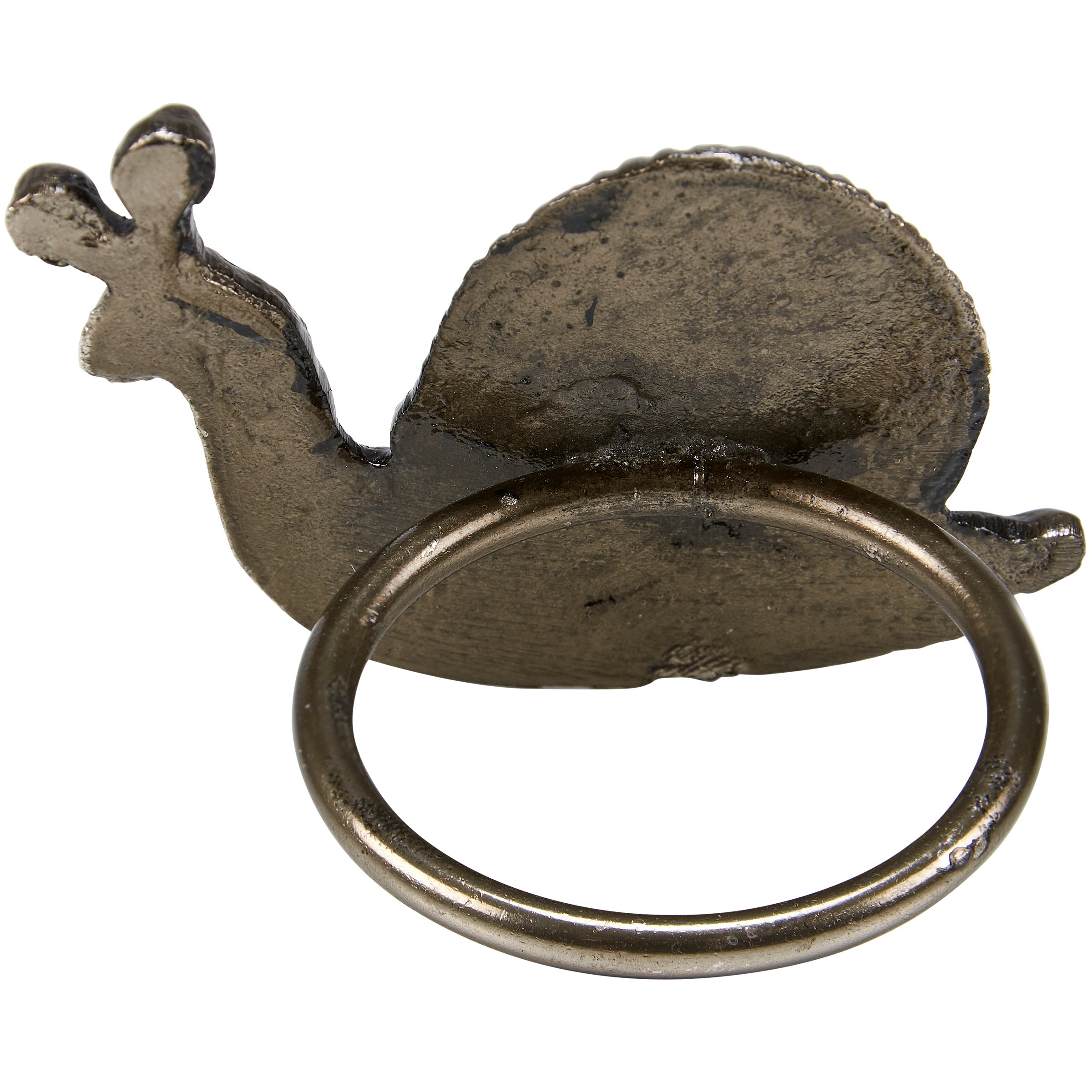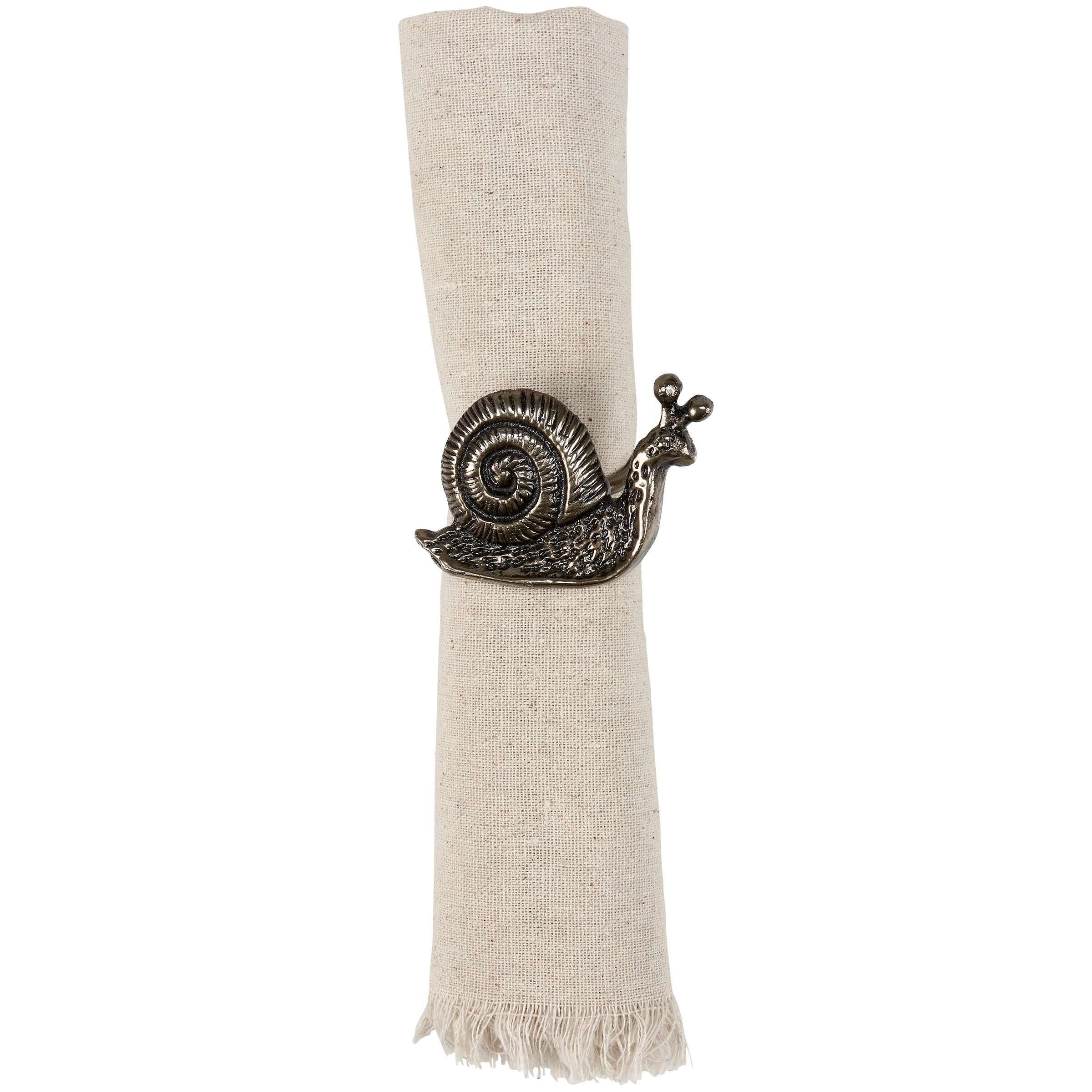 A metal napkin ring from our Cottagecore Collection featuring a detailed snail design with an antique metal appearance. Our Snail napkin ring includes attached metal ring that easily slips over rolled napkin and can be added to table setting when not in use as a rustic accent. Napkin pictured not included. A rustic tabletop accessory perfect for everyday gatherings.