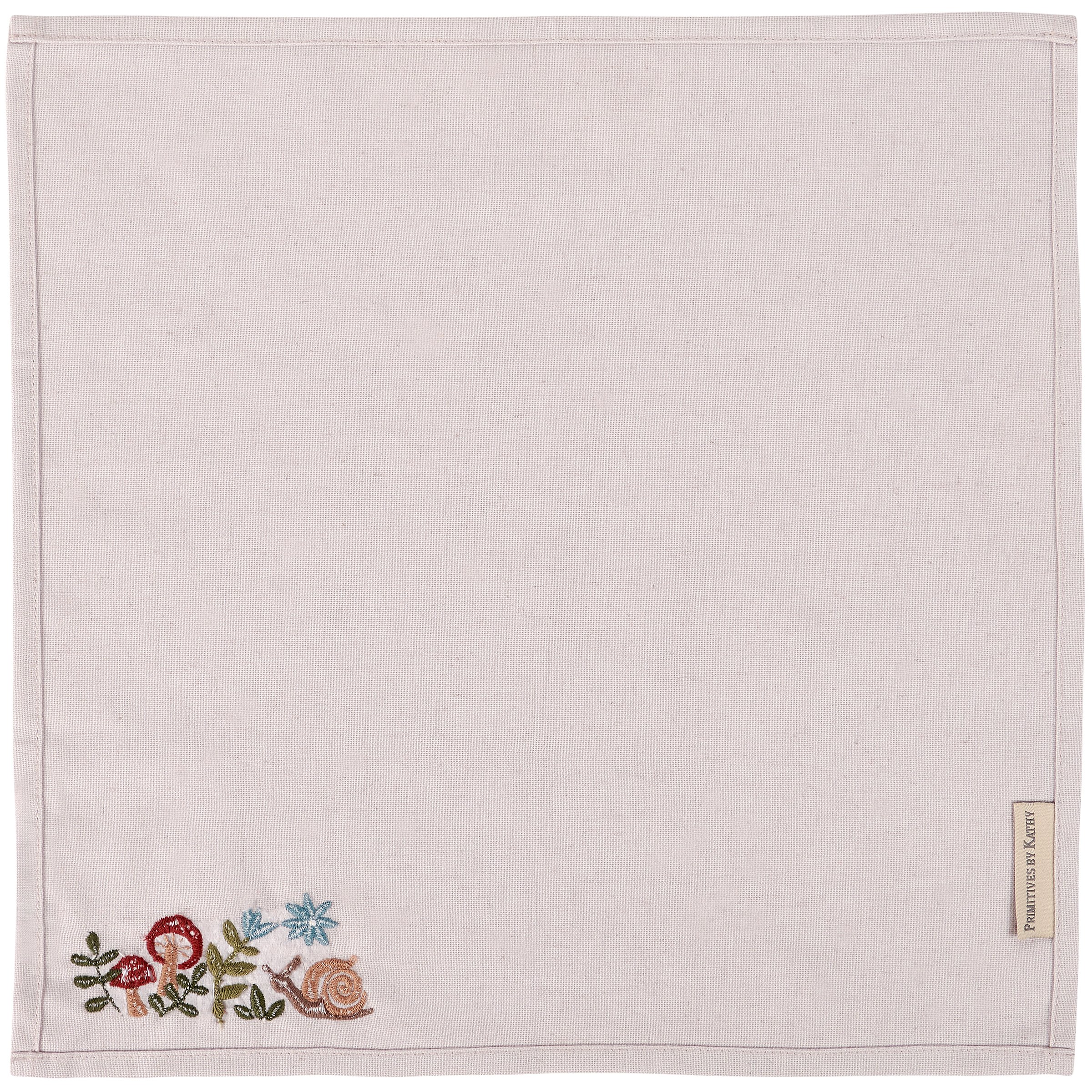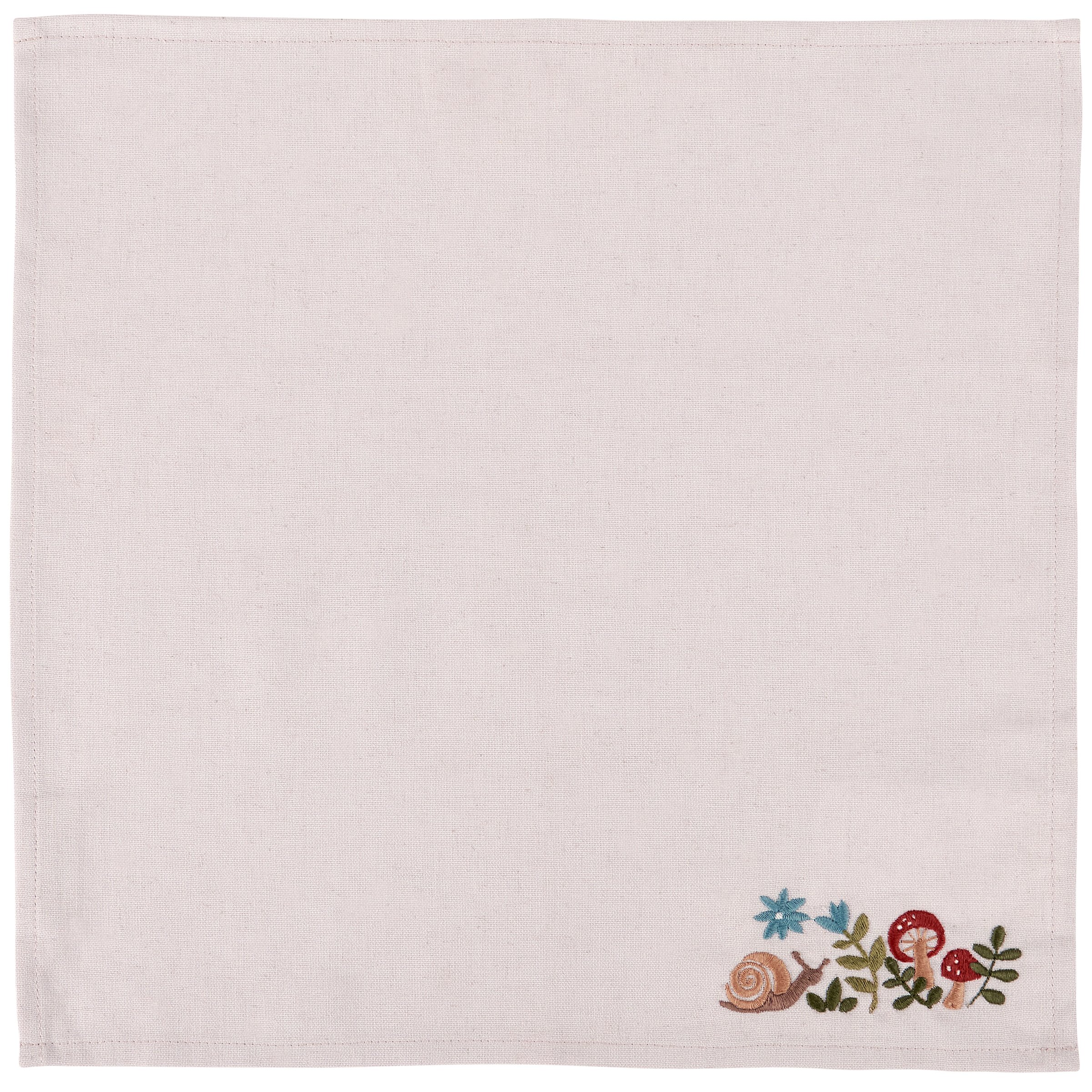 A set of cotton-linen blend napkins from our Cottagecore Collection each displaying an embroidered design of a snail and mushrooms. Our Snail & Mushroom napkin set includes four identical napkins that are conveniently machine-washable for easy cleaning and reuse. Rustic reusable napkins are wrapped together with tied jute. A set of rustic tabletop accessories perfect for nature-themed tablescapes.