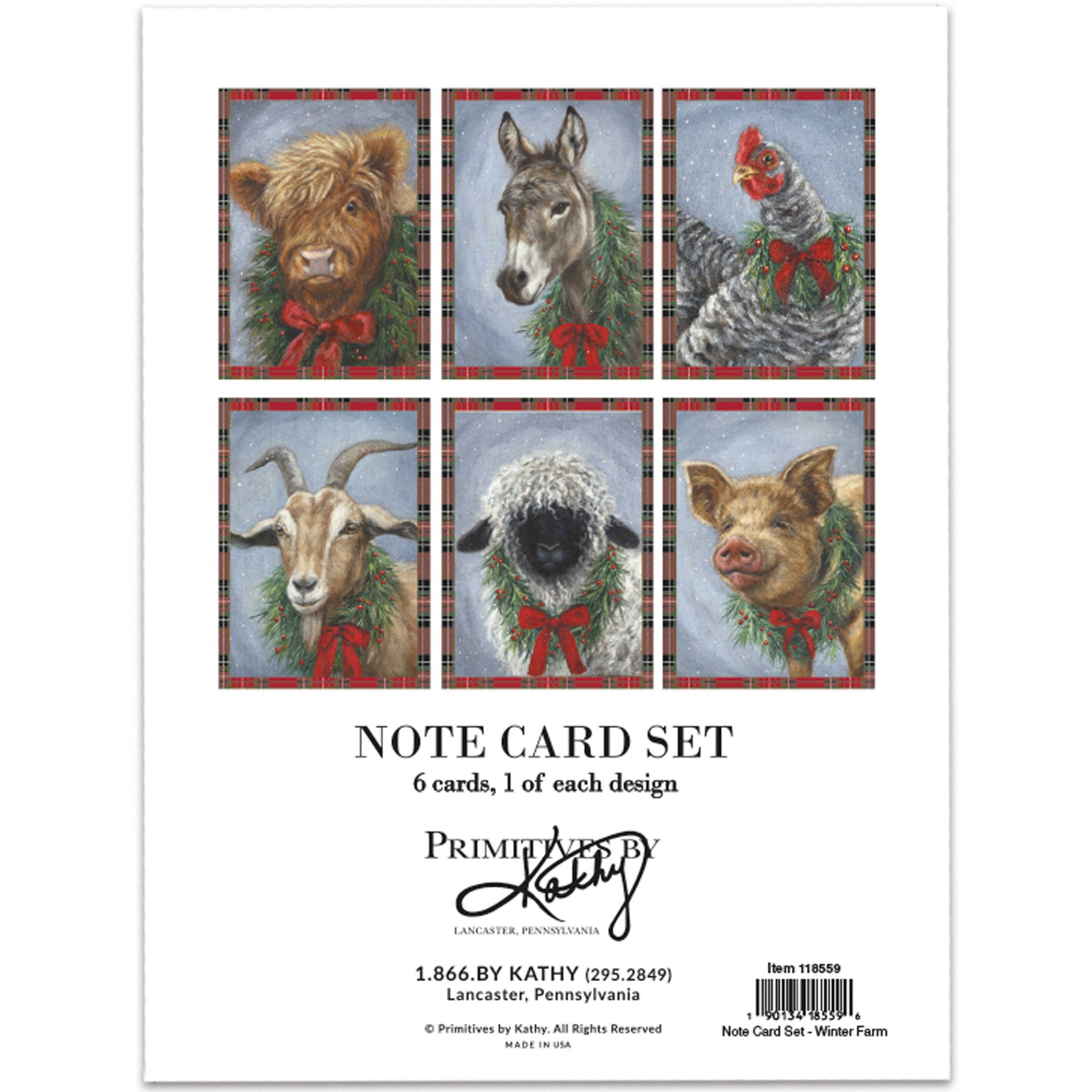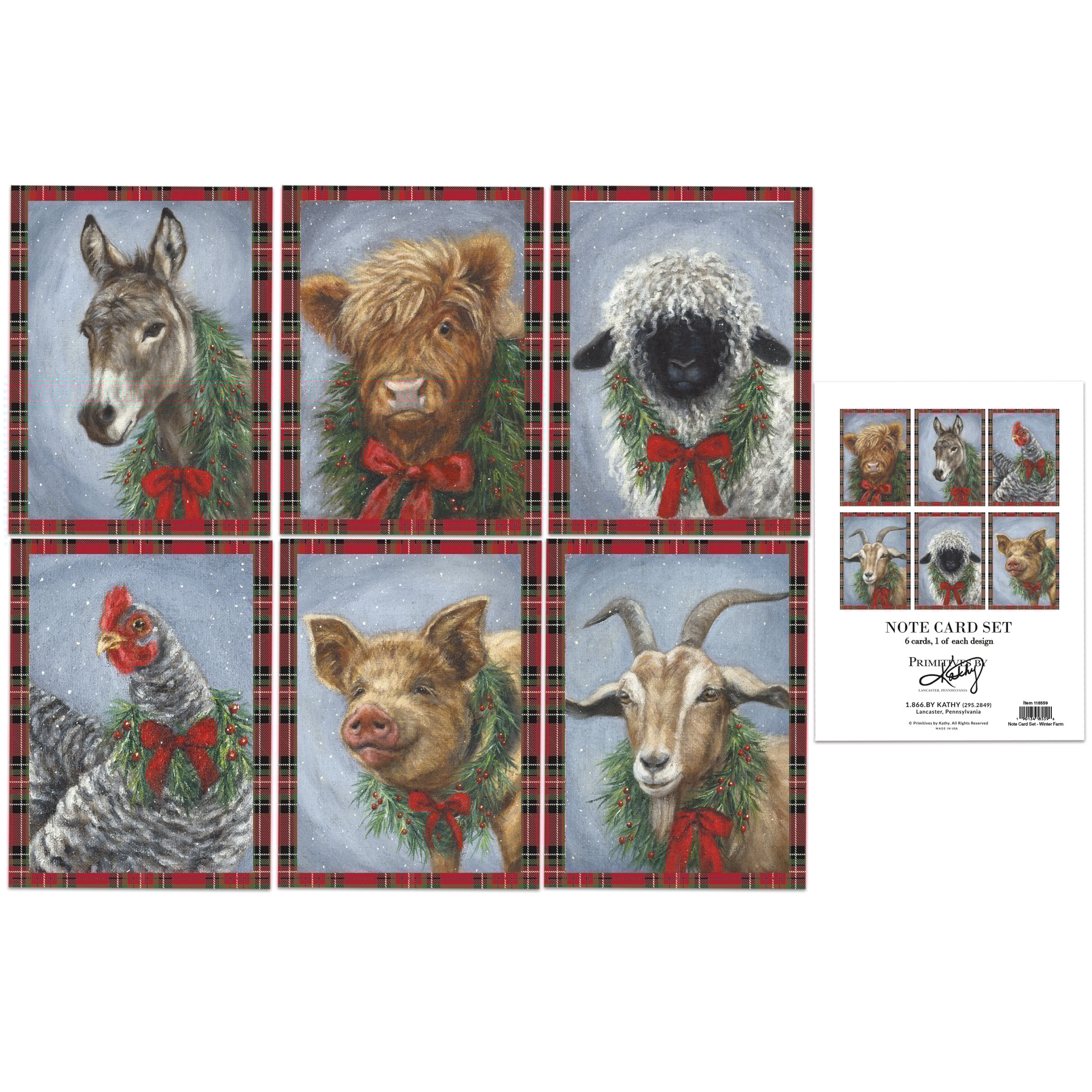 A note card set from our Christmas Collection displaying charming winter scenes of farm animals wearing Christmas wreaths. Designs are replicated from original artwork painted onto burlap canvas, giving the art a unique depth and texture. Seasonal note card set includes 6 blank cards and envelopes with one of each individual design. Cards are sealed in polybag with card back displaying all designs. Our Christmas Animal note card set is proudly made in the USA. A Christmas-themed note card set perfect for seasonal moments.