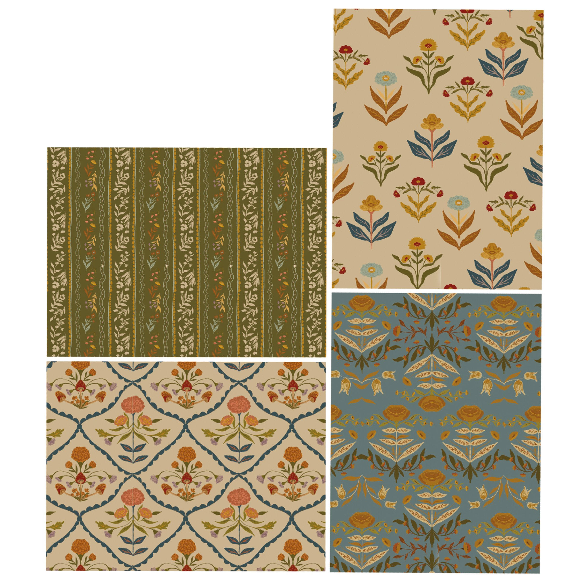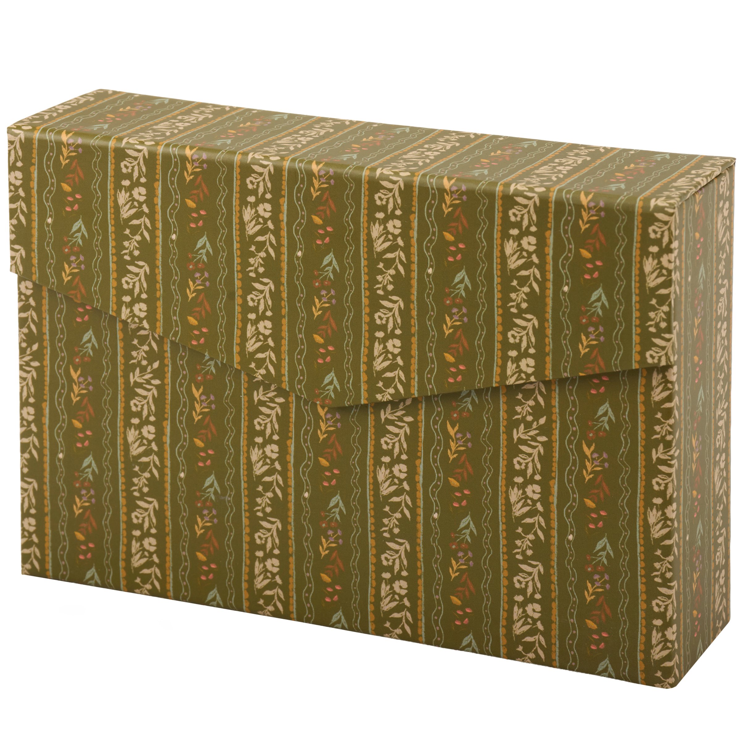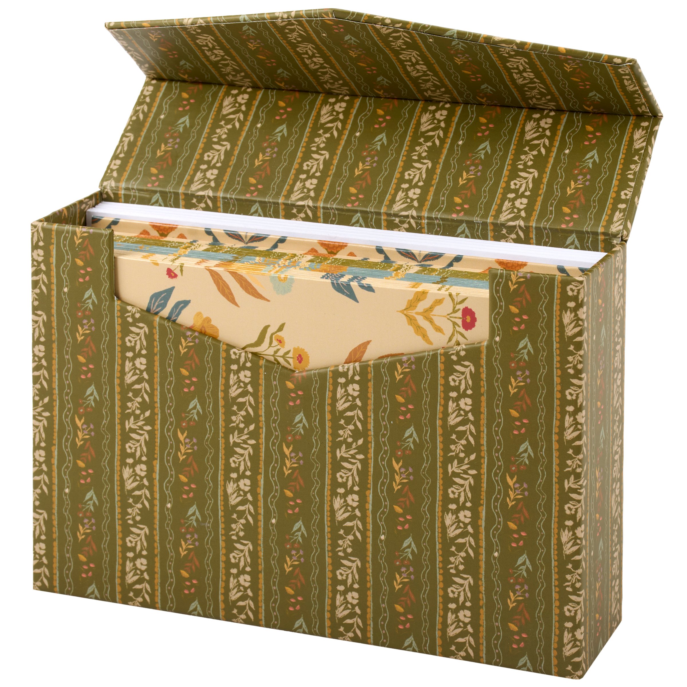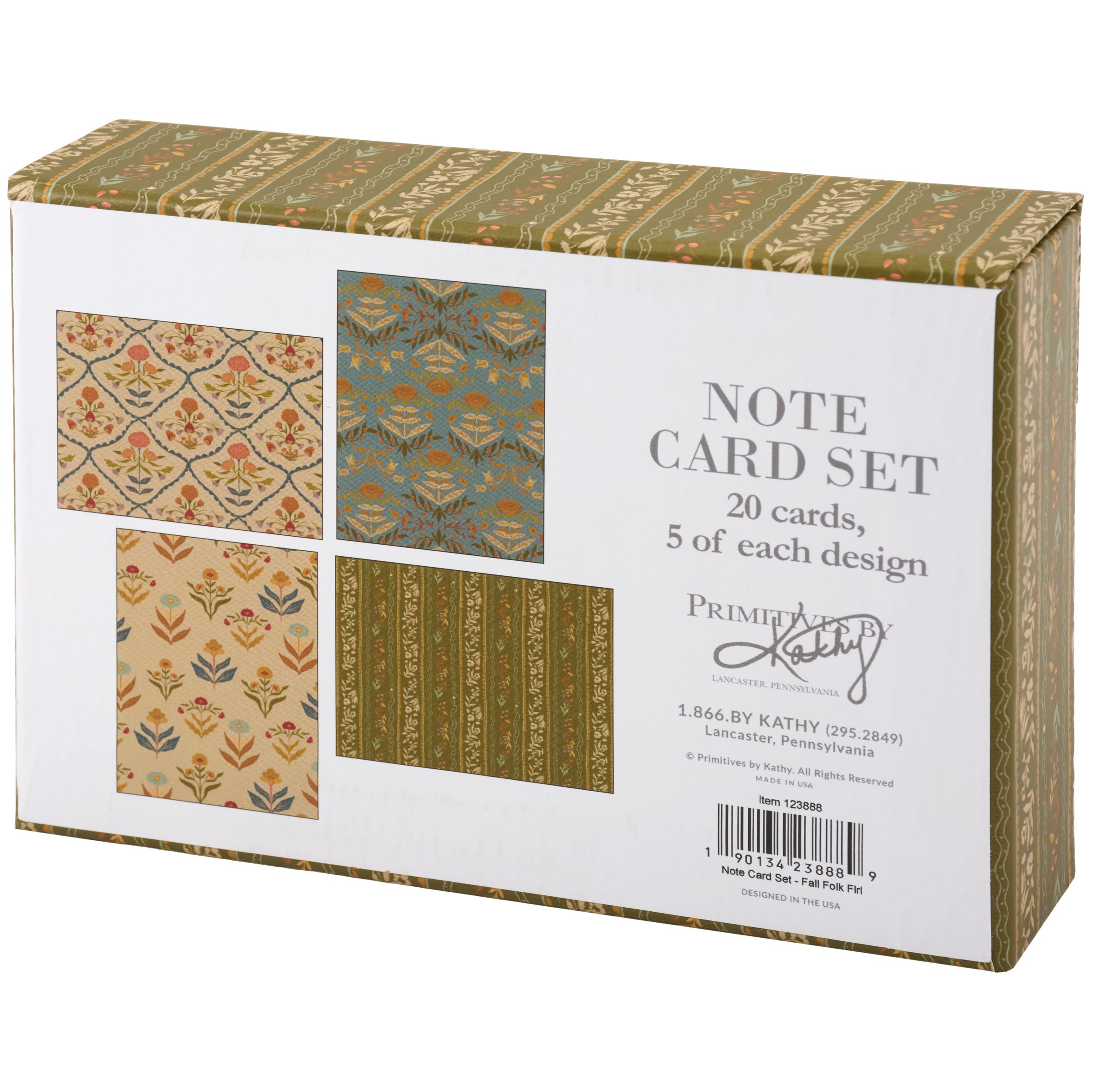A note card set from our Fall & Harvest Collection featuring various designs of folk art inspired fall floral patterns replicated from original art hand painted in a unique watercolor style. This fall floral note card set includes 20 blank cards with 5 of each design as well as envelopes for each card. Our Fall Folk Floral note card set is packaged in a high-quality decorative storage box with card designs displayed on the back making it great for gifting as well as storing on the shelf. A folk art fall note card set perfect for seasonal moments.