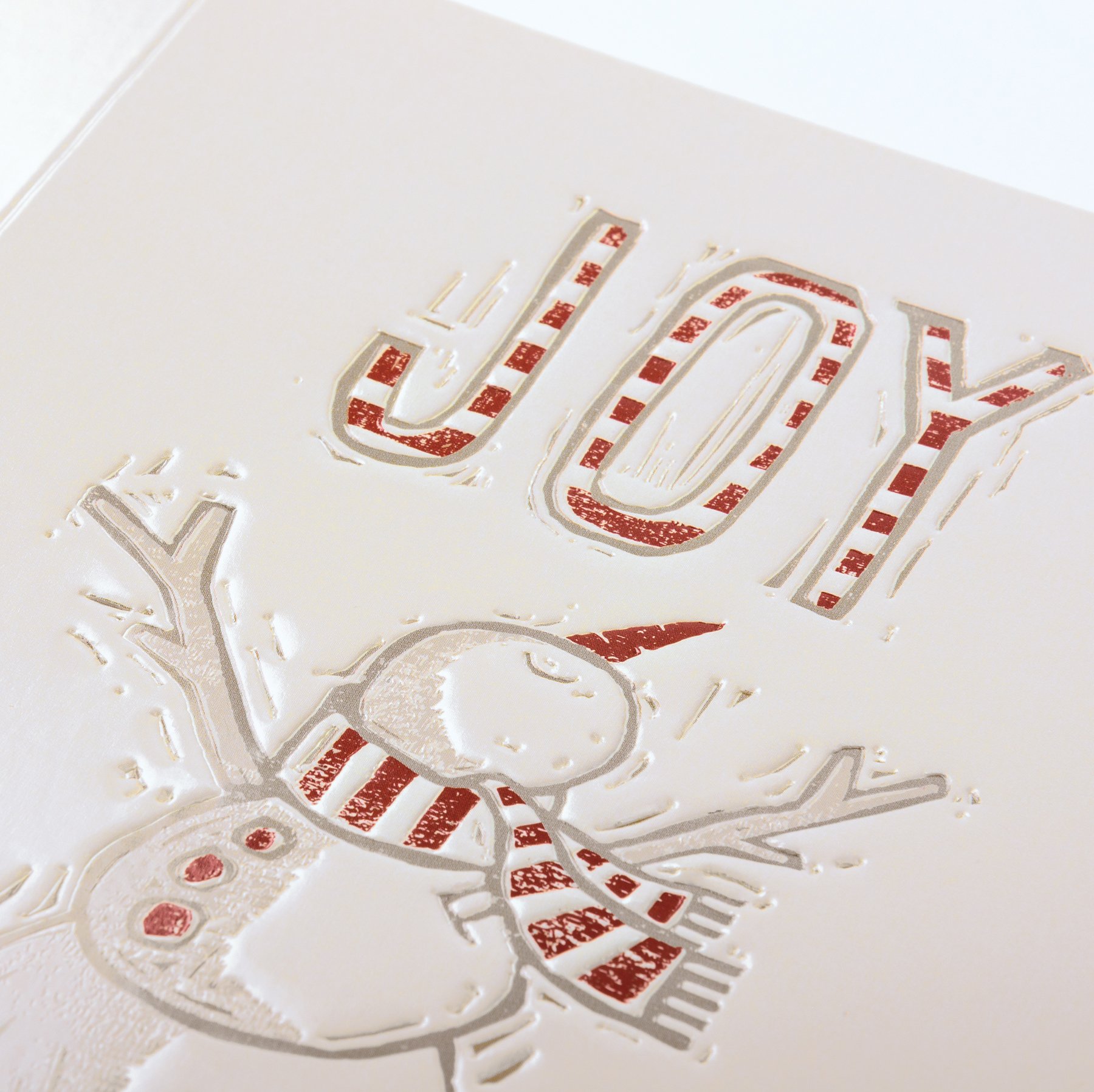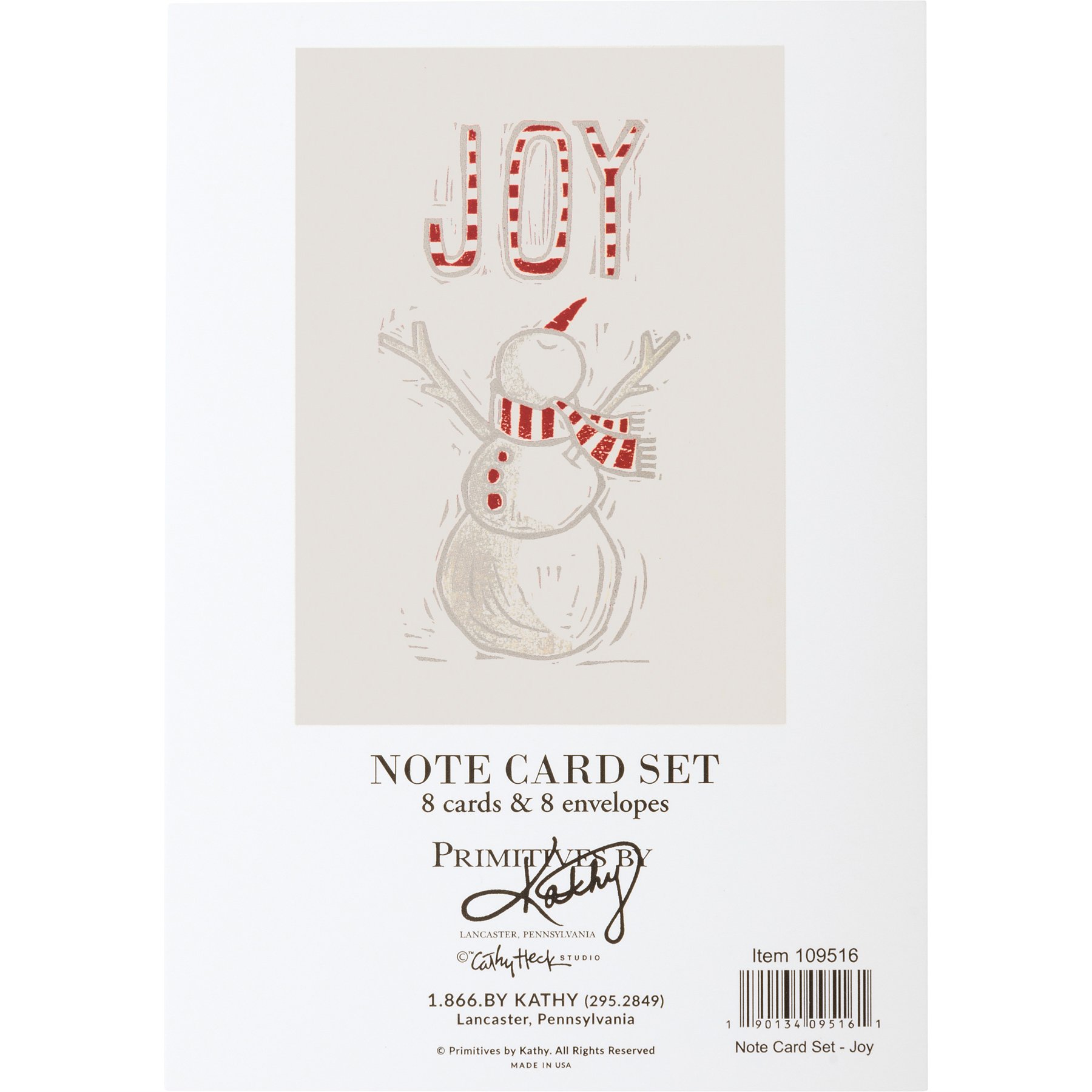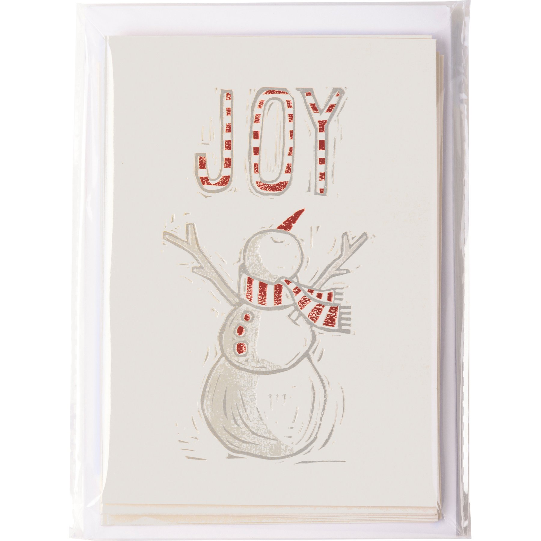 A set of eight notecards featuring rustic block print snowman design and "JOY" sentiment. Cards come in sealed polybag with backer card featuring all designs. Bag features top cutout for easy hanging. Includes eight envelopes.