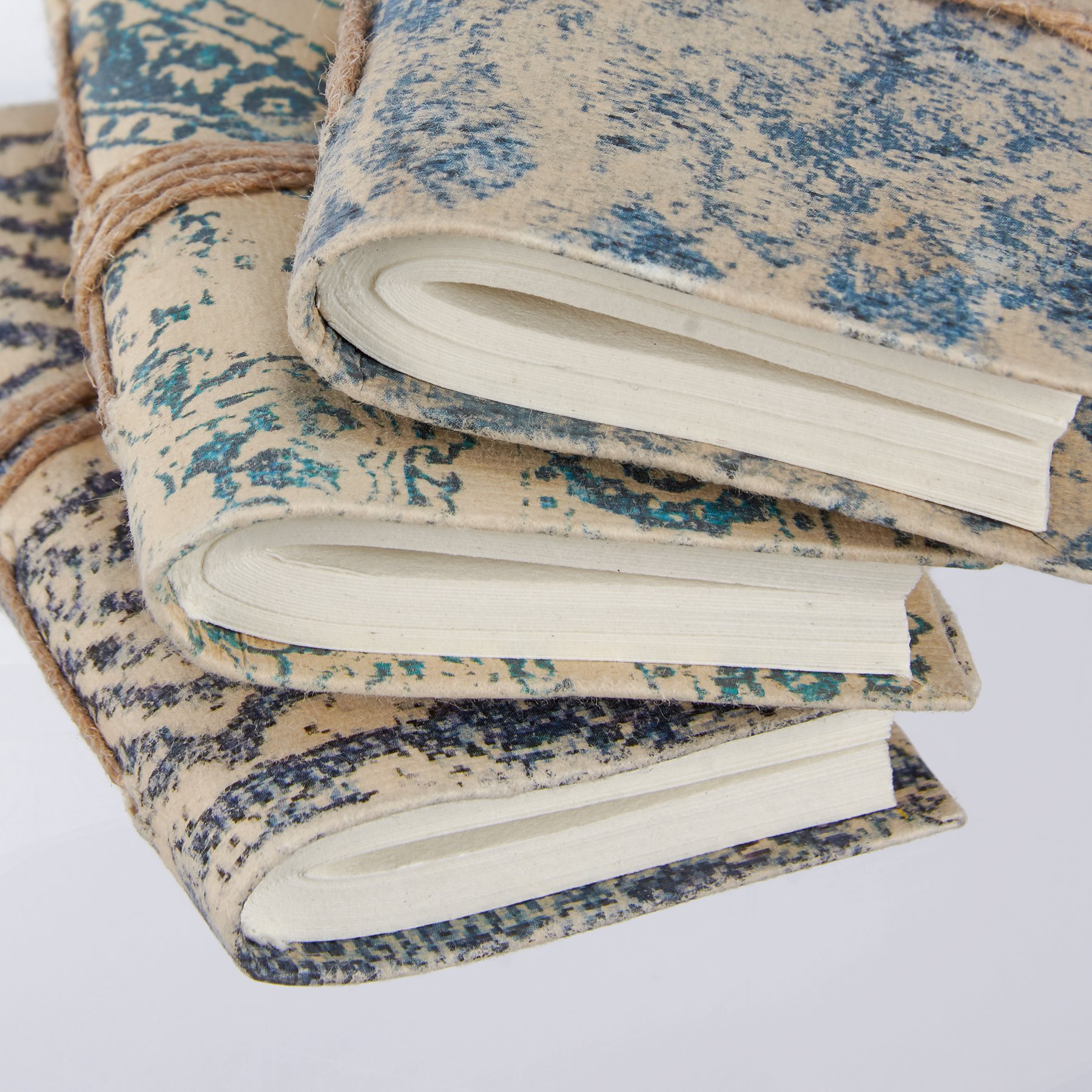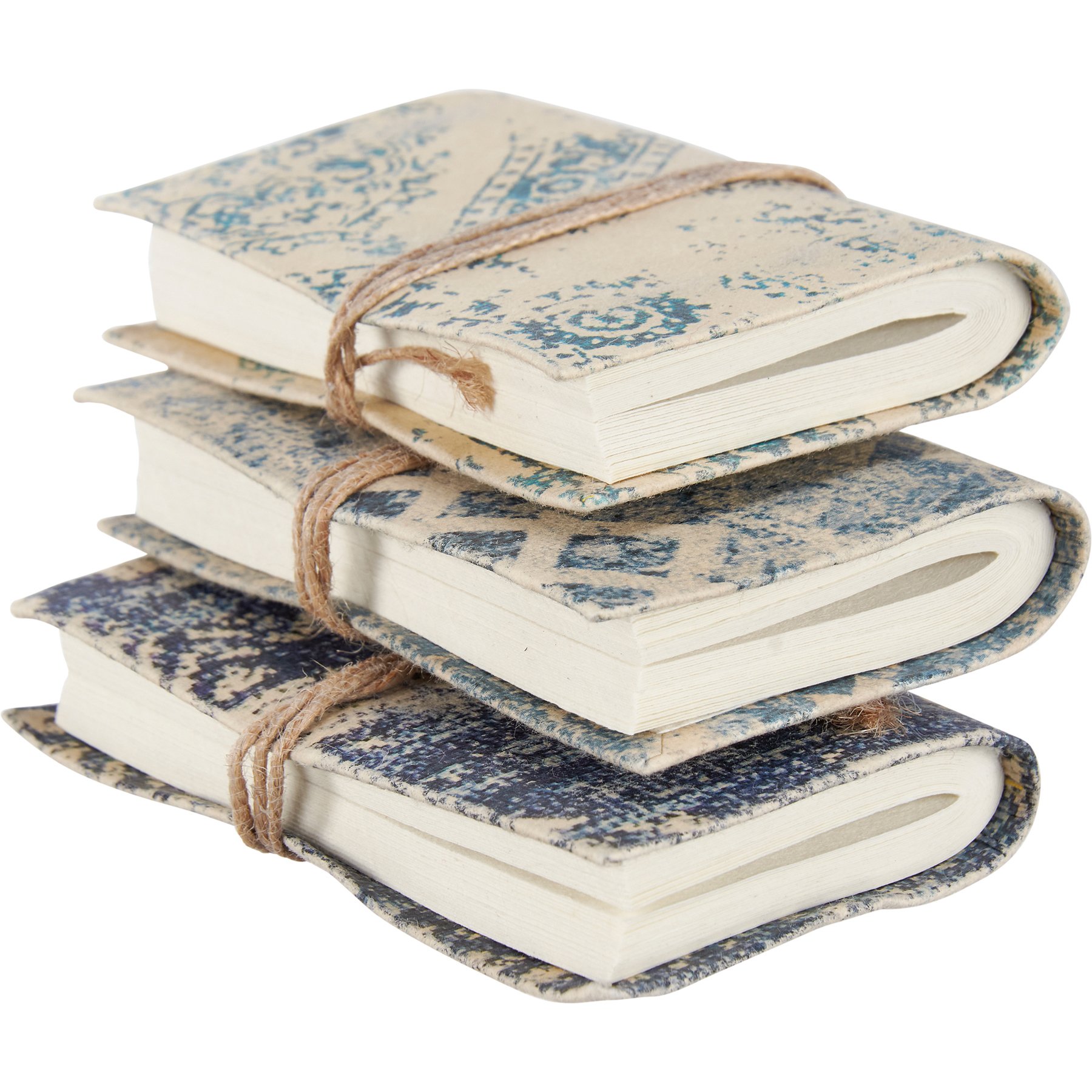 A set of three decorative mini notebooks from our Indigo Collection displaying individual indigo designs on a textured paper cover. Each notebook contains 96 unlined pages to pen anything that is desired. Our Indigo notebook mini set includes wrap-around jute tie closures to keep each secure. Set comes packaged stacked and wrapped with cotton tape. A decorative and functional everyday home accent perfect for any home office or desk.