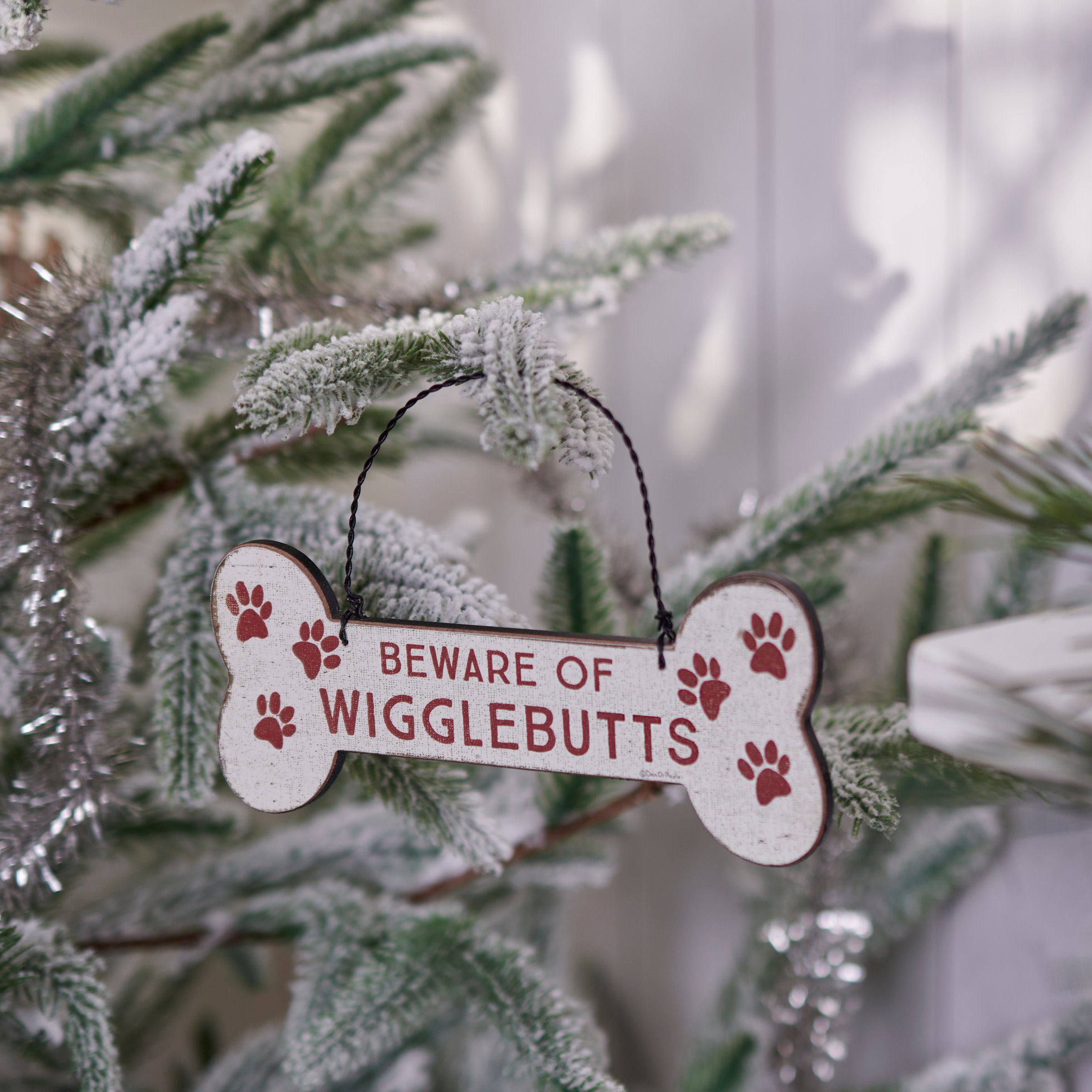 A wooden ornament from our Holiday Pet Collection/ featuring a dog bone cutout shape and pet inspired design in a rustic style. Design displays paw prints with a fun pet-themed sentiment that reads "Beware Of Wigglebutts." Pet ornament also features distressed details with coordinating black color on the sides and back. Our Beware Of Wigglebutts ornament is easy to hang for display via attached twisted wire hanger. A fun pet-themed ornament perfect for everyday display.