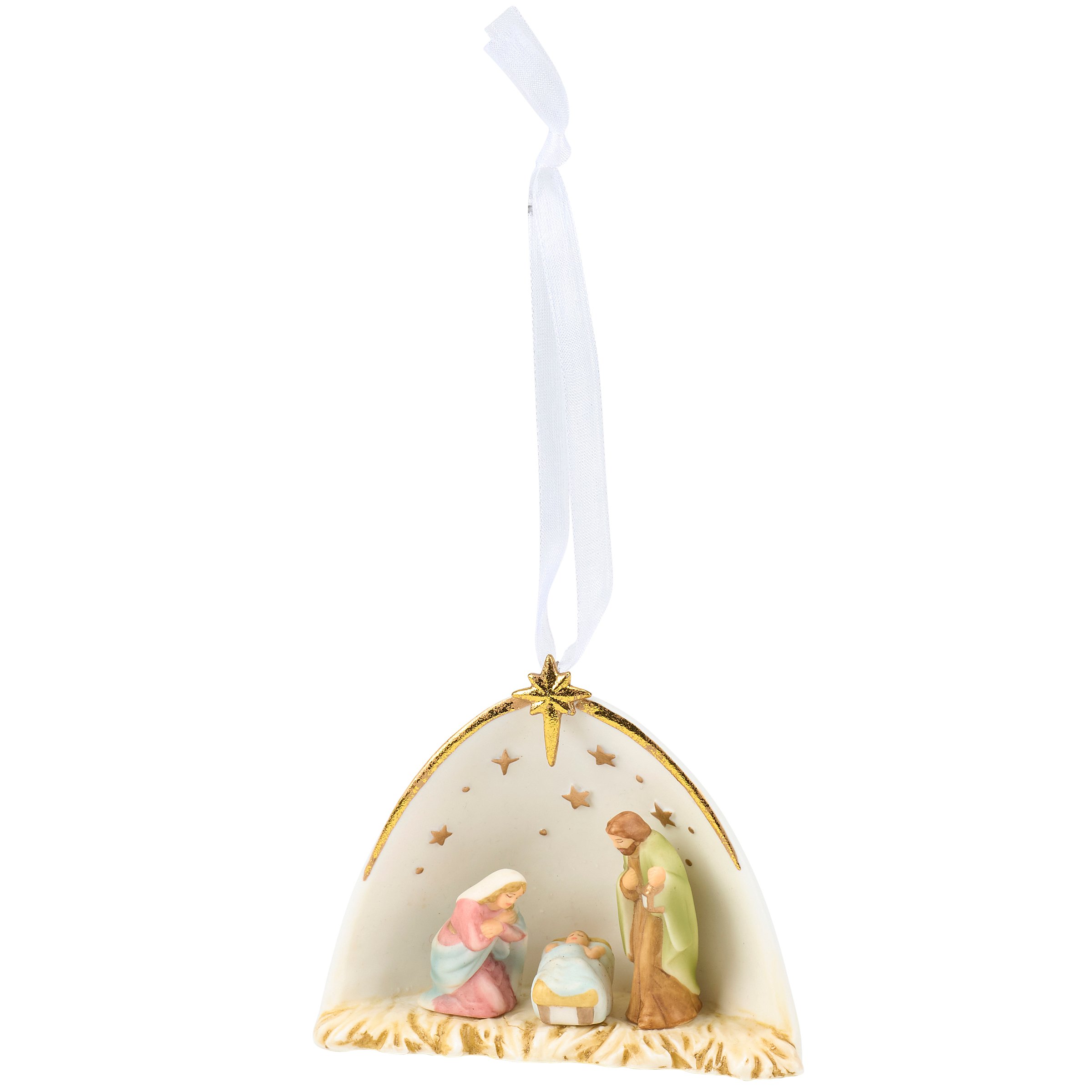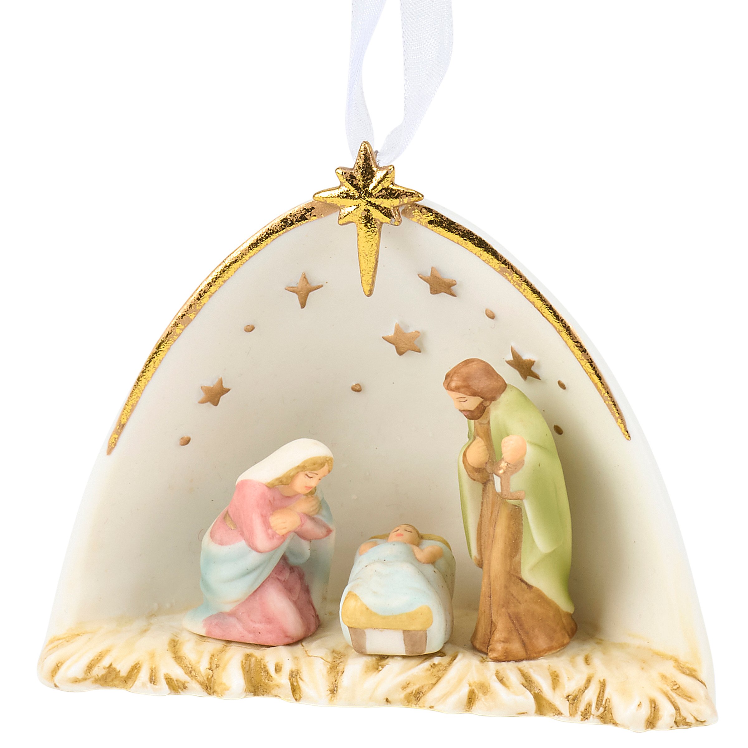 A porcelain ornament from our Christmas Collection displaying a sculpted nativity scene with painted details and metallic gold accents. Our Ceramic Nativity ornament is ready to hang for display via the attached hanger. A nativity themed Christmas home accent perfect for seasonal display.