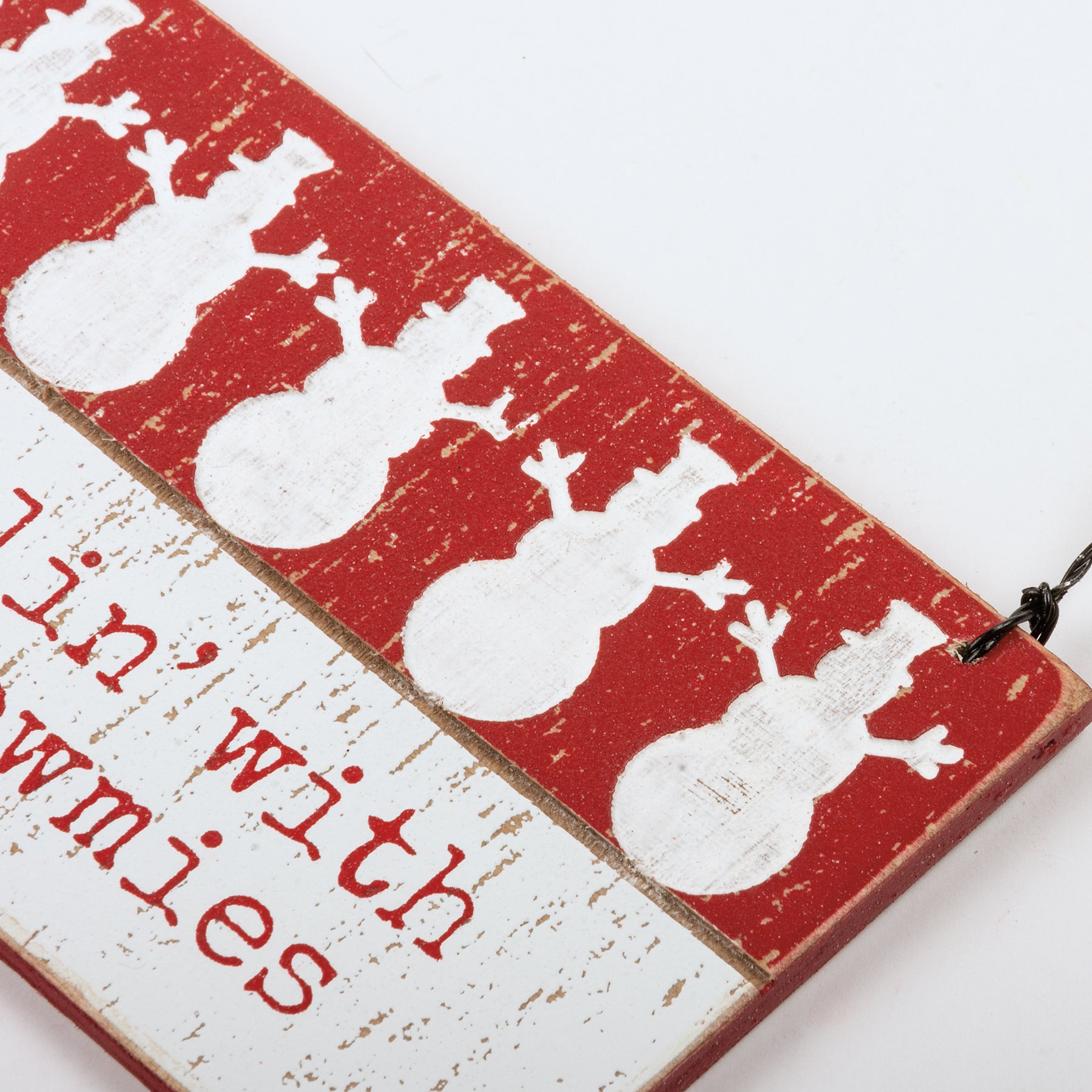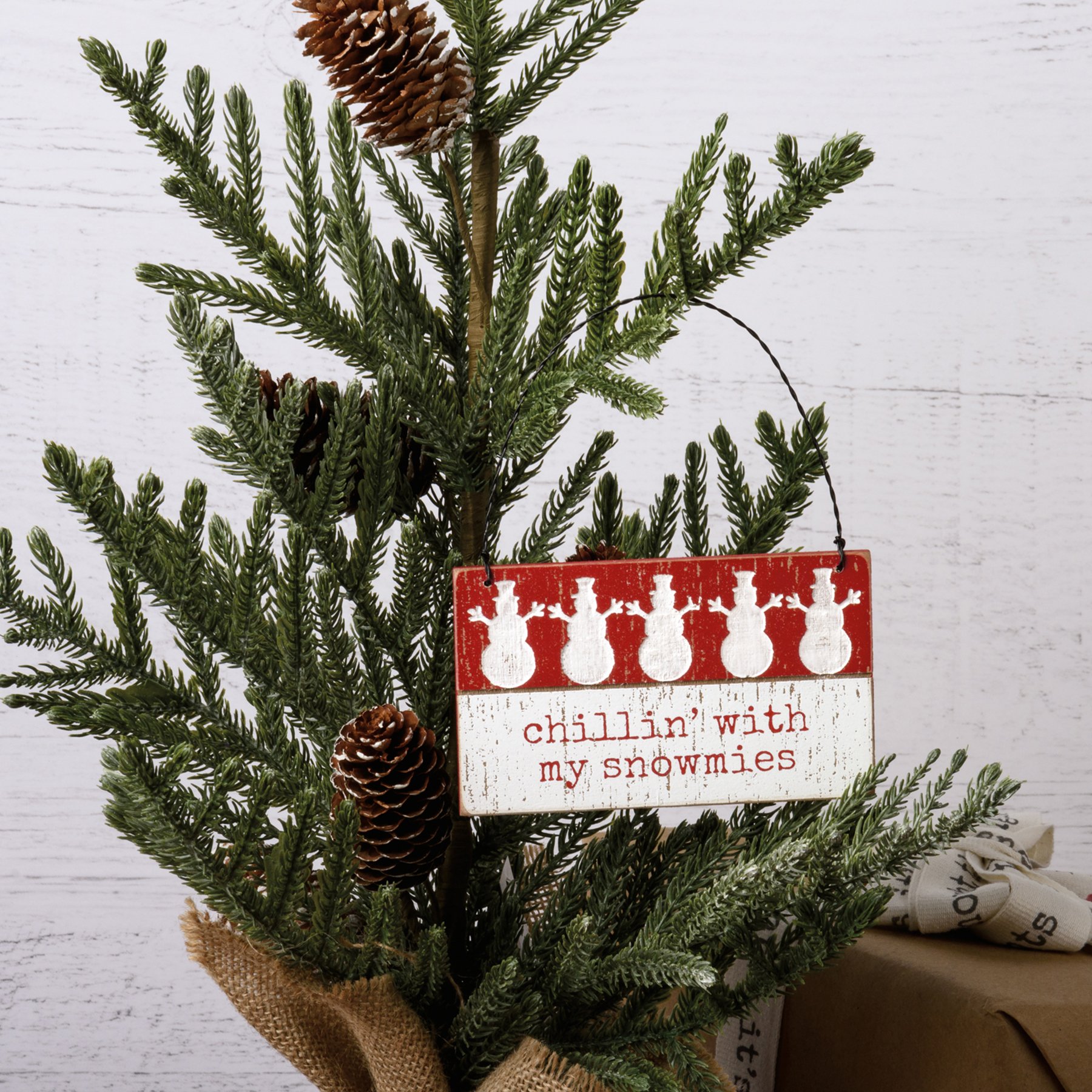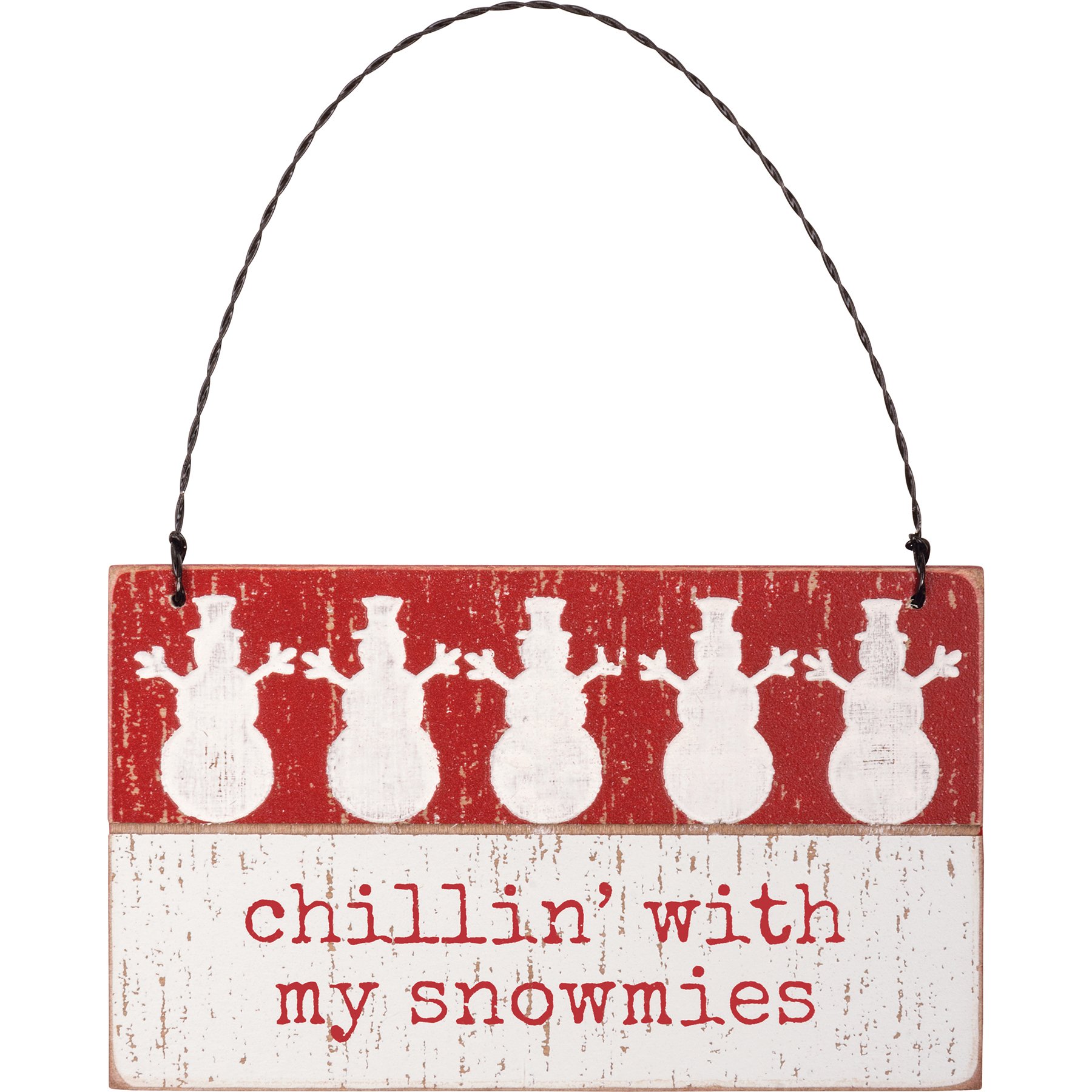 A rustic slat wood Christmas ornament featuring a typeset "Chillin' With My Snowmies" sentiment with debossed snowmen designs. Our Snowmies Christmas ornament easily hangs by twisted wire loop.