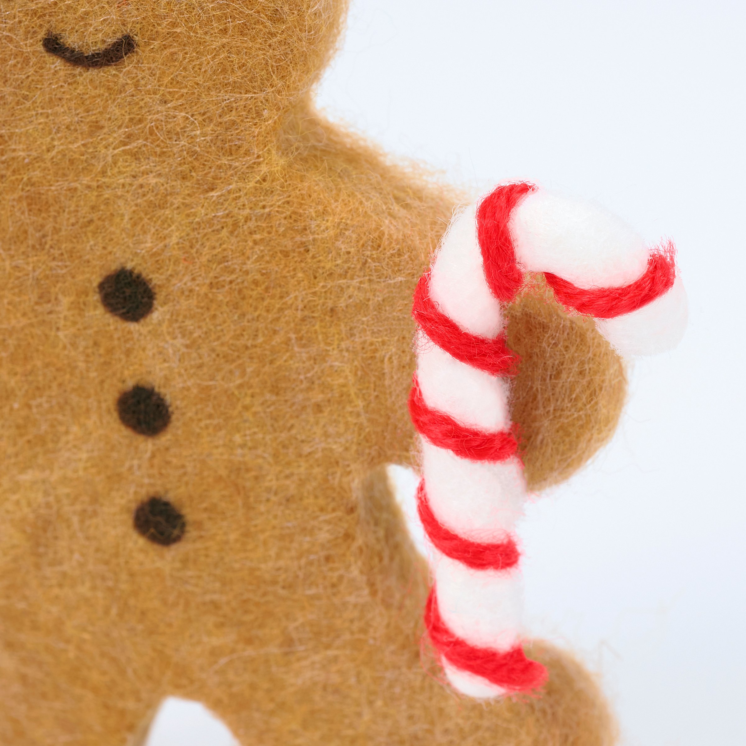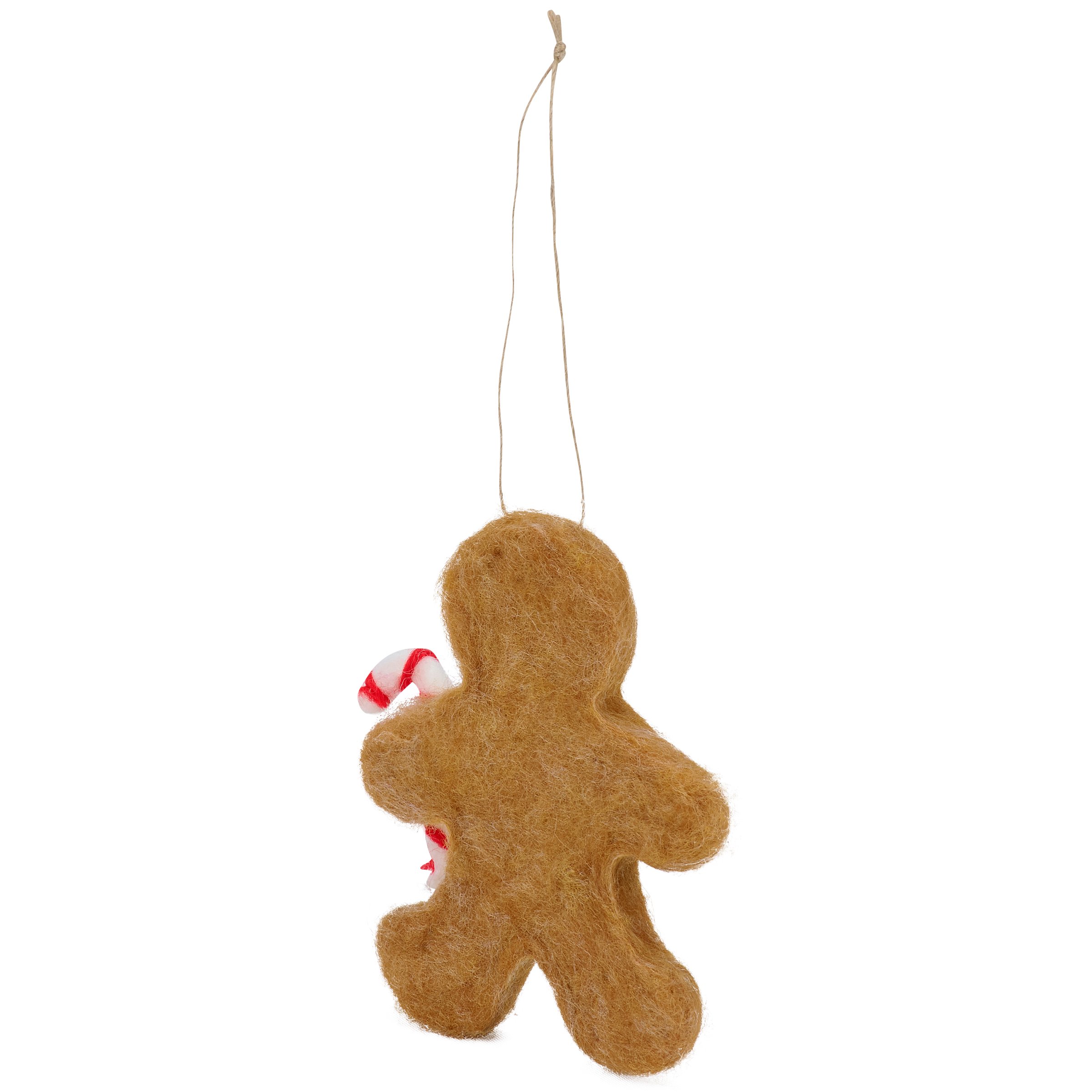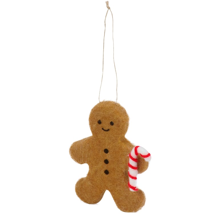 A decorative ornament from our Christmas Collection displaying a felt gingerbread man holding a candy cane. Our Gingerbread Candy Cane ornament is easy to hang for display via the attached string hanger. A fun gingerbread themed ornament perfect for seasonal decorating.