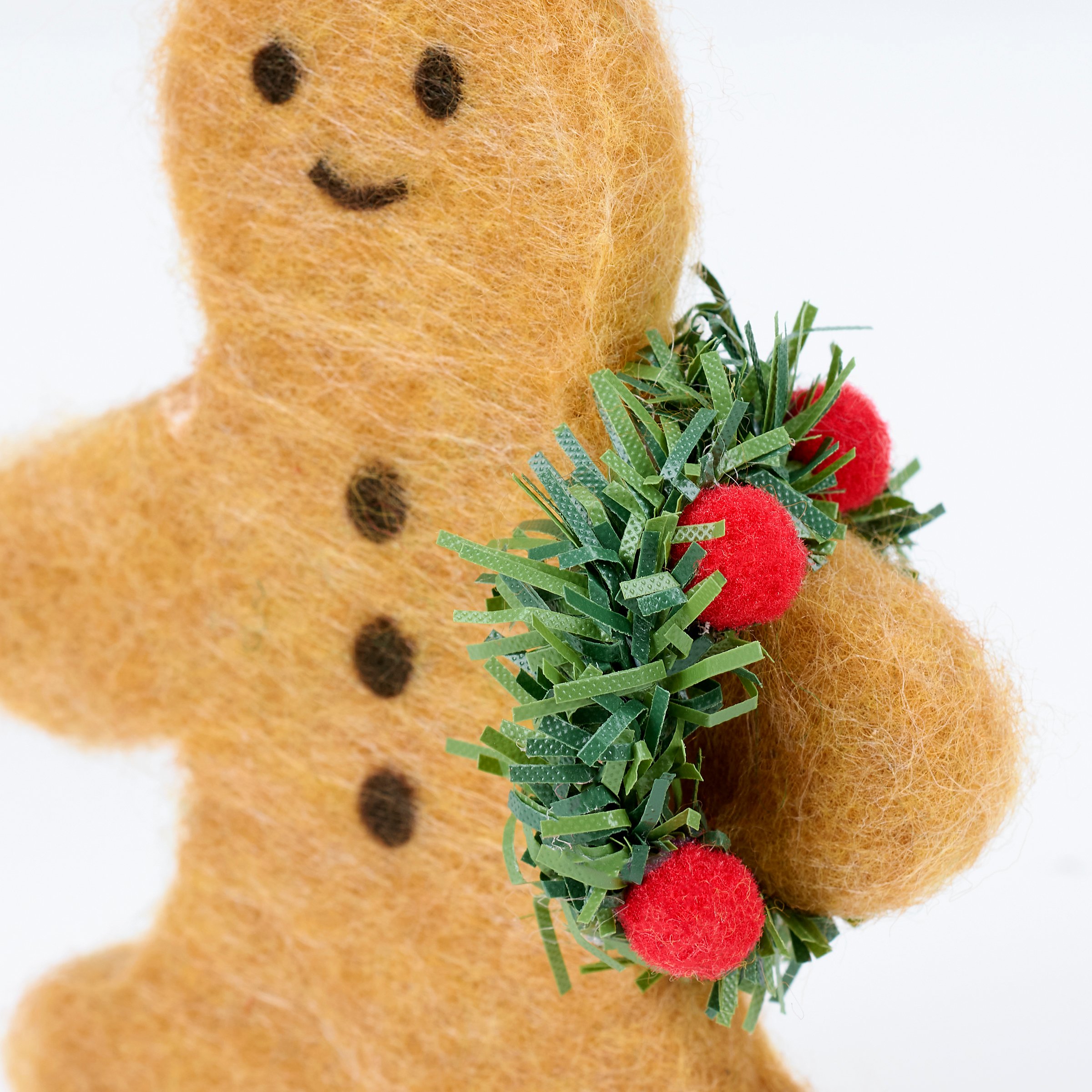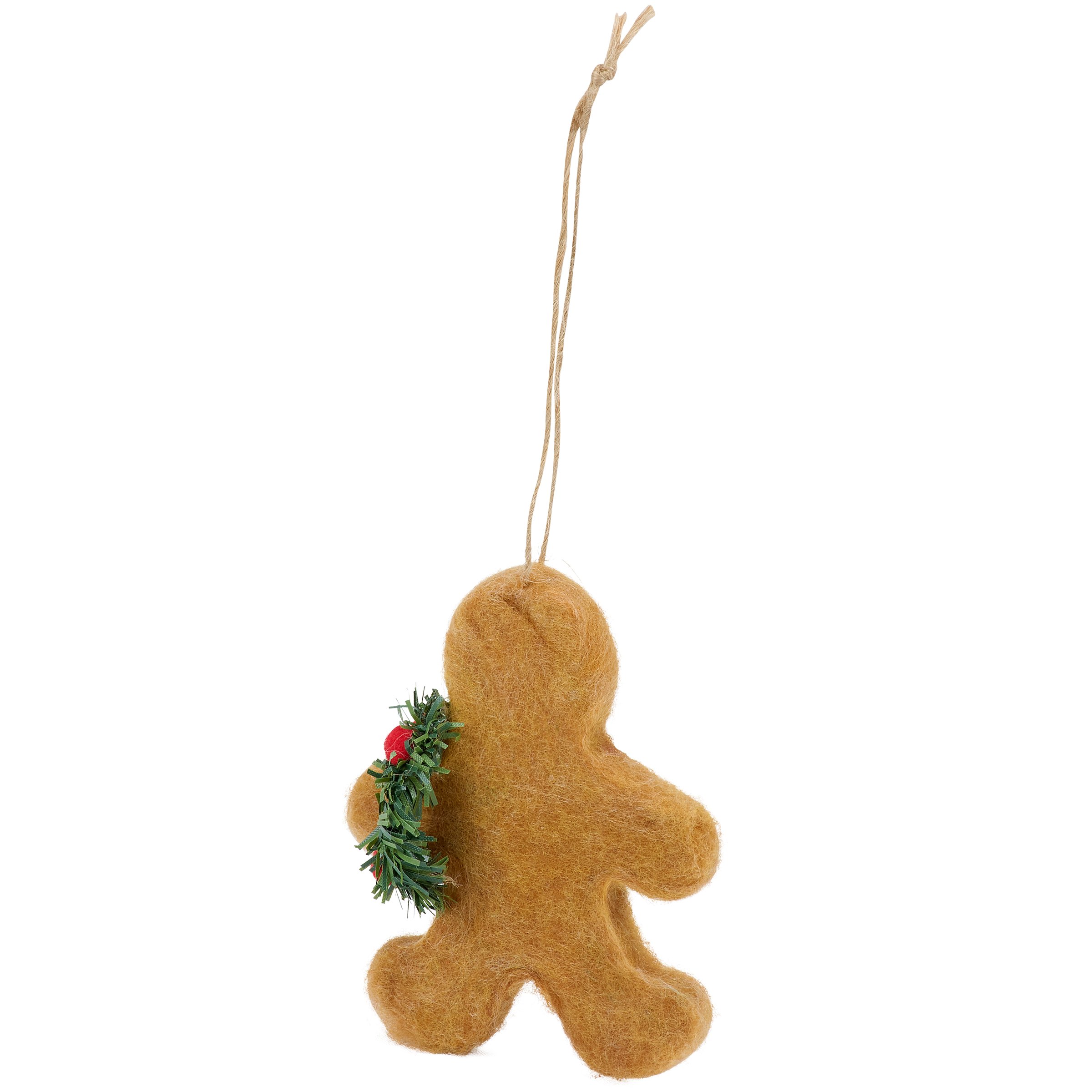 A decorative ornament from our Christmas Collection displaying a felt gingerbread man holding a holiday wreath. Our Gingerbread Wreath ornament is easy to hang for display via the attached string hanger. A fun gingerbread themed ornament perfect for seasonal decorating.